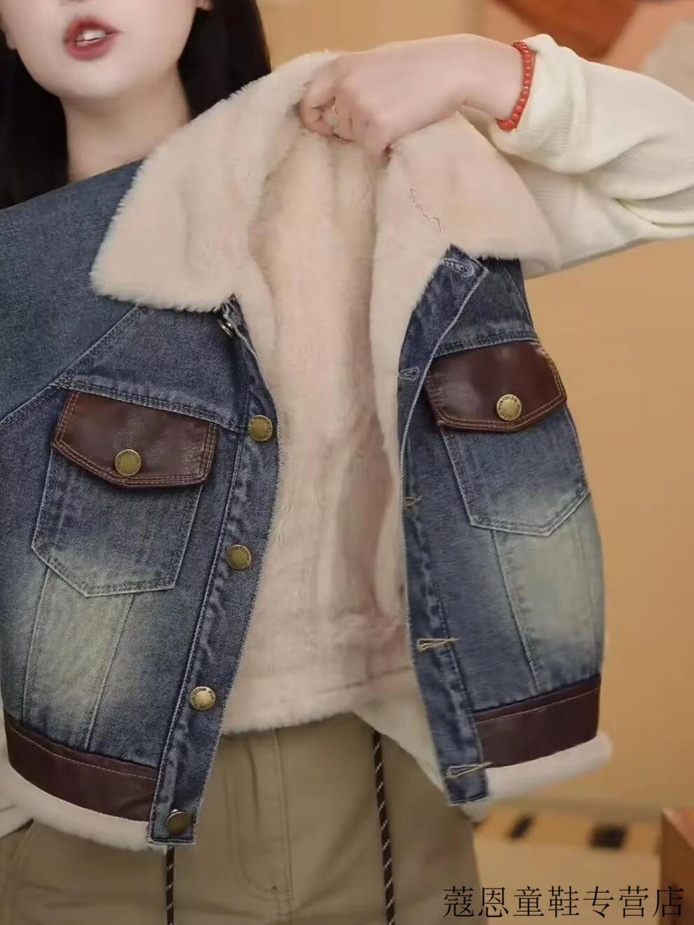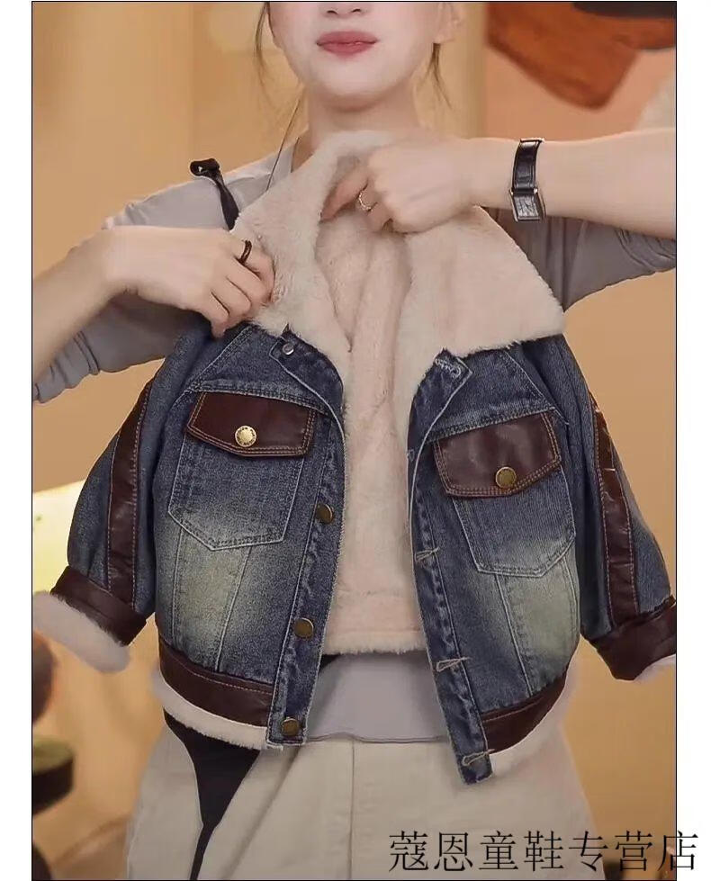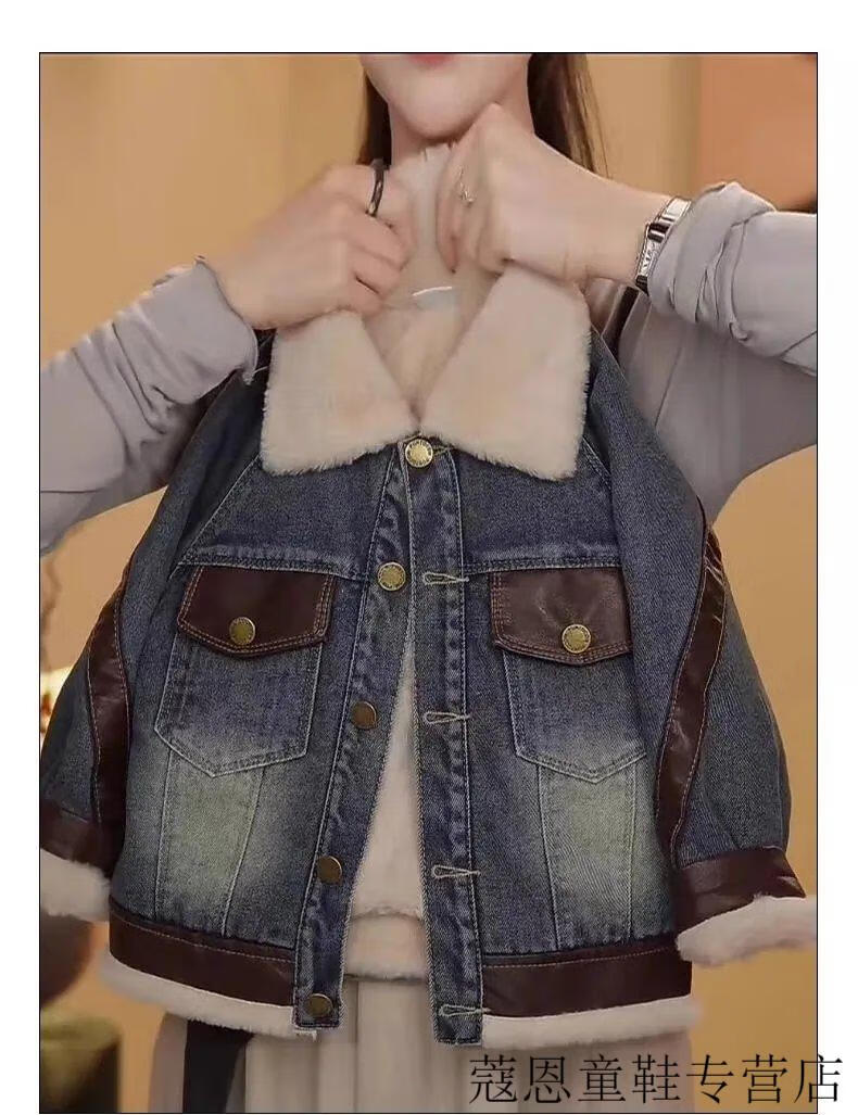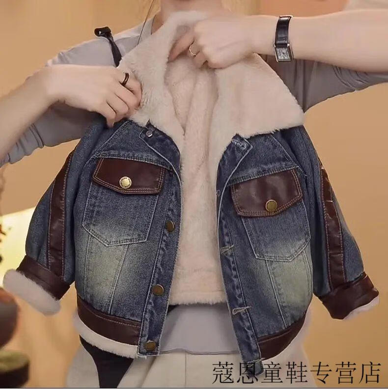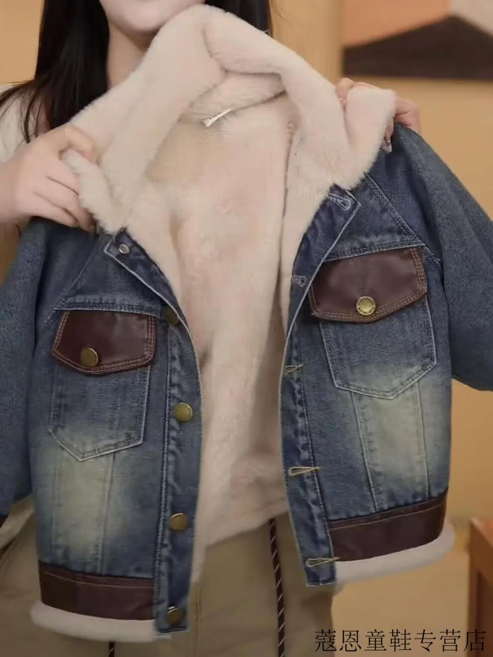 Disney (Disney) children's winter velvet denim jacket 2025 new boys' handsome and fashionable one-piece velvet thickened jacket top trendy denim jacket with leather 120
