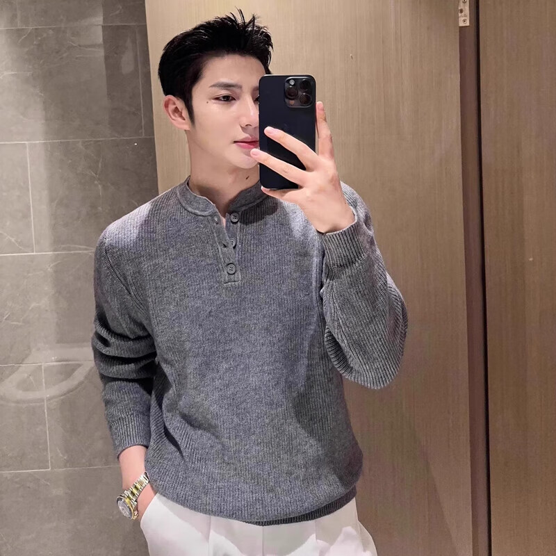 Kazuki Kuraishi's high-end Henley collar sweater for men in autumn and winter, light luxury casual solid color bottoming sweater, gray XL