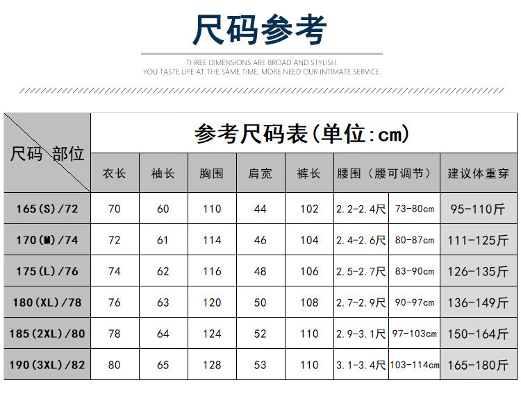 China (cm) 165 / 88-90 170 / 96-98 175 / 108-110 180 / 118-122 185 / 126-130