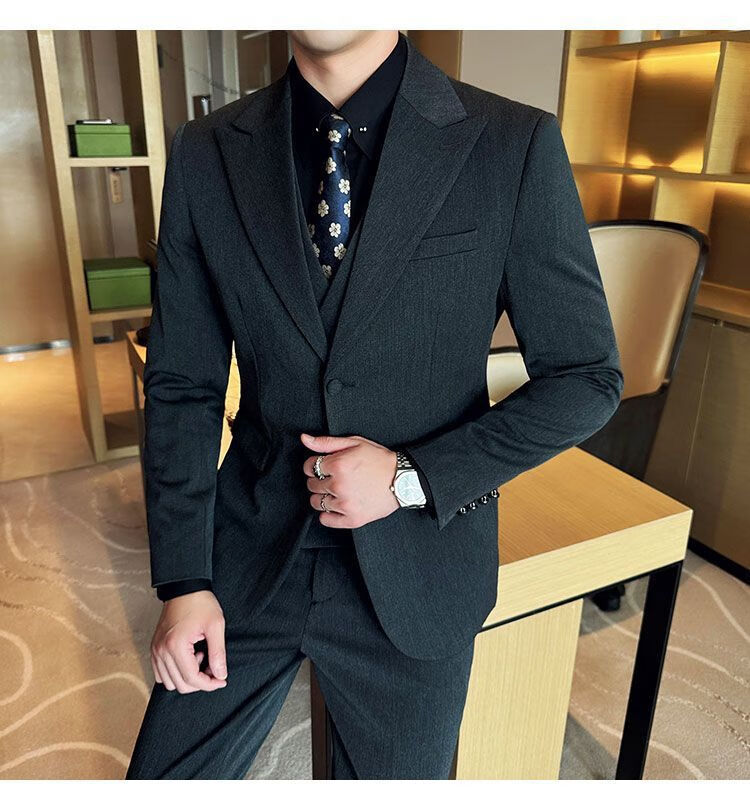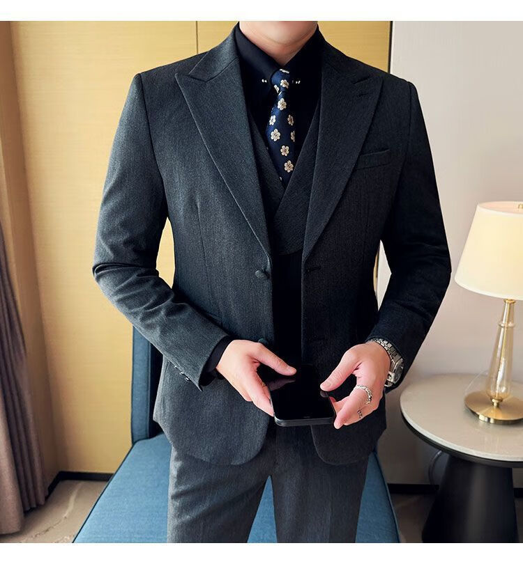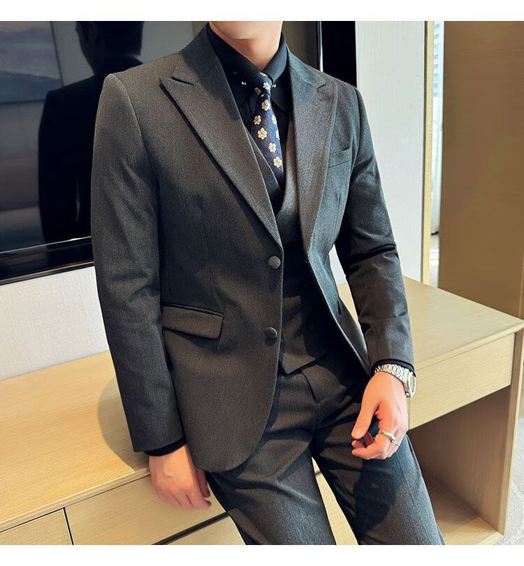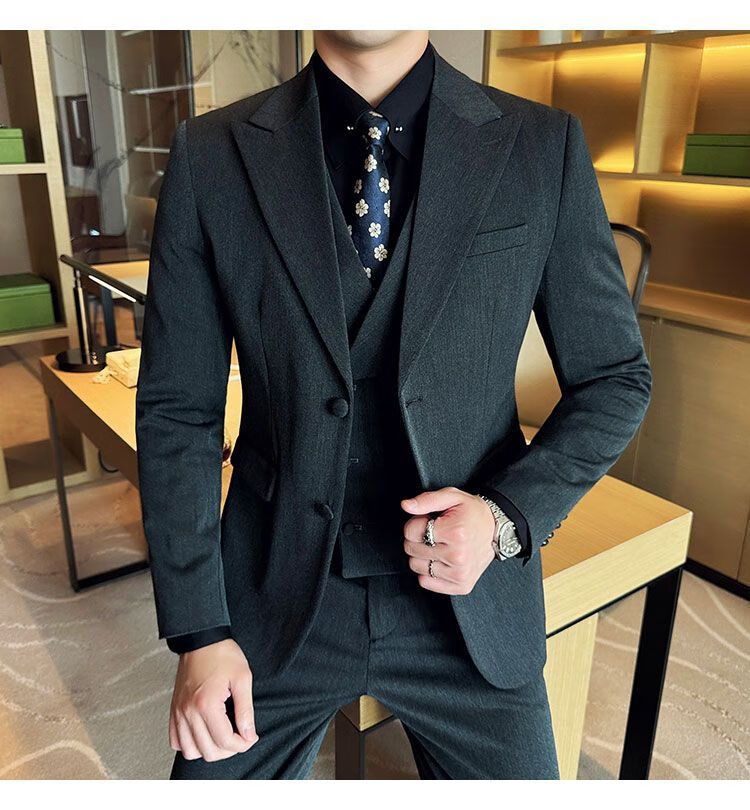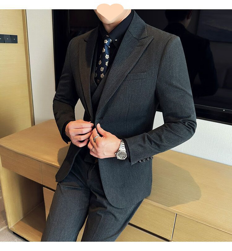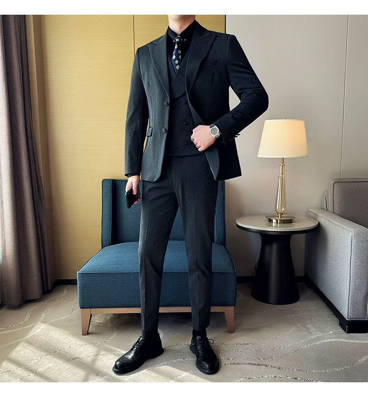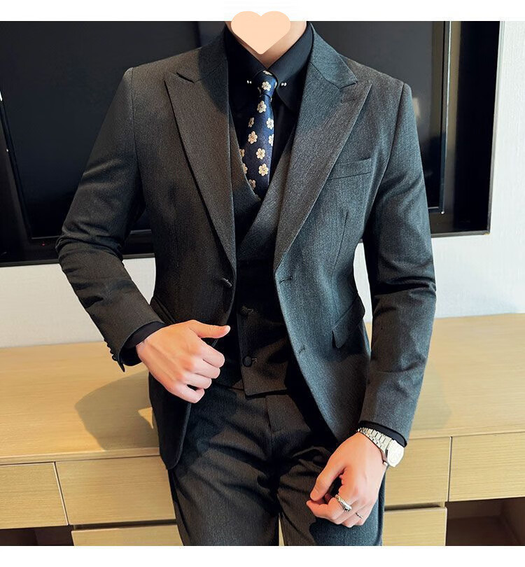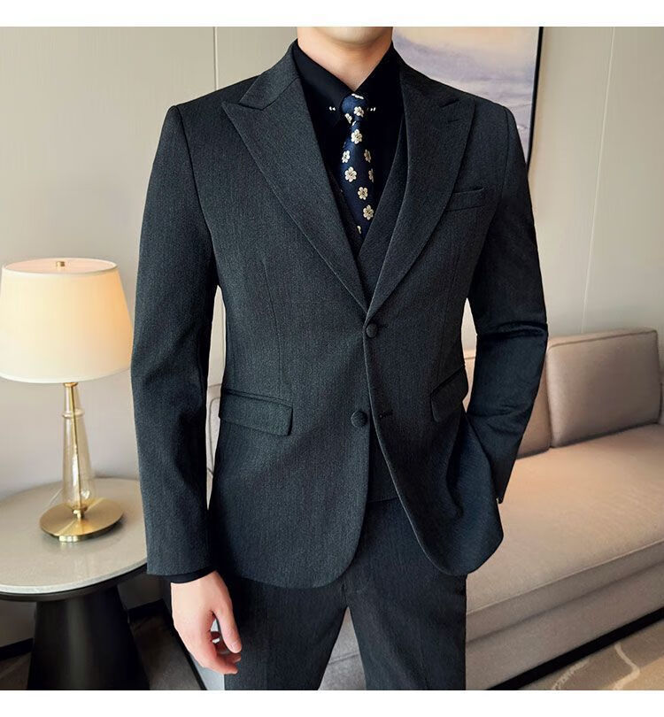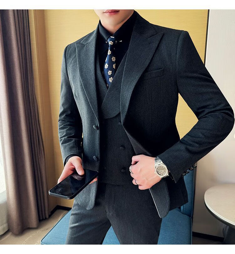 GOLDLION G+Goldlion High Quality Wool Suit Suit Men's Business Casual Formal Patch Collar Suit Groomsman Gift Black Suit+White Shirt+Vest+Pants Two Buttons XL