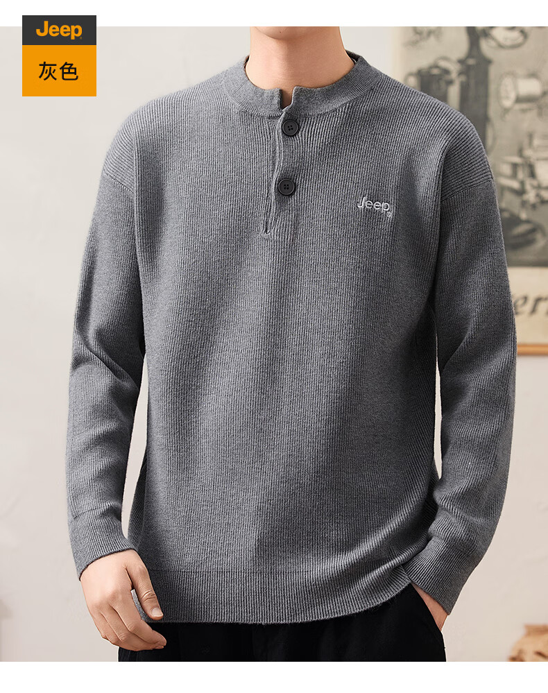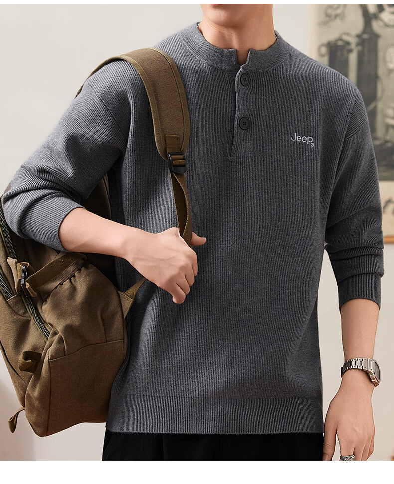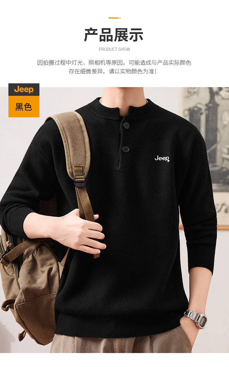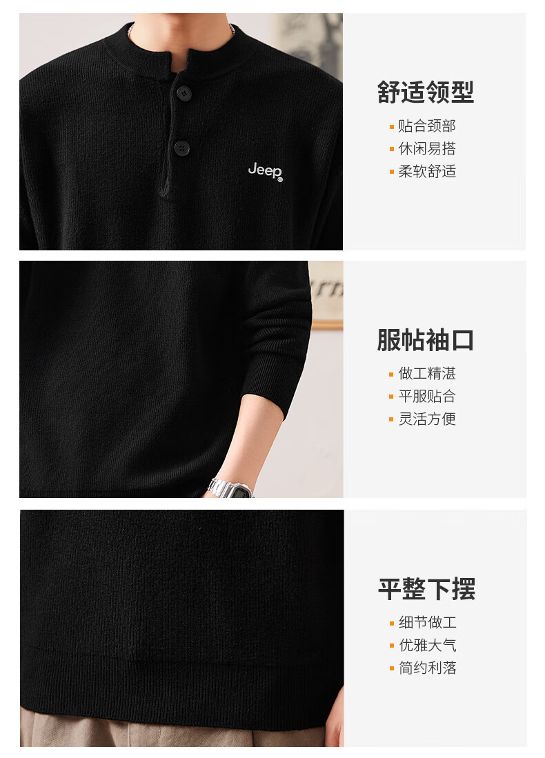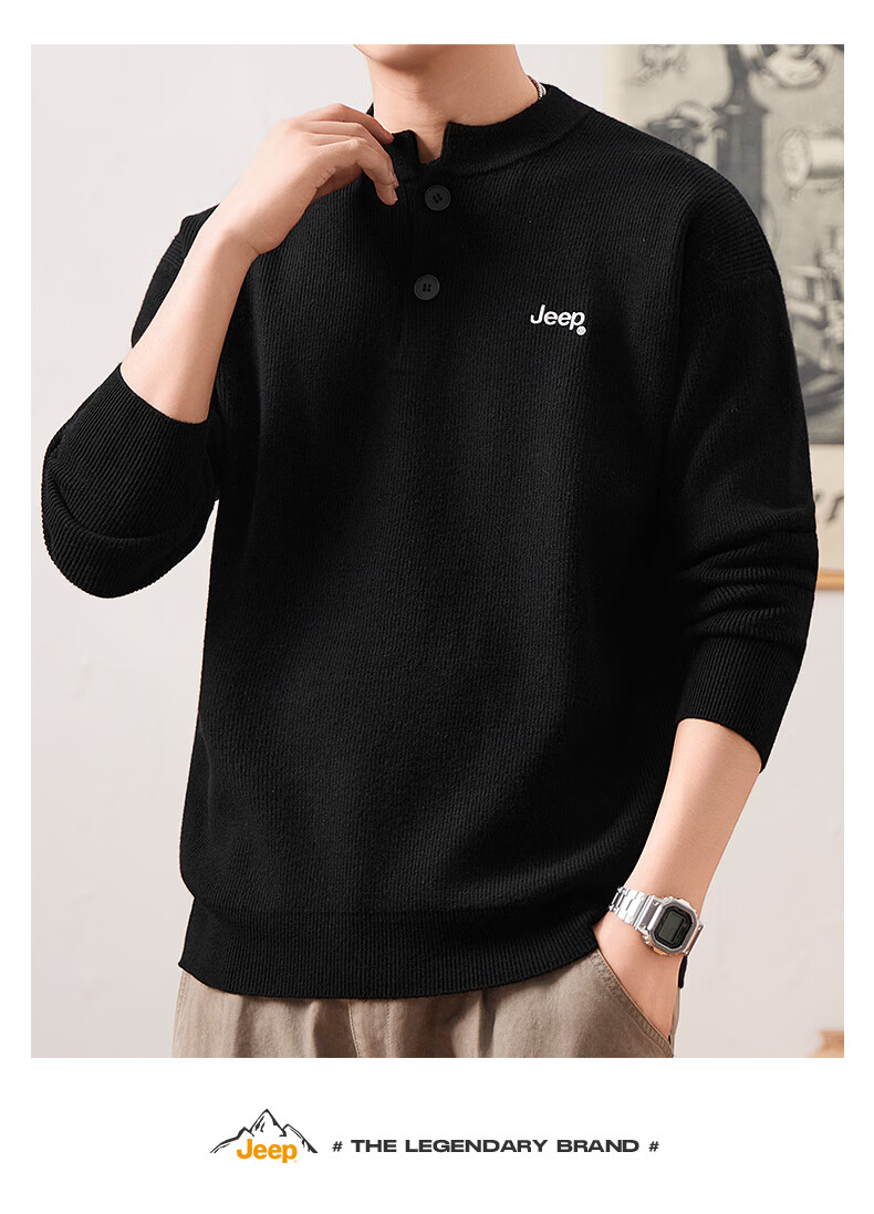Jeep brand sweater men's solid color inner sweater 2025 autumn new trendy Henry collar bottoming sweater for men black 3XL