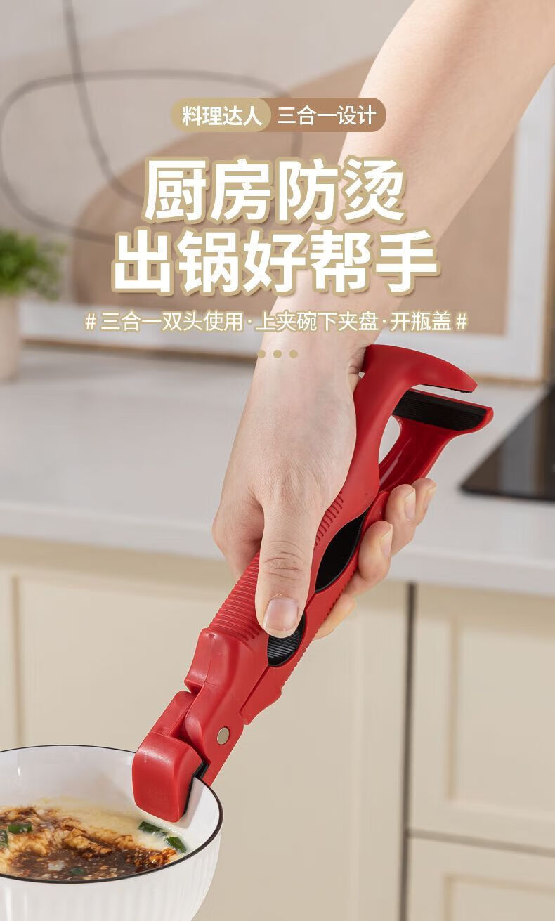 Tanbeiman three-in-one anti-scalding bowl clamp, anti-slip pliers, kitchen tongs, plate clamp, steamed vegetable insulated tray and bowl clamp, true red, 1 pack, three-in-one anti-scalding clamp