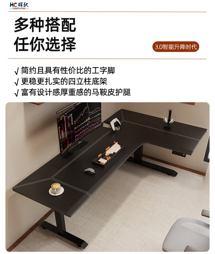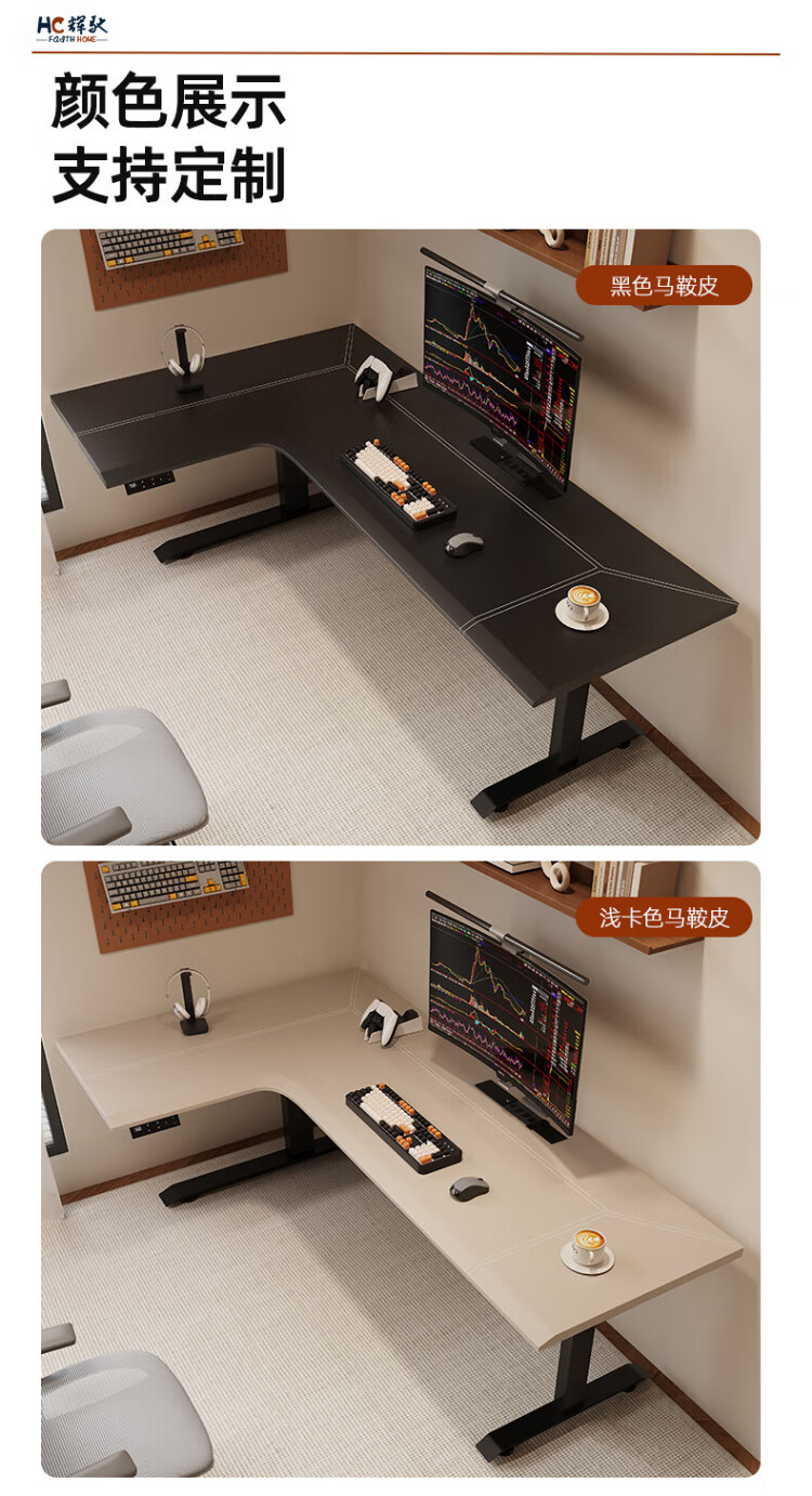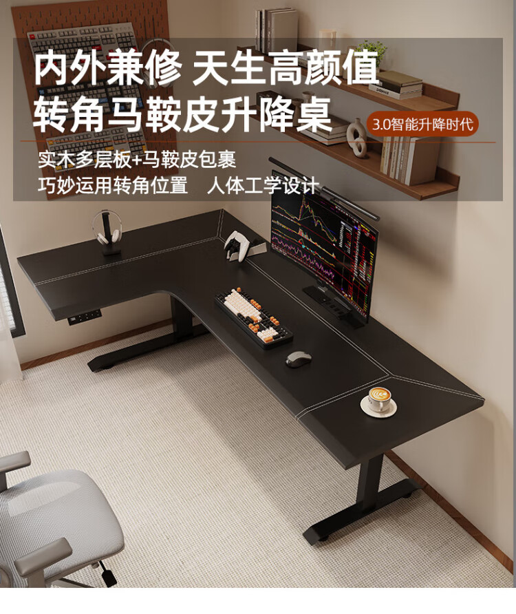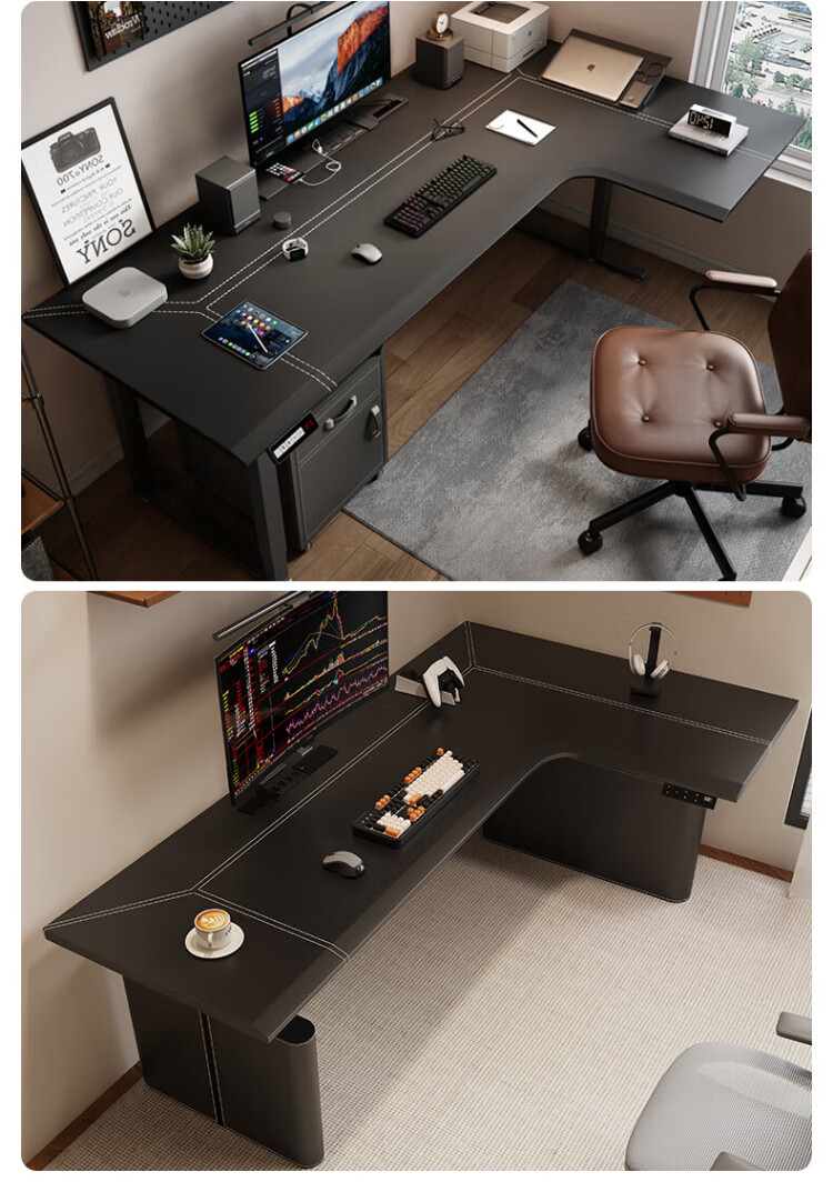 Corner computer desk smart electric lift table home L-shaped desk liftable gaming table corner desk H09 SE turn left black saddle leather desktop + I-beam double motor 1.4m*1.1m desktop size with row plug box