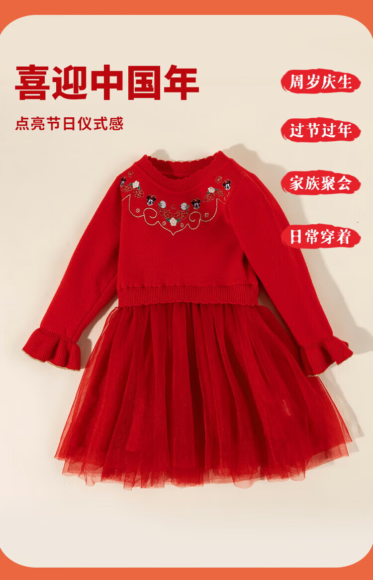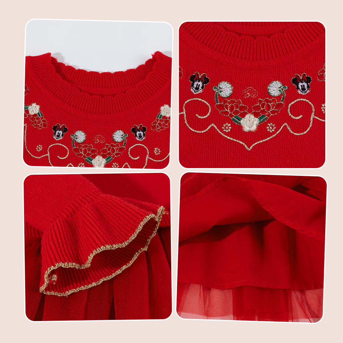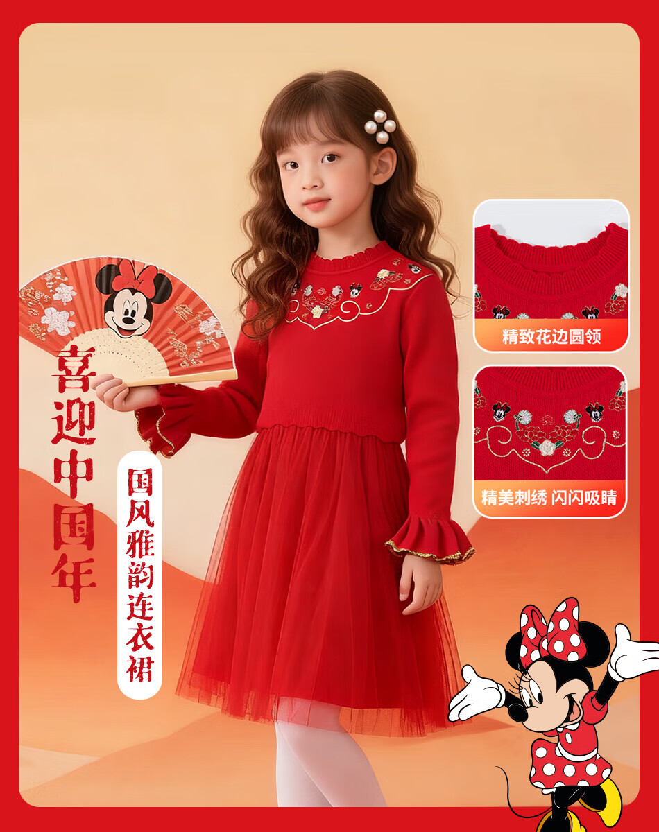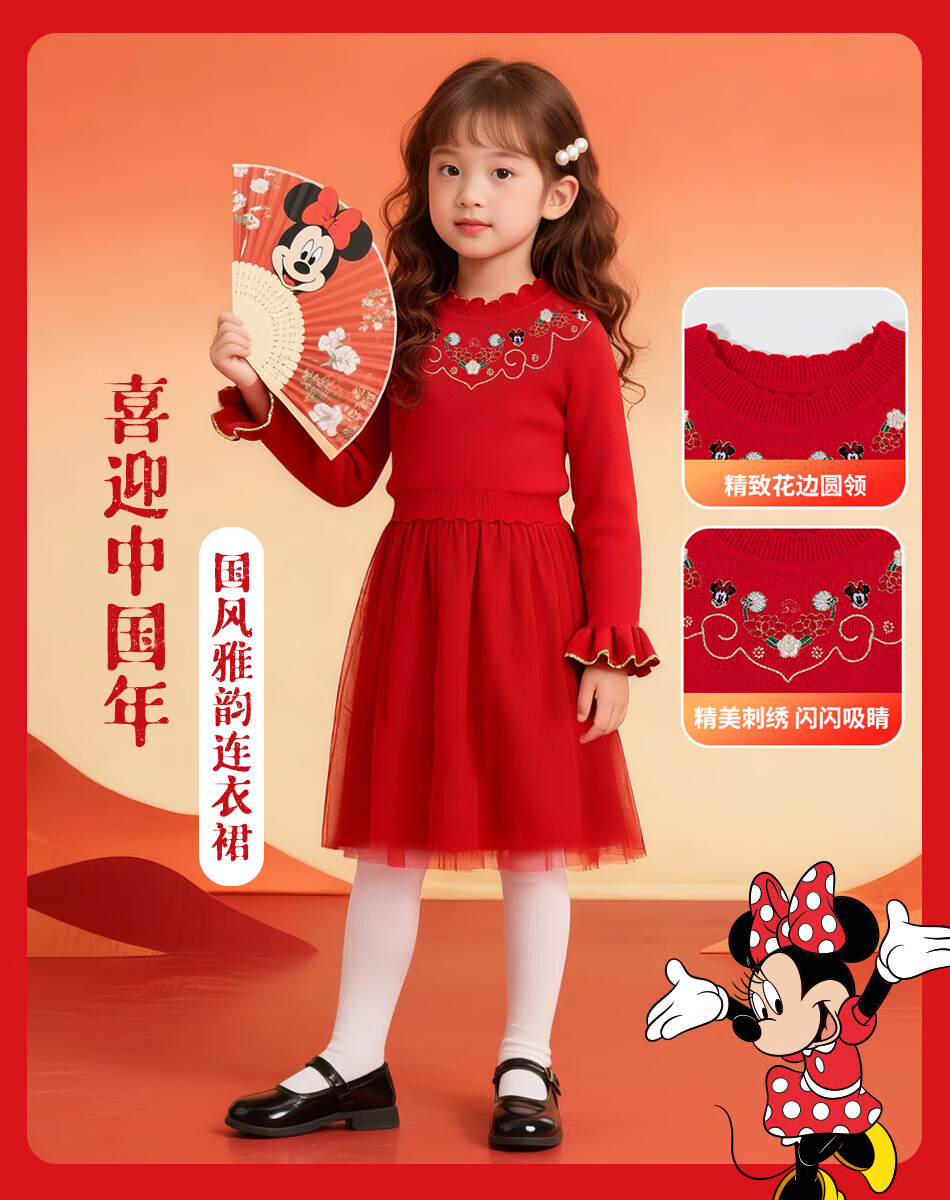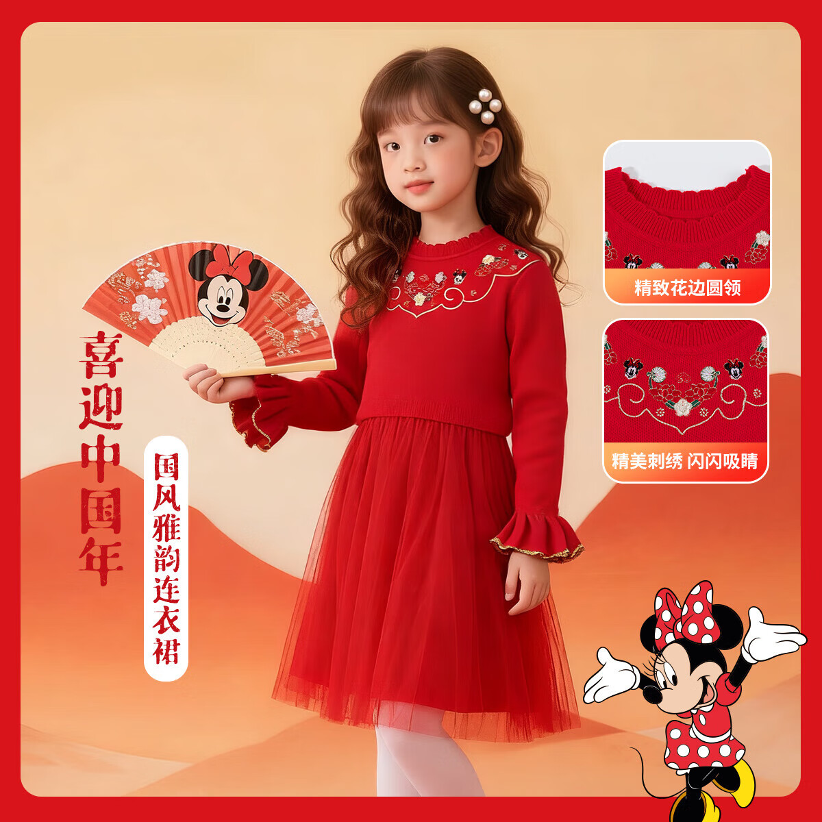 Disney (Disney) girls dress new Chinese style red New Year's greeting dress fresh and sweet daily versatile and comfortable for children big red 120