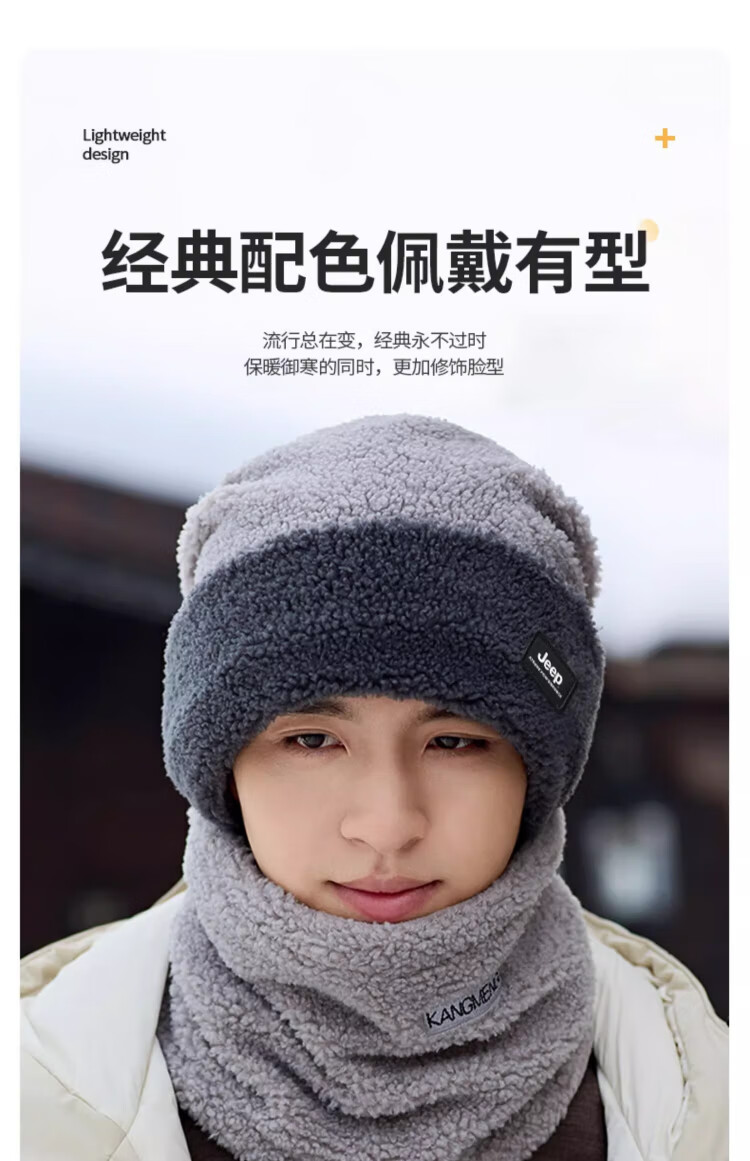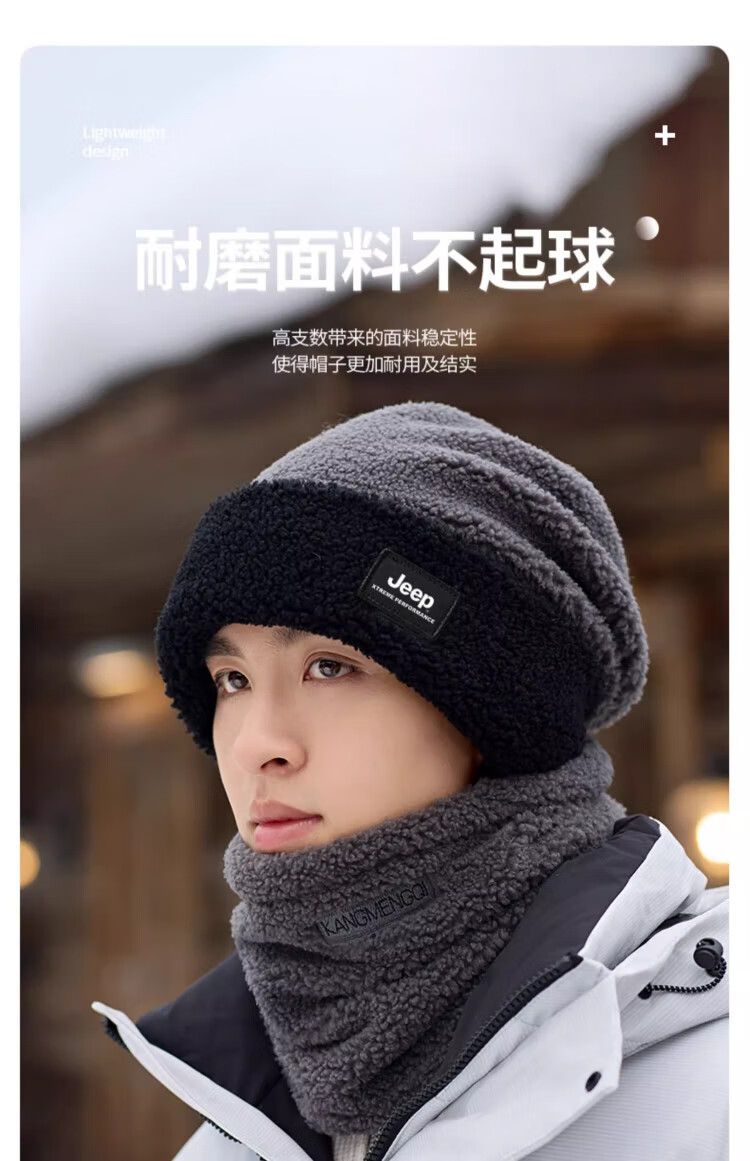 JEEP men's knitted woolen hat winter plus velvet thickened ear protection warm hat and neck scarf set windproof and cold-proof large head circumference black hat + neck scarf one size