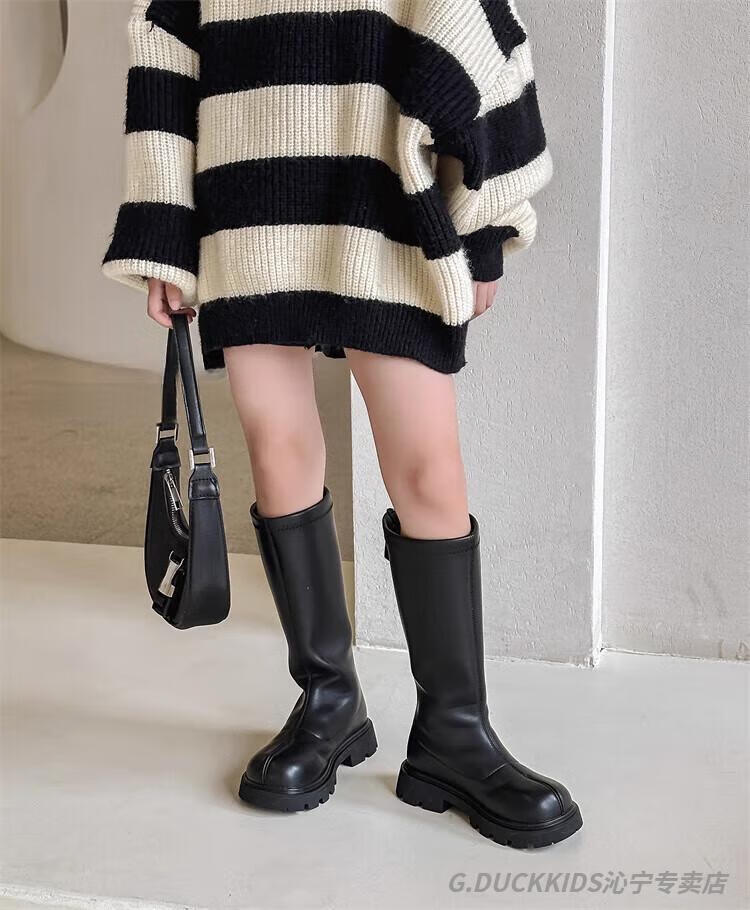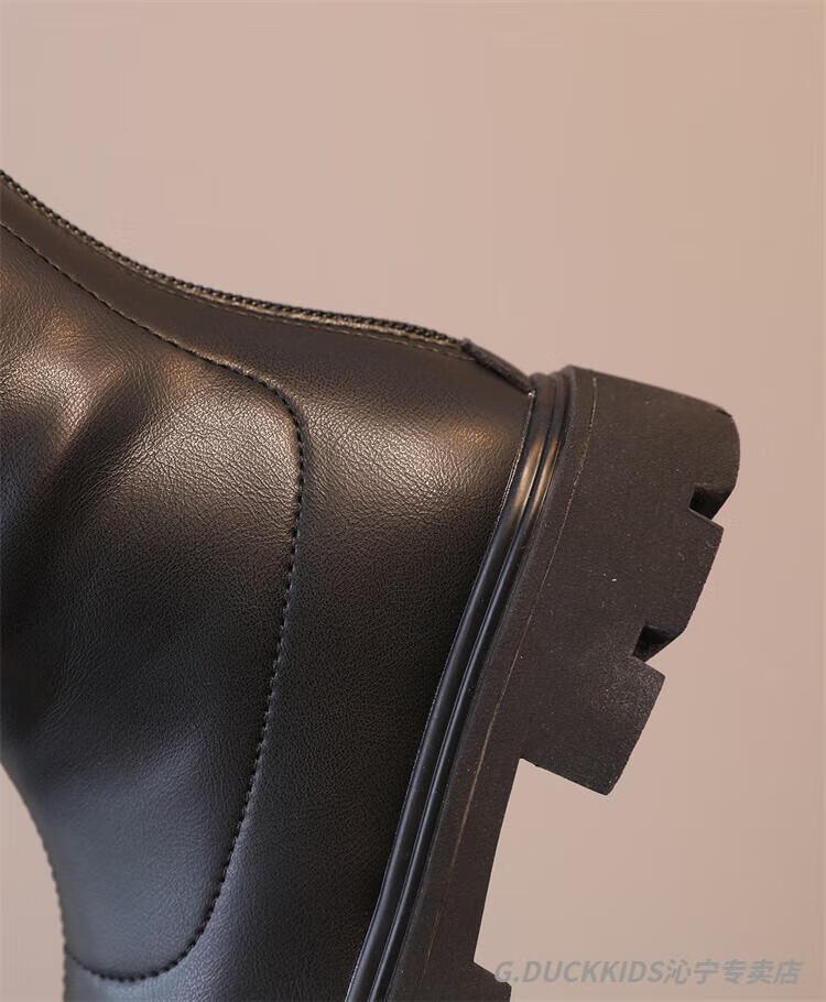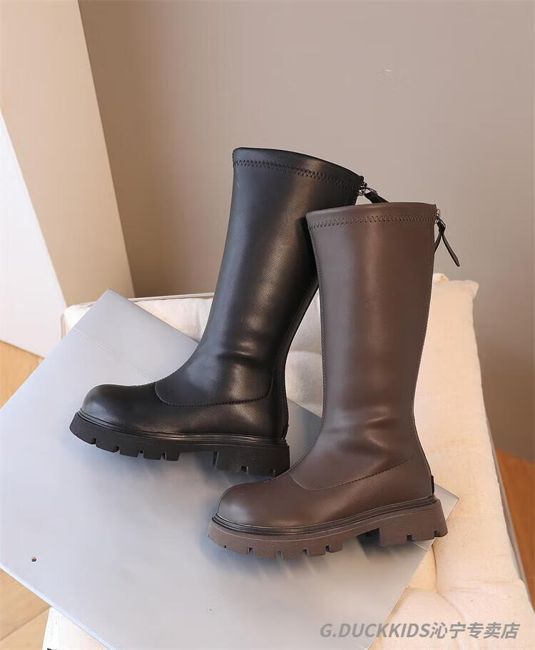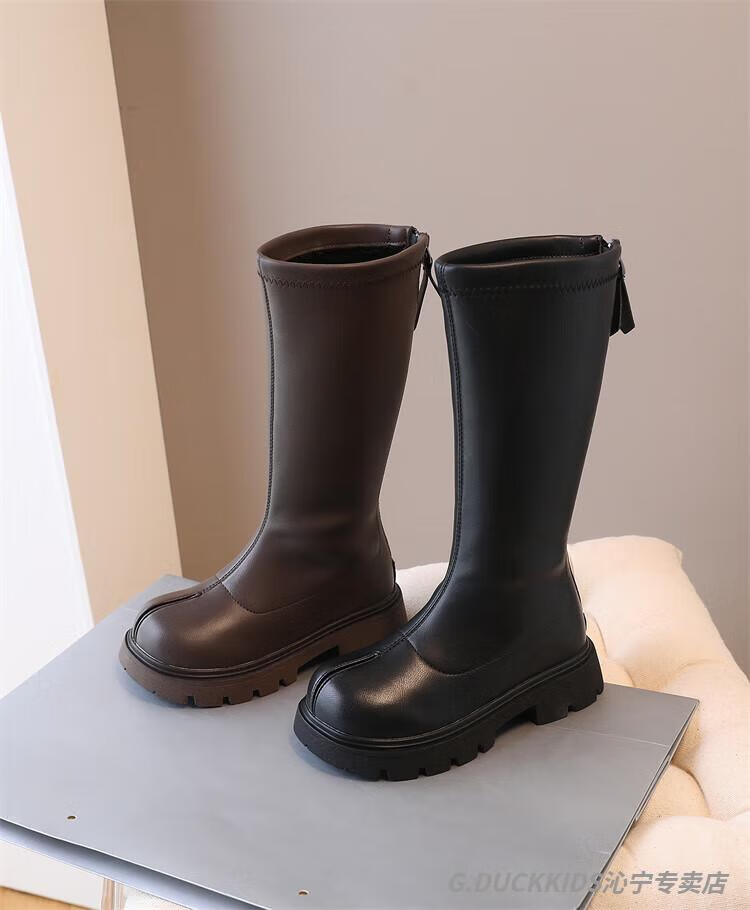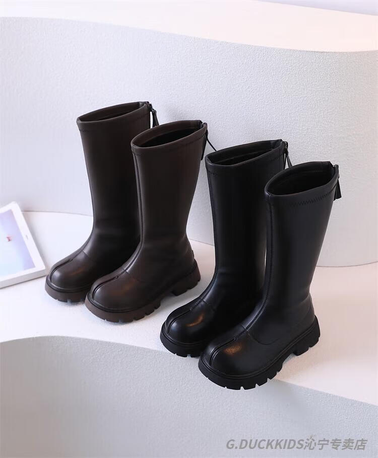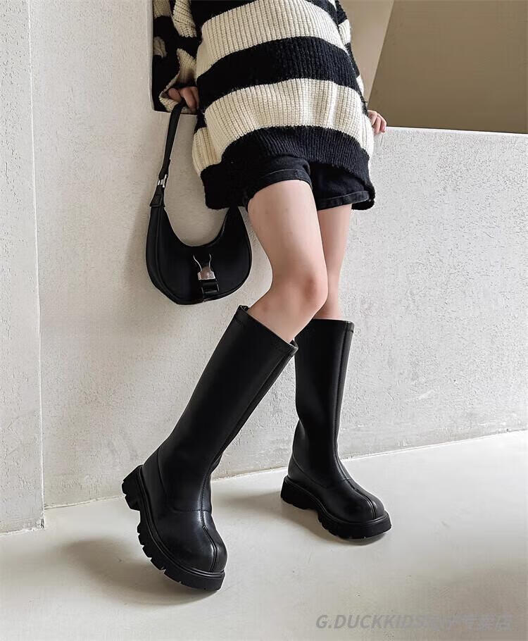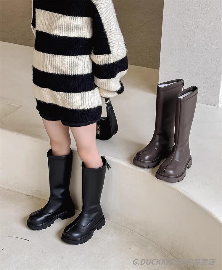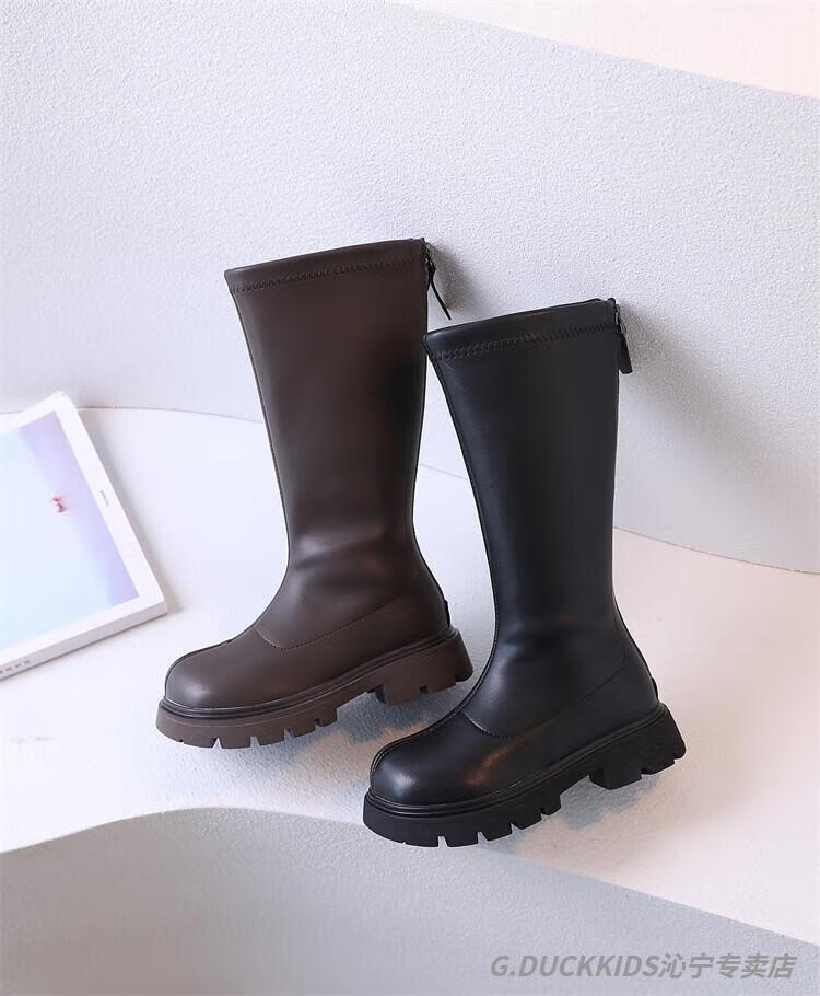 G.duck Little Yellow Duck Girls' Boots Autumn and Winter Plus Velvet 2025 New Medium and Large Children's Soft Sole High Children's Boots Girls Long Black Single Liner Size 26/Inner Length 16.7cm