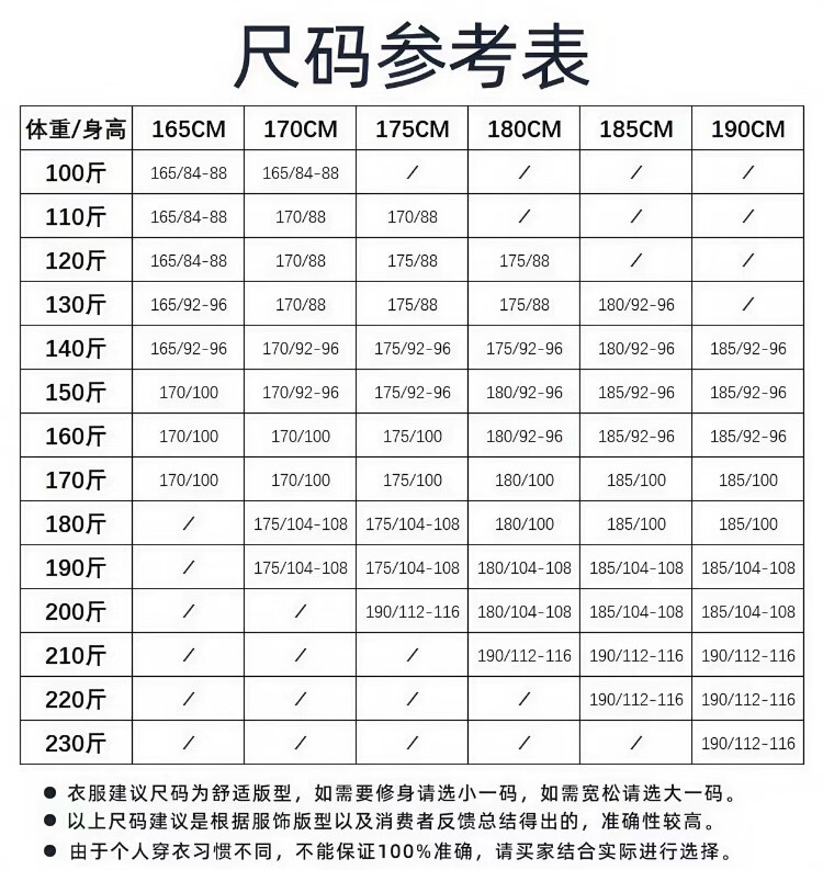 China (cm) 160-165/84-86 165-170 / 88-90 167-172 / 92-96 168-173 / 98-102 170-176 / 106-110