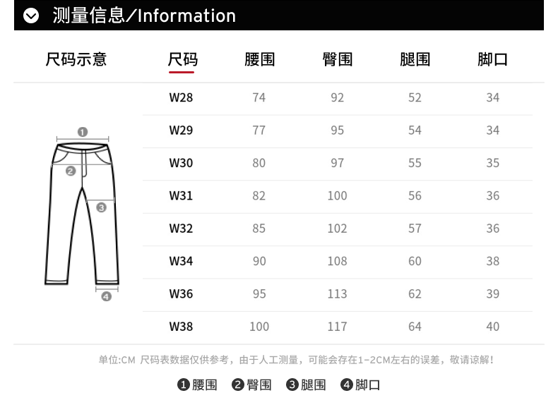 USA(inch) 28-30 30-32 32-34 34-38 38-42