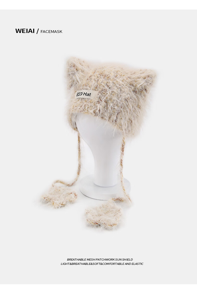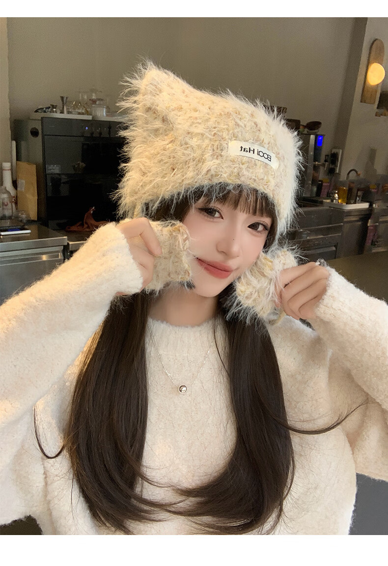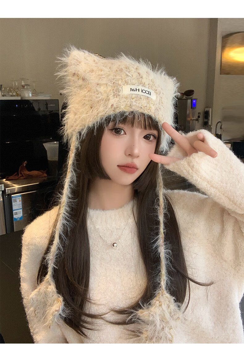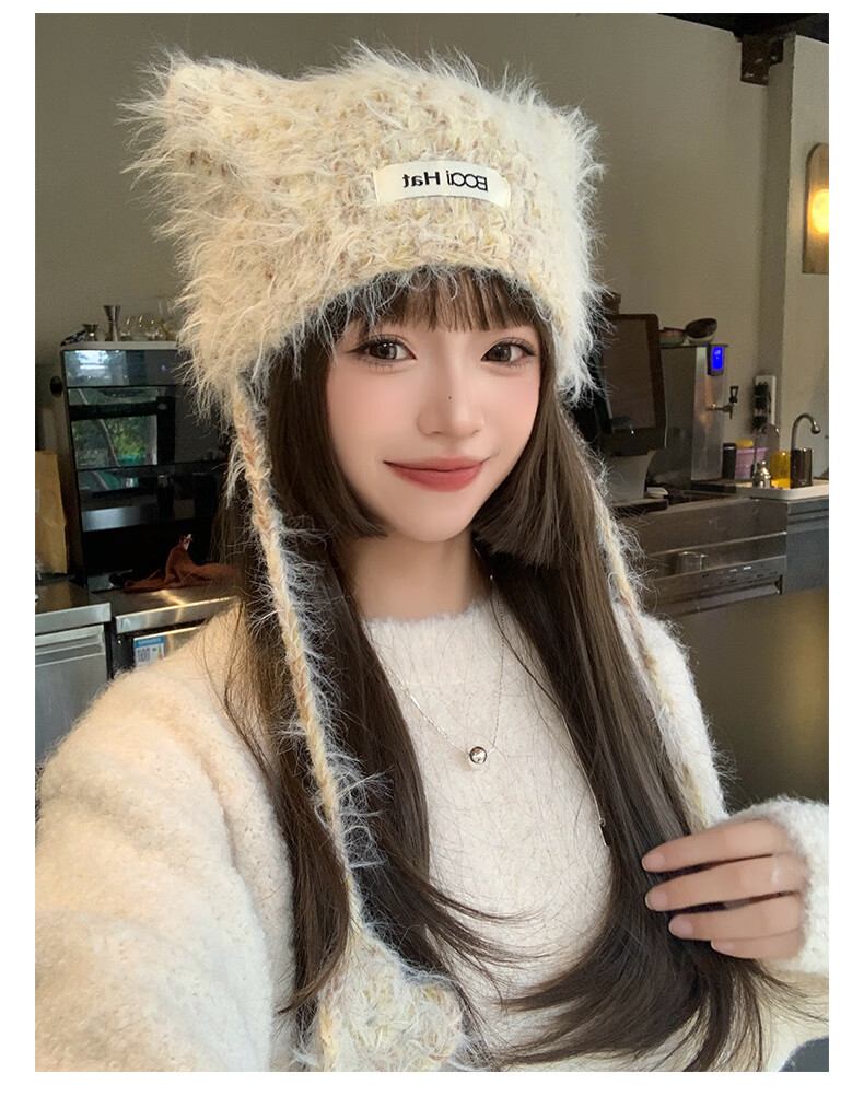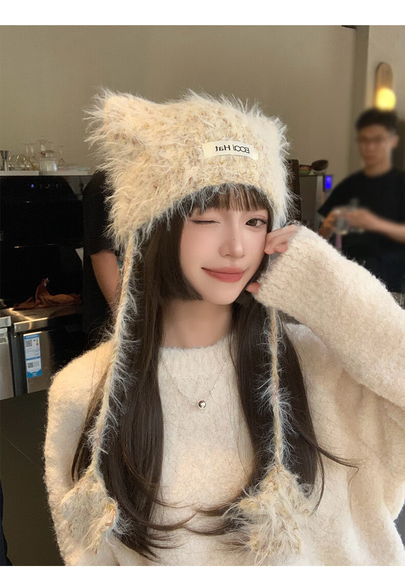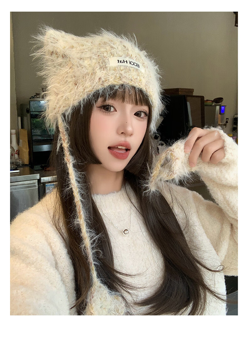 SOMUBAY (SOMUBAY) cute cat ears ear protection woolen hat for girls in autumn and winter plus velvet warm plush knitted hat lace-up Lei Feng hat beige elastic hat circumference 54-58cm