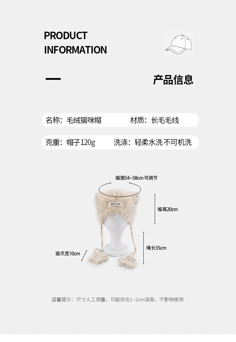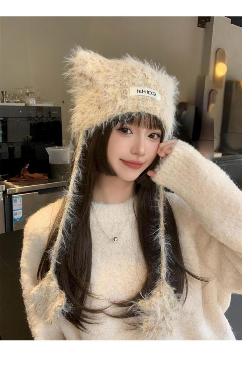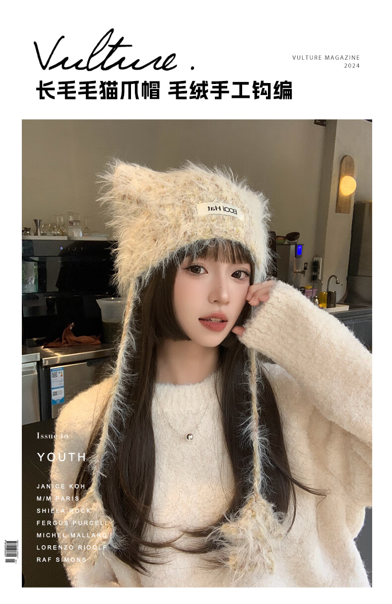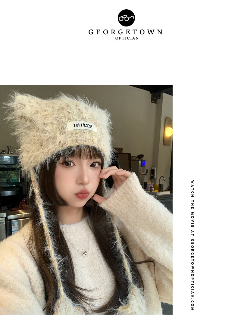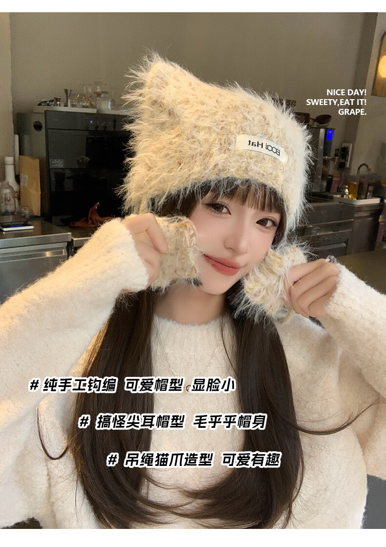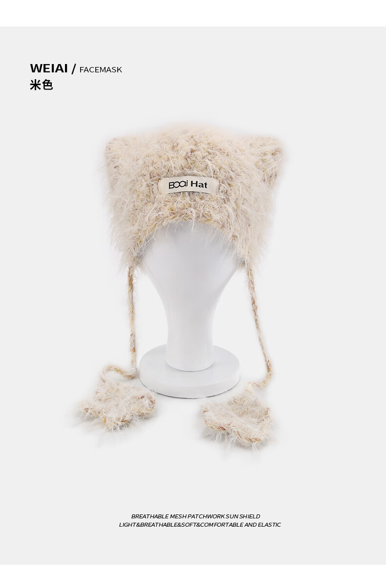 SOMUBAY (SOMUBAY) cute cat ears ear protection woolen hat for girls in autumn and winter plus velvet warm plush knitted hat lace-up Lei Feng hat beige elastic hat circumference 54-58cm