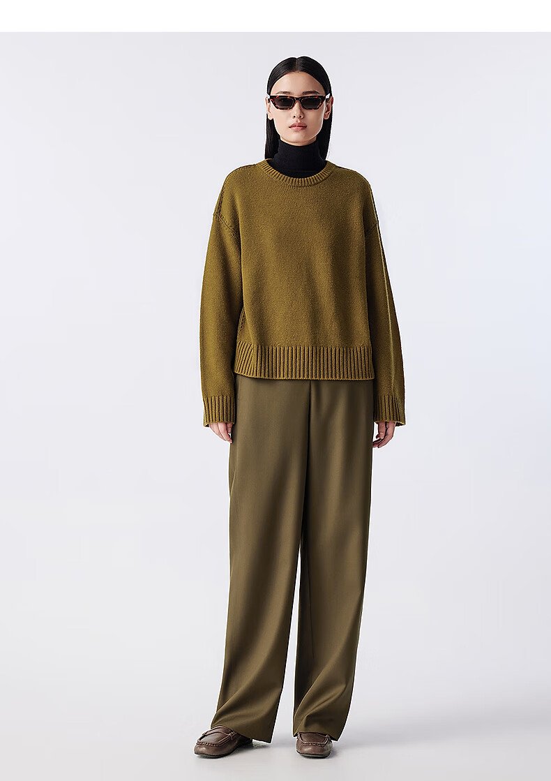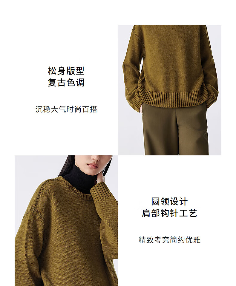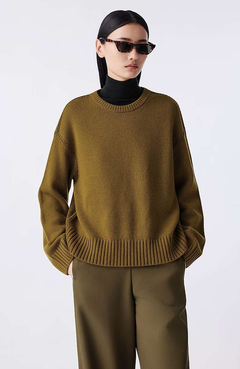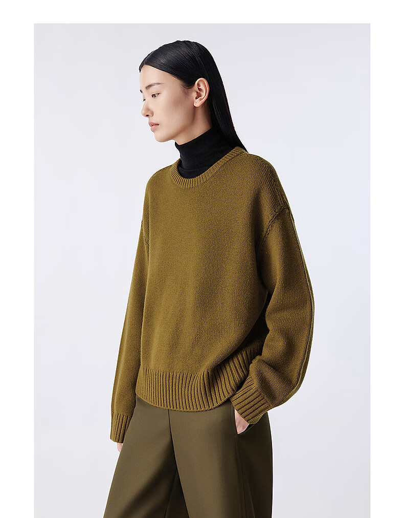 LANCY Wool Cashmere Winter New Retro Relaxed Round Neck Knitted Sweater Short Sweater Women Khaki Green M