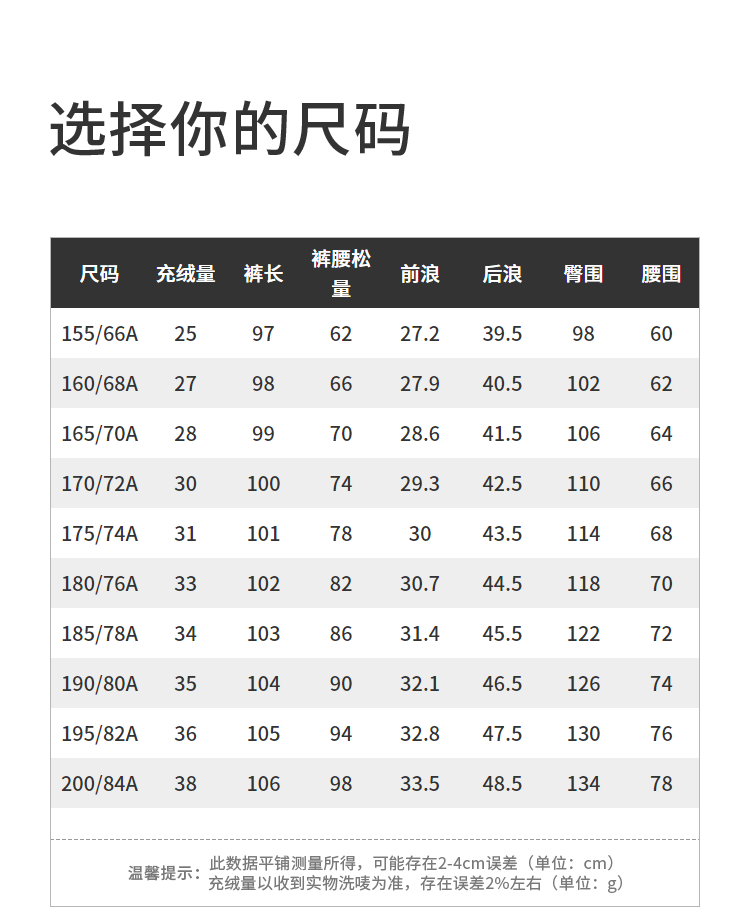 China (cm) 165 / 88-90 170 / 96-98 175 / 108-110 180 / 118-122 185 / 126-130