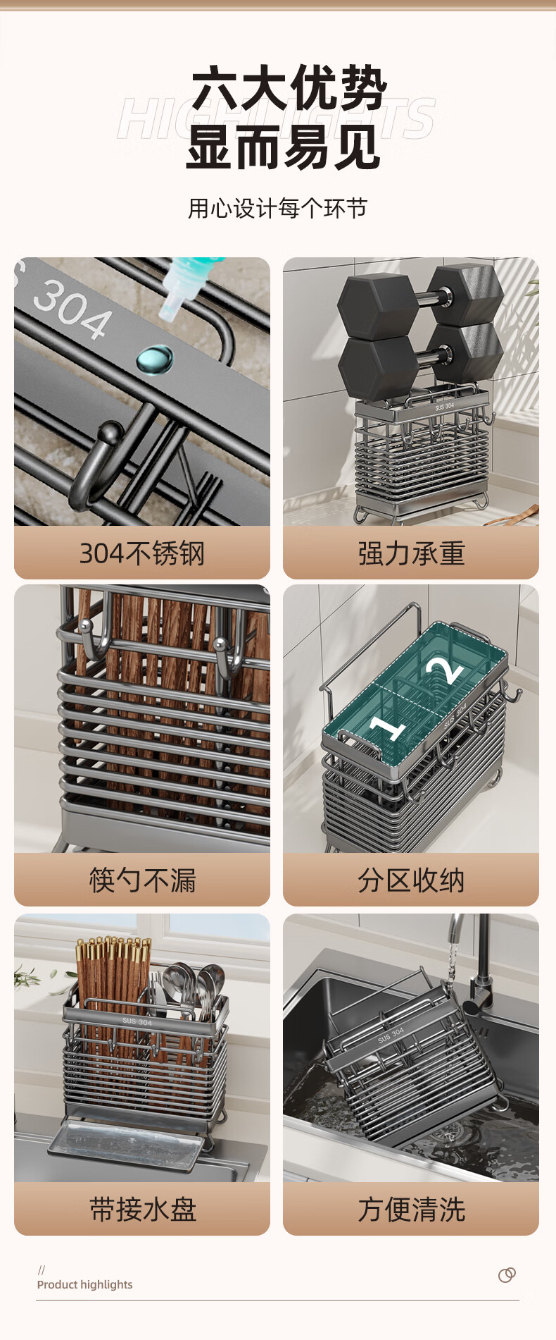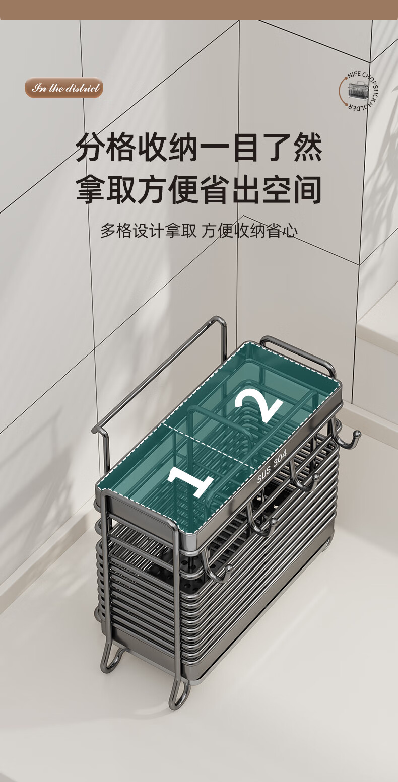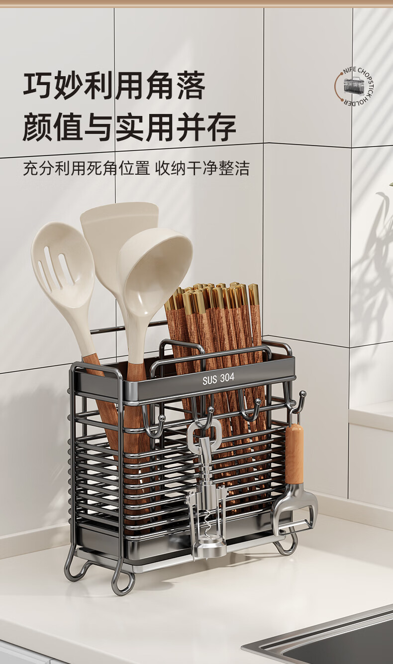 Jiumu chopstick storage box chopstick barrel wall-mounted bucket basket holder kitchen household new stainless steel spoon quick cage gun ash 3 compartments K-18 table + with 4 hooks + PP water tray