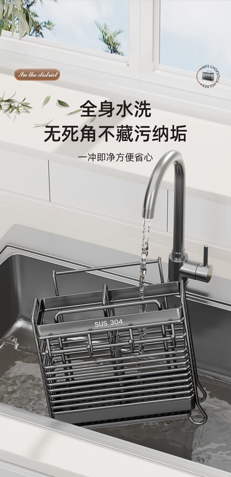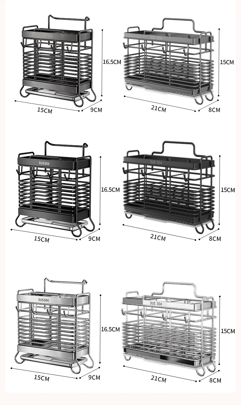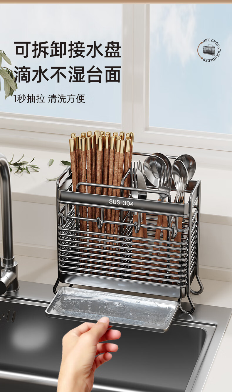 Jiumu chopstick storage box chopstick barrel wall-mounted bucket basket holder kitchen household new stainless steel spoon quick cage gun ash 3 compartments K-18 table + with 4 hooks + PP water tray