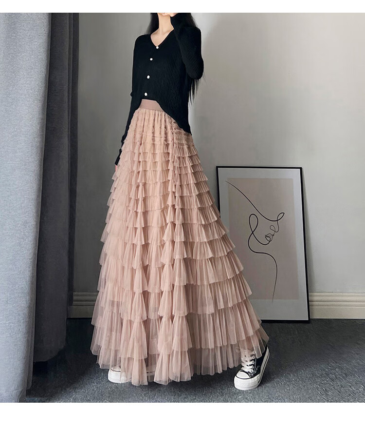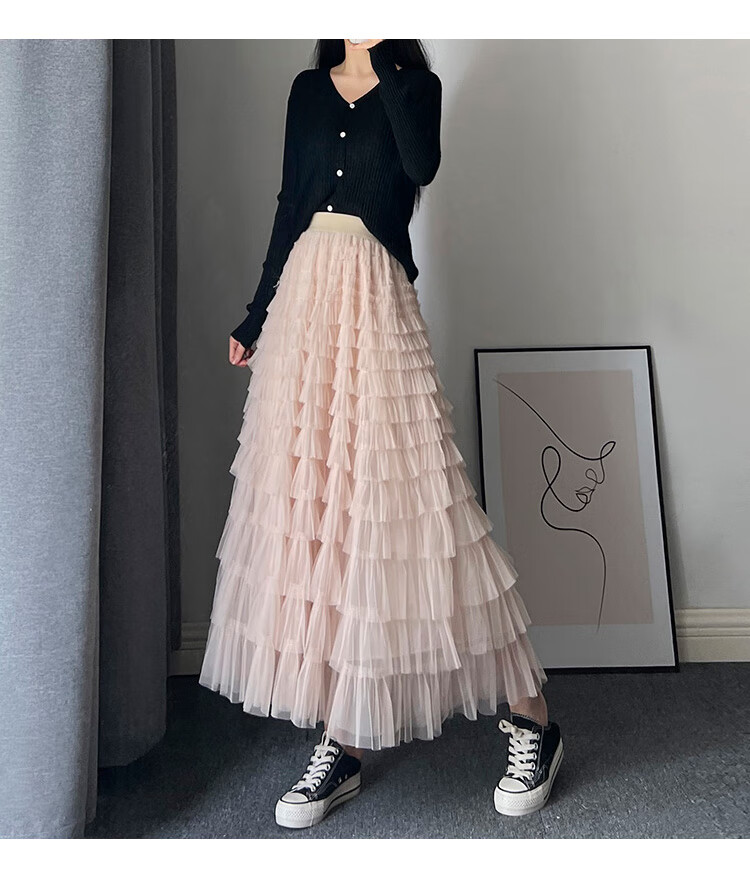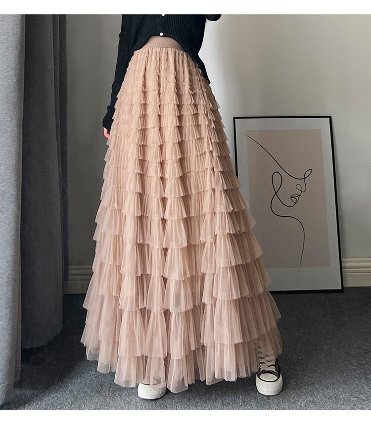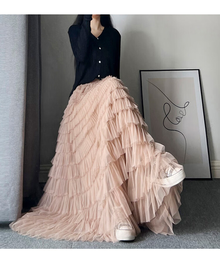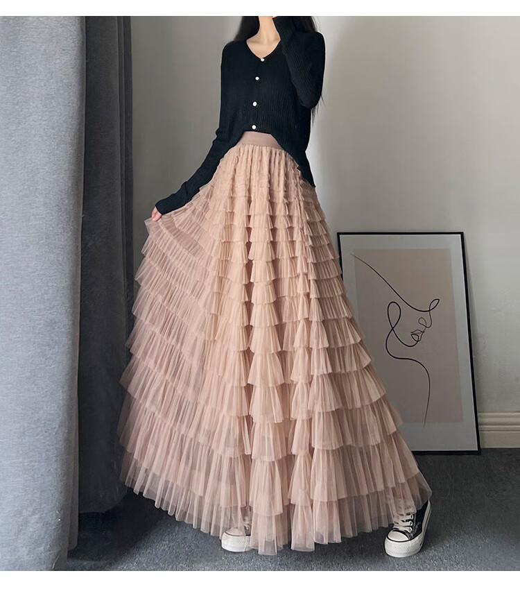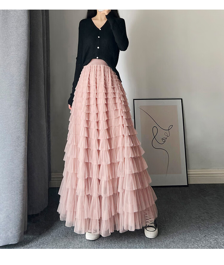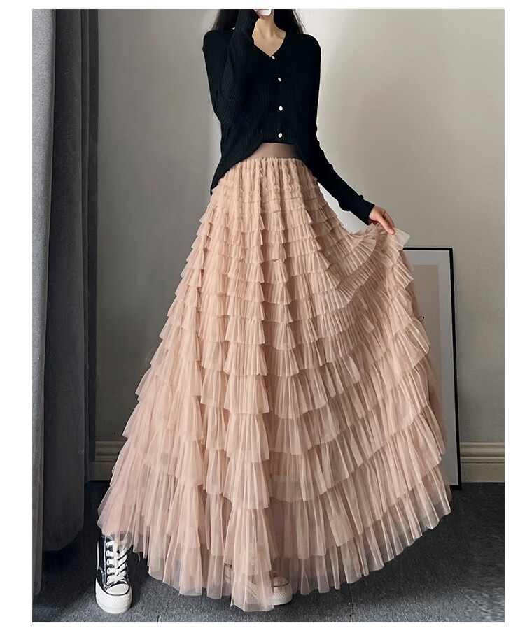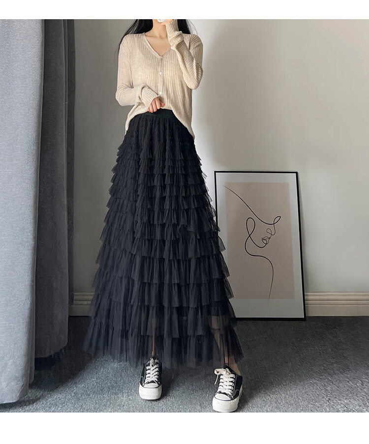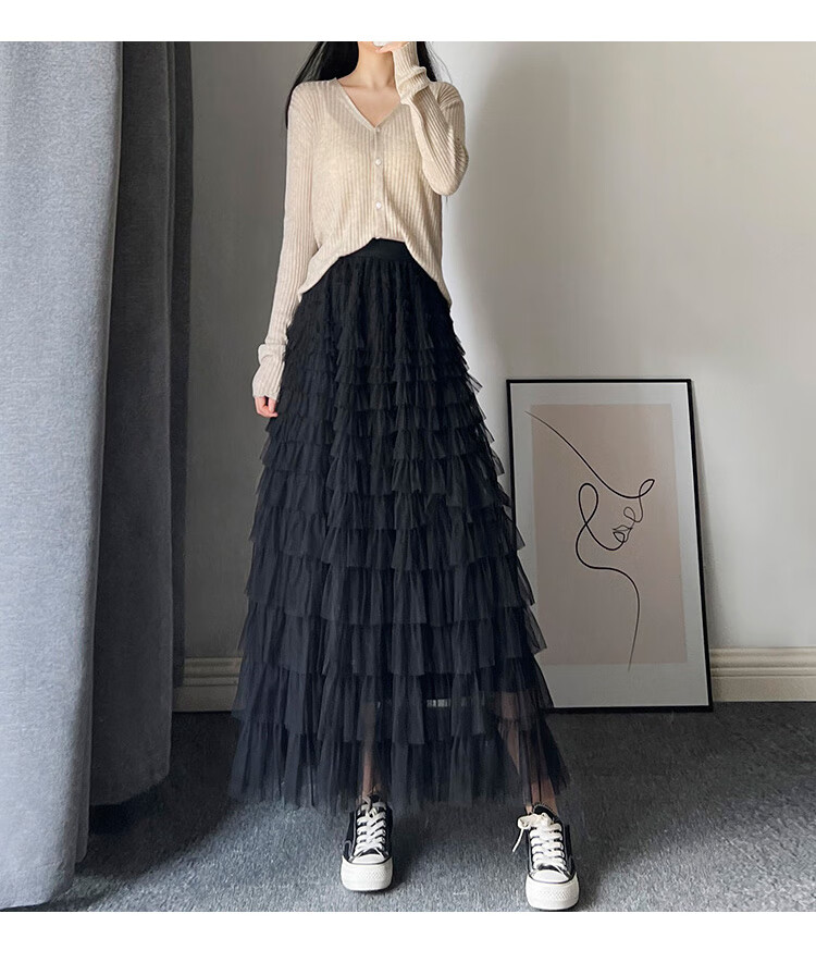 Xianqi mesh cake skirt for women 2025 autumn new mid-length skirt a-line skirt high-end pleated umbrella skirt black one size fits all recommended 80-155 Jin Jin equals 0.5 kg
