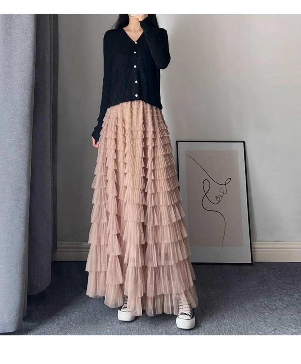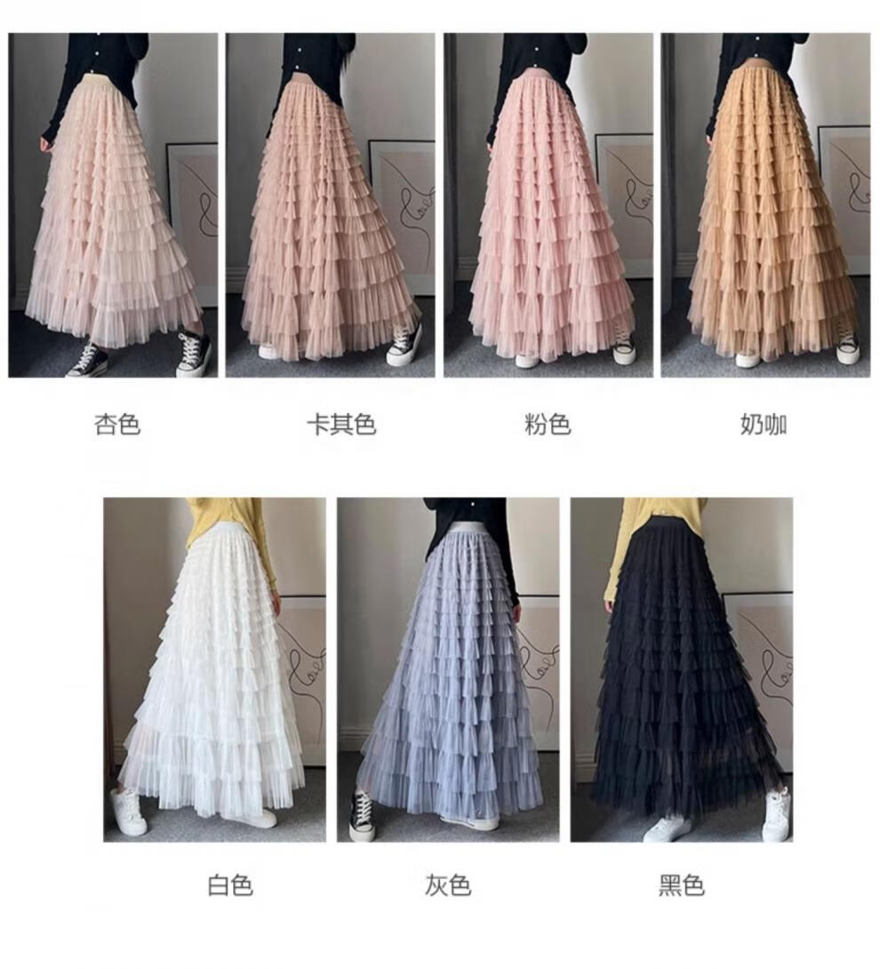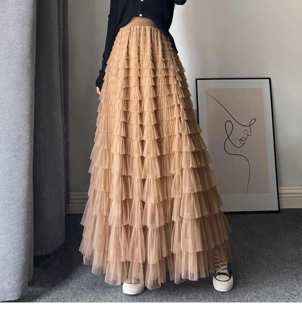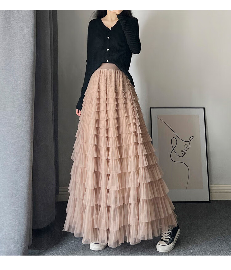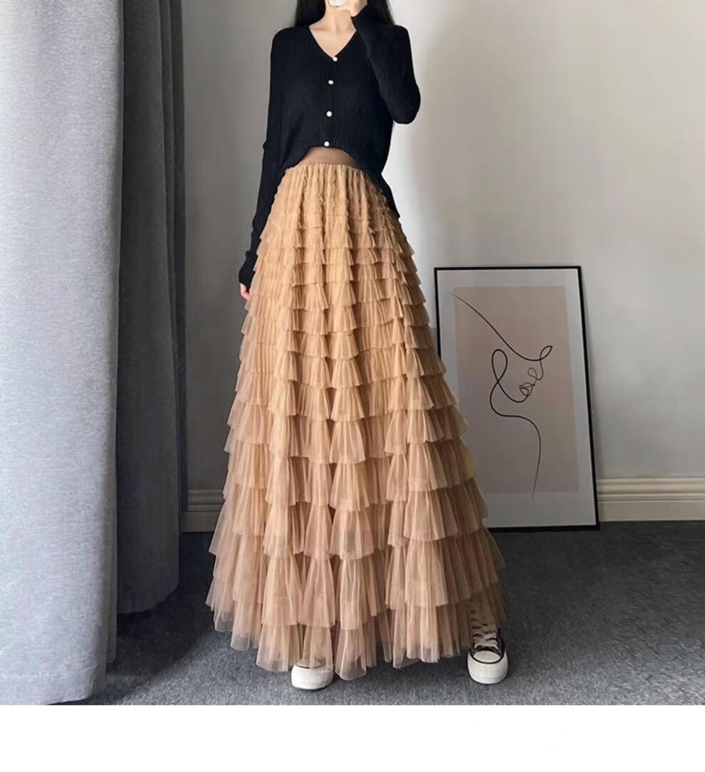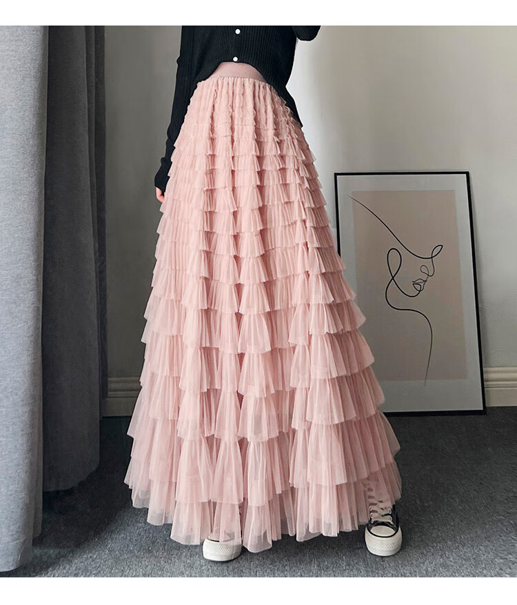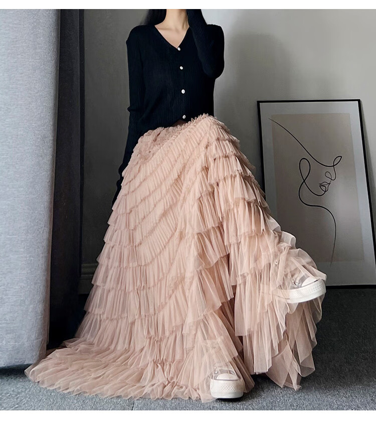 Xianqi mesh cake skirt for women 2025 autumn new mid-length skirt a-line skirt high-end pleated umbrella skirt black one size fits all recommended 80-155 Jin Jin equals 0.5 kg
