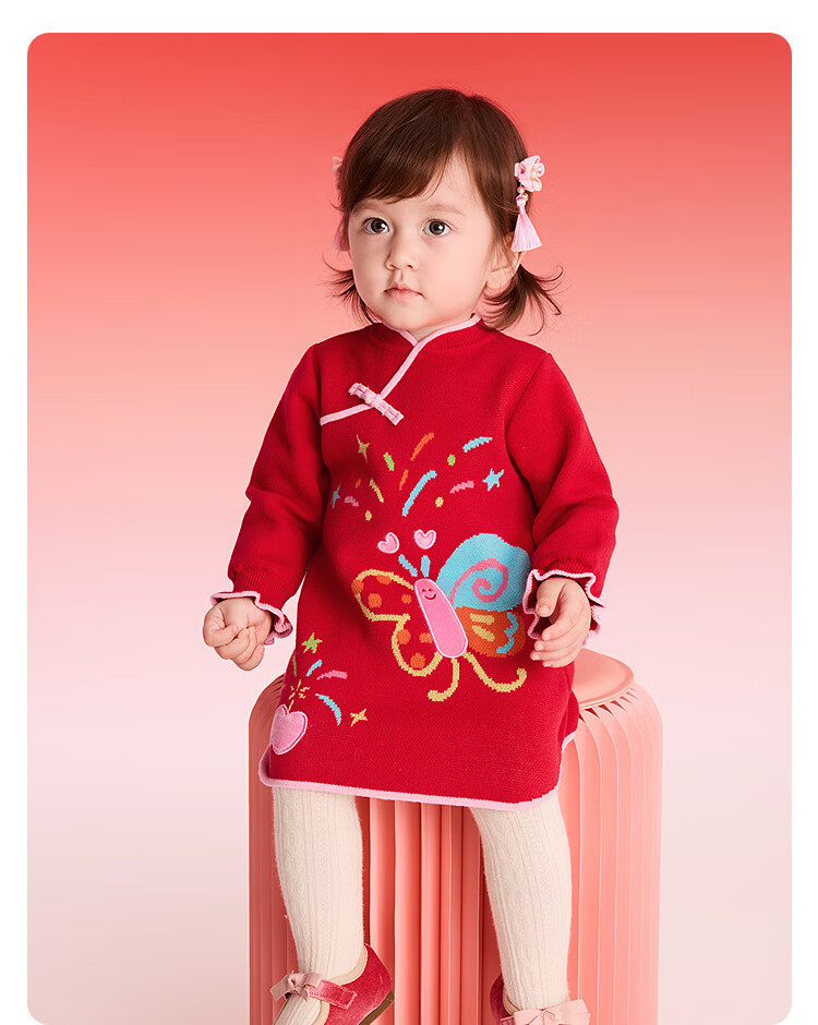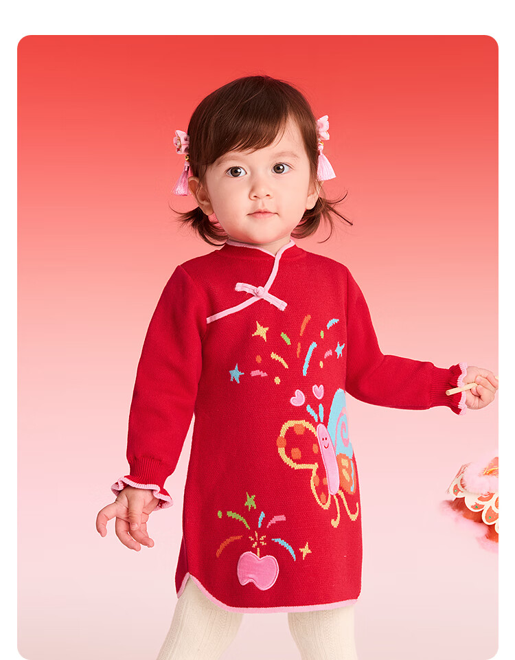 BalaOne children's clothing girls new Chinese style cheongsam dress knitted red New Year's greetings dress red tone 00366 90