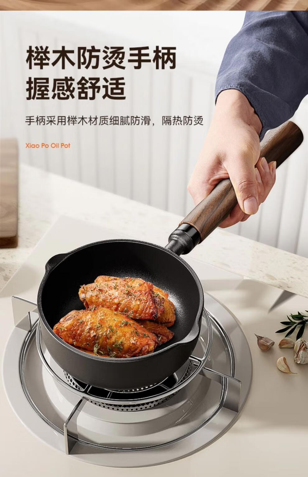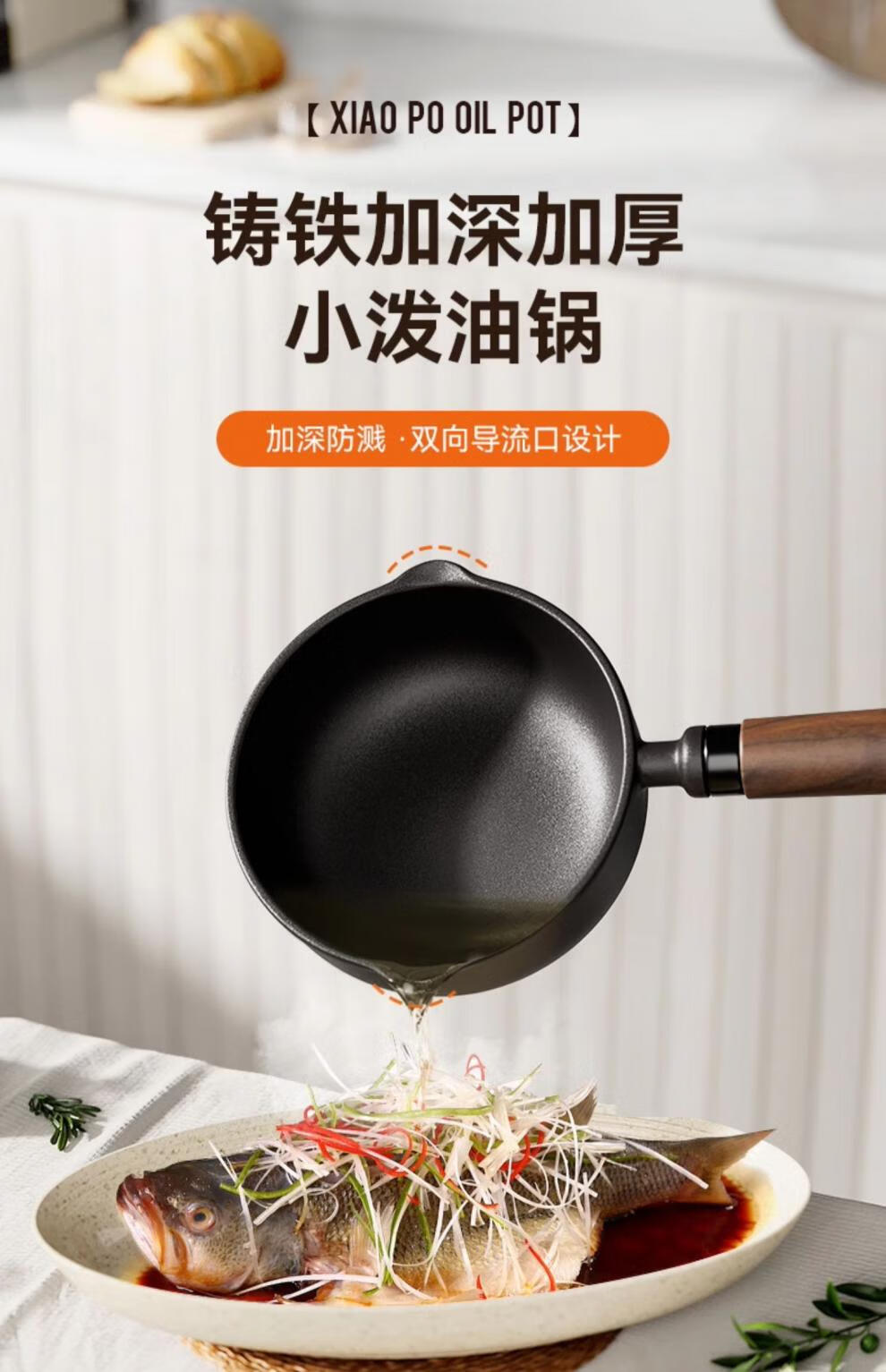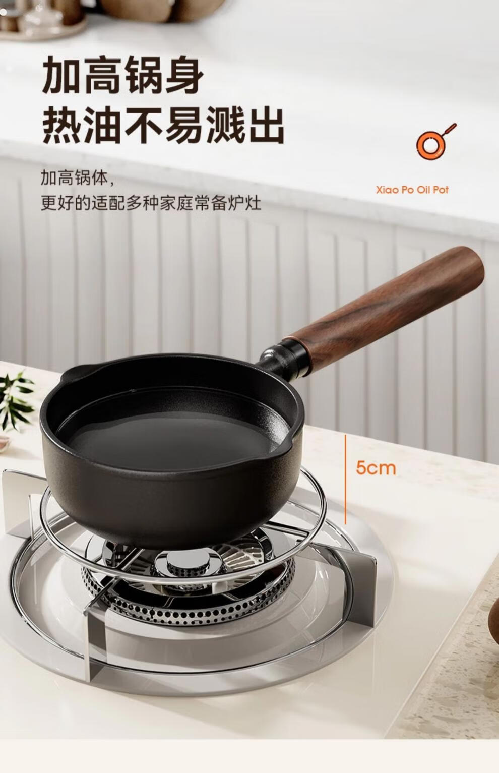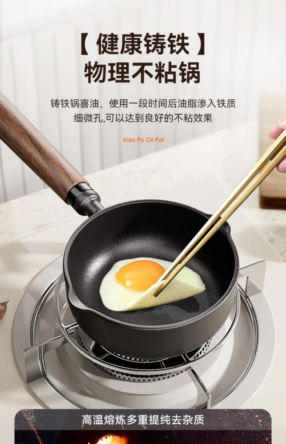 Fat Donglai's same style cast iron small frying pan, deepened omelette pan, multi-functional hot oil burning oil pouring oil pouring pan (height 6cm) pouring oil pan + free pot stand + oil brush + frying spatula, hanging handle 13cm