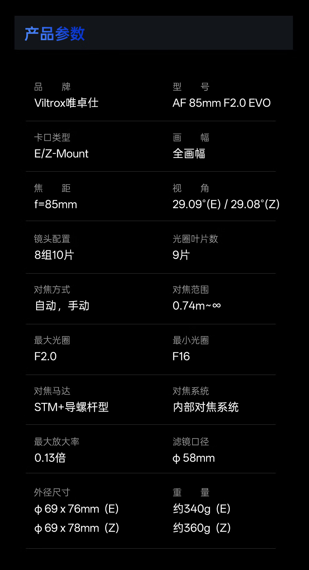 Viltrox 85mm F2.0 EVO Sony mouth Nikon mouth full frame medium telephoto portrait large aperture fixed focus lens suitable for Z mount FE mount mirrorless camera autofocus lens AF 85mm F2.0 EVO FE (Sony mouth) official standard