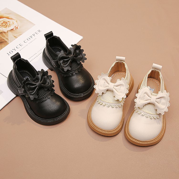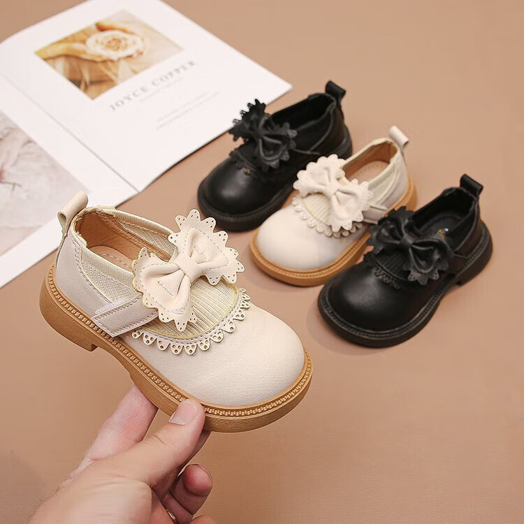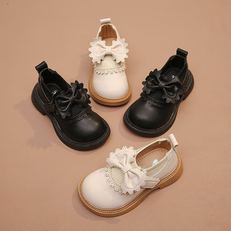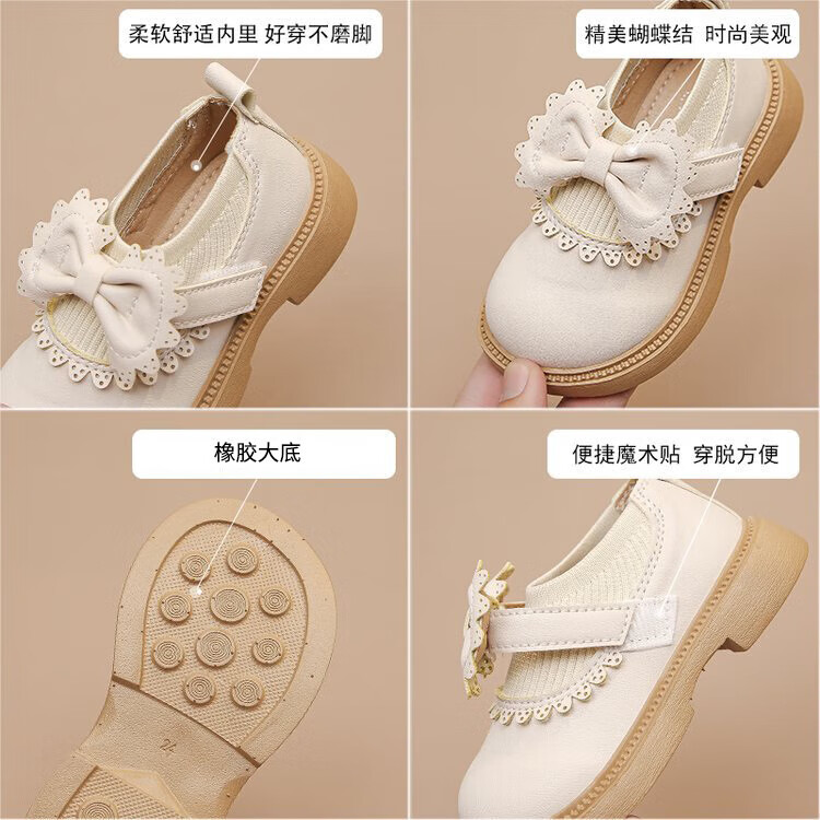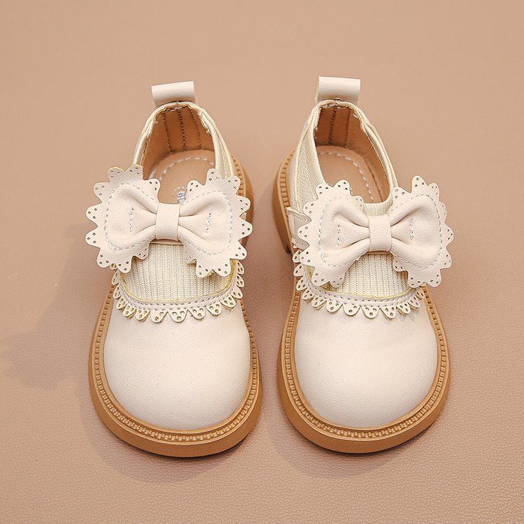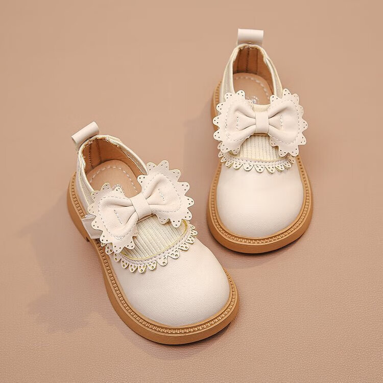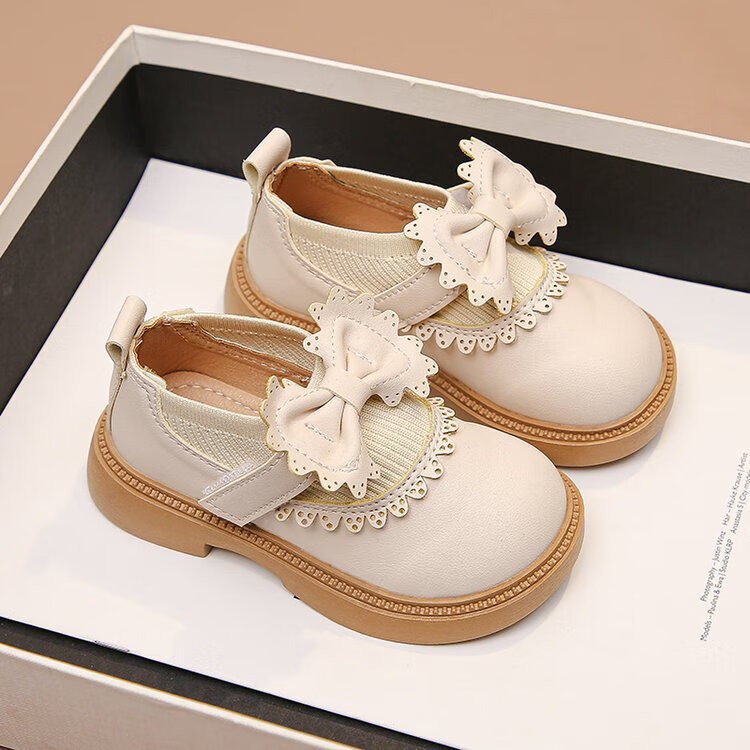 Bangboshi Girls' Small Leather Shoes Princess Shoes 2026 Four Seasons New British Style Girls' Versatile Soft Sole Performance and School Wear Single Shoes Bow-Off-White Size 28 Inner Length 17.4cm