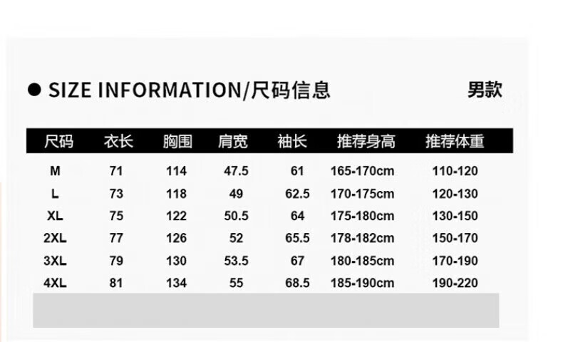 China (cm) 165 / 88-90 170 / 96-98 175 / 108-110 180 / 118-122 185 / 126-130