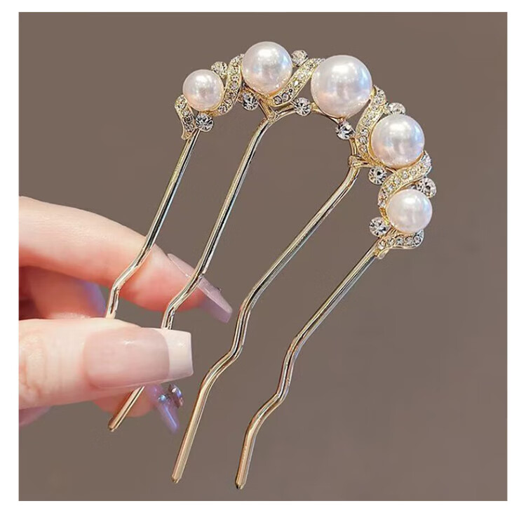 Qiao丂 Pearl U-shaped hairpin 2 packs, four-tooth comb hair fixing artifact hairpin hairpin hair accessories for women, gold + gun black, 2 packs