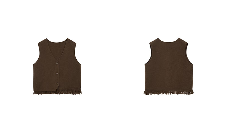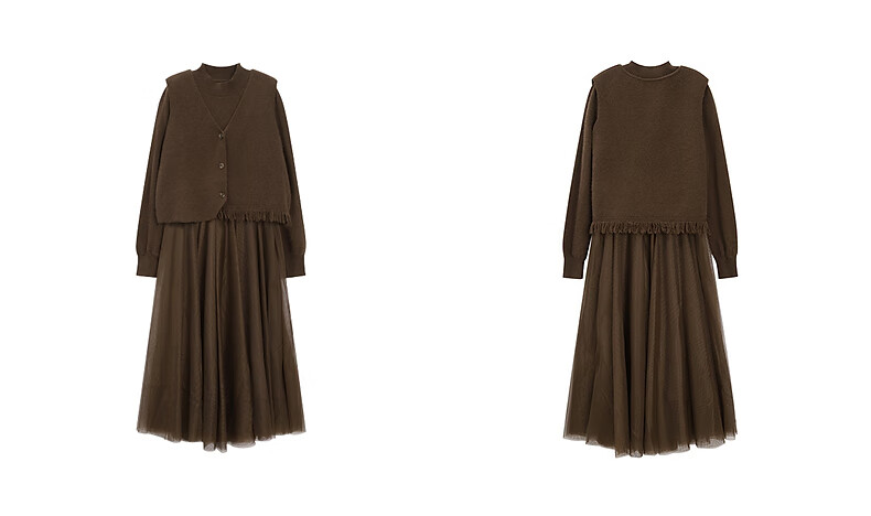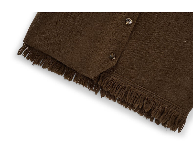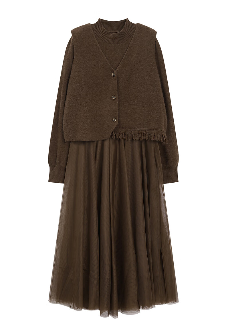 Fragment (dribs&drabs) suit for women winter new v-neck simple tassel stacked vest half high collar splicing elegant long skirt dark coffee L