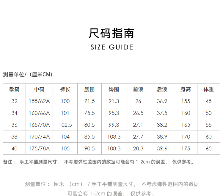 China (cm) 160-165/84-86 165-170 / 88-90 167-172 / 92-96 168-173 / 98-102 170-176 / 106-110