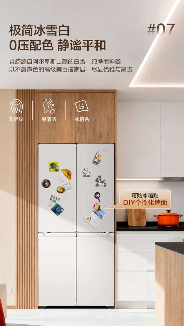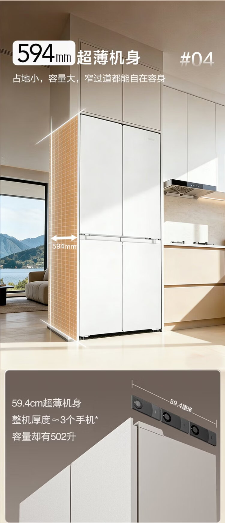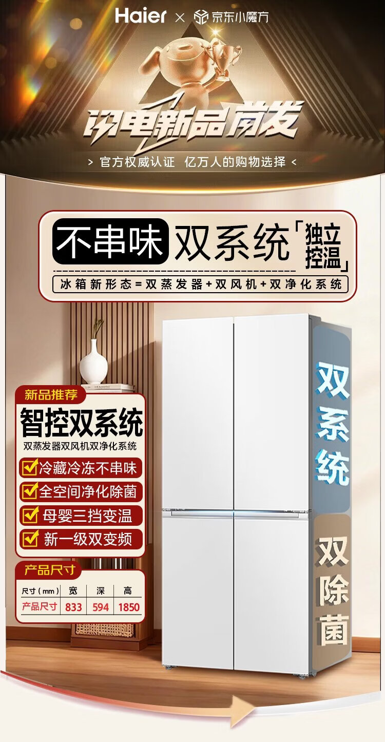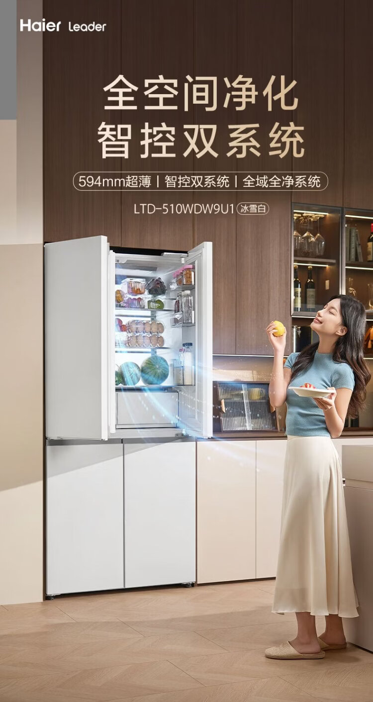Haier Haier refrigerator produces a cross-shaped four-door dual-system dual-cycle air-cooled frost-free first-class energy efficiency state-subsidized ultra-thin inverter household large-capacity fresh-keeping refrigerator, ice and snow white 502 liters, dual systems without odor, full space purification