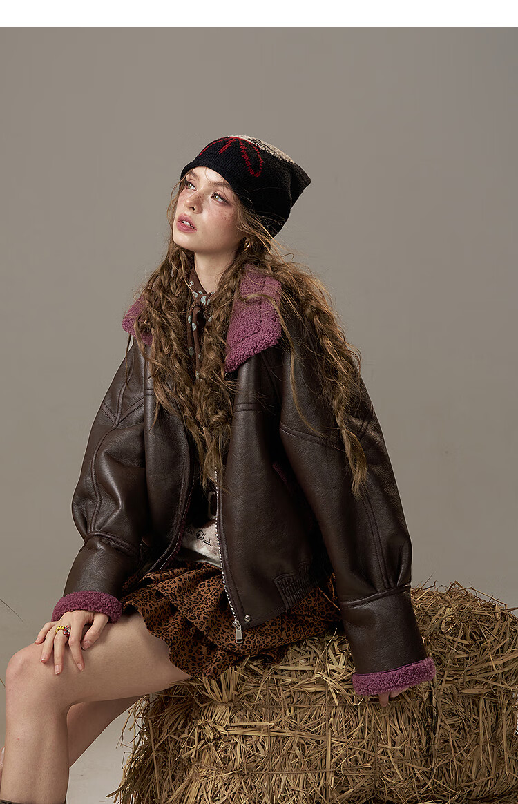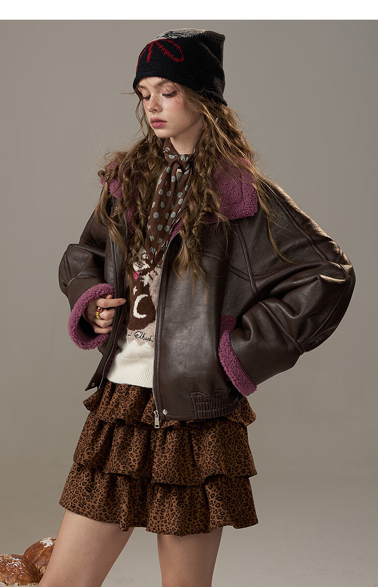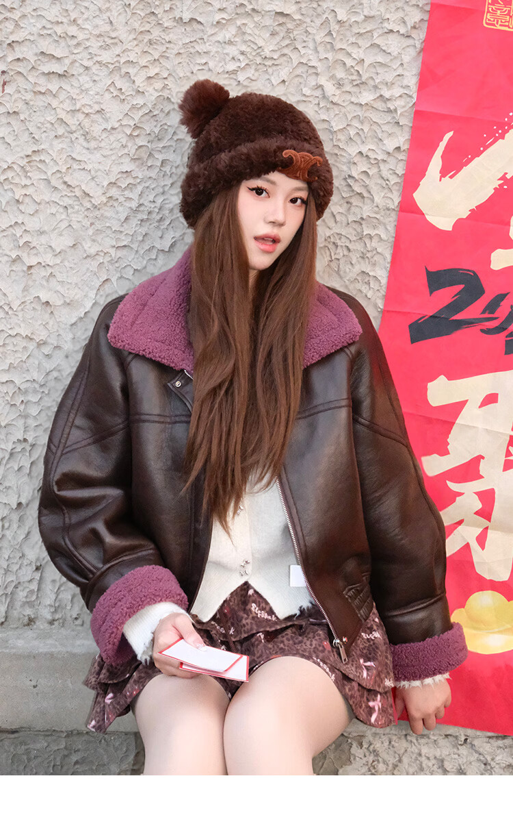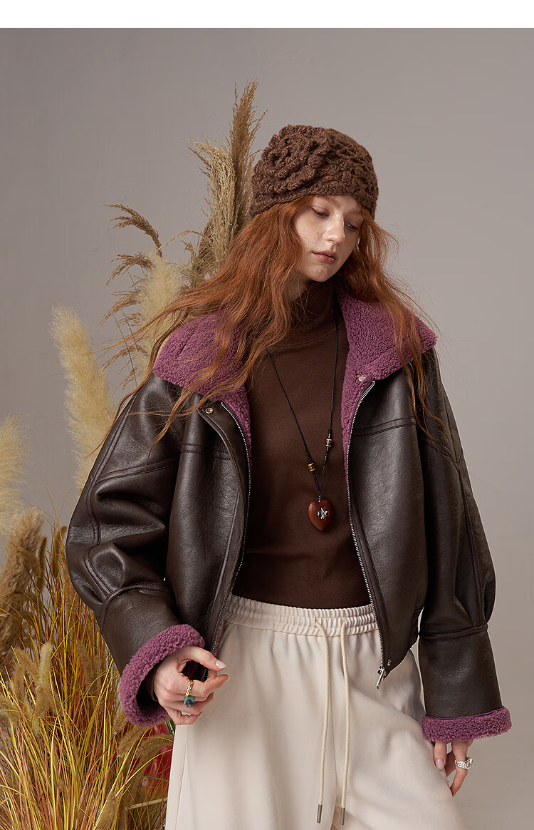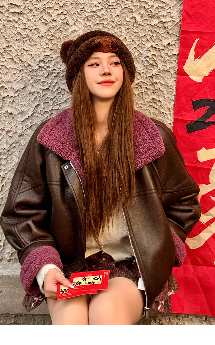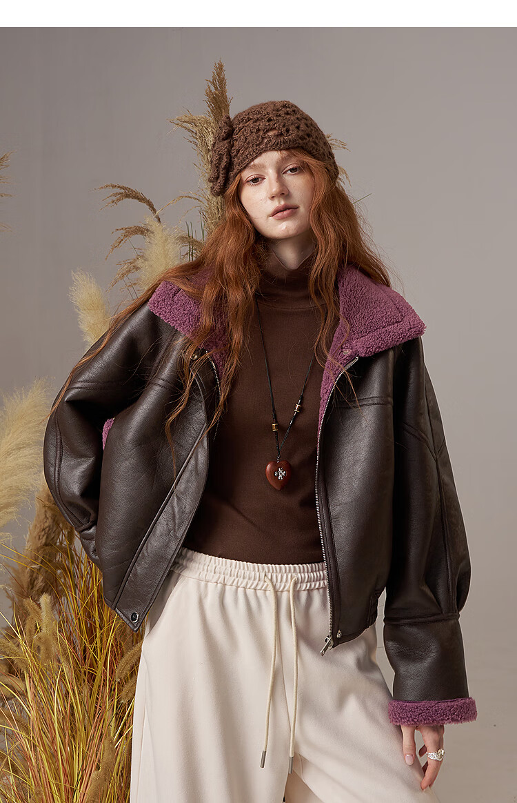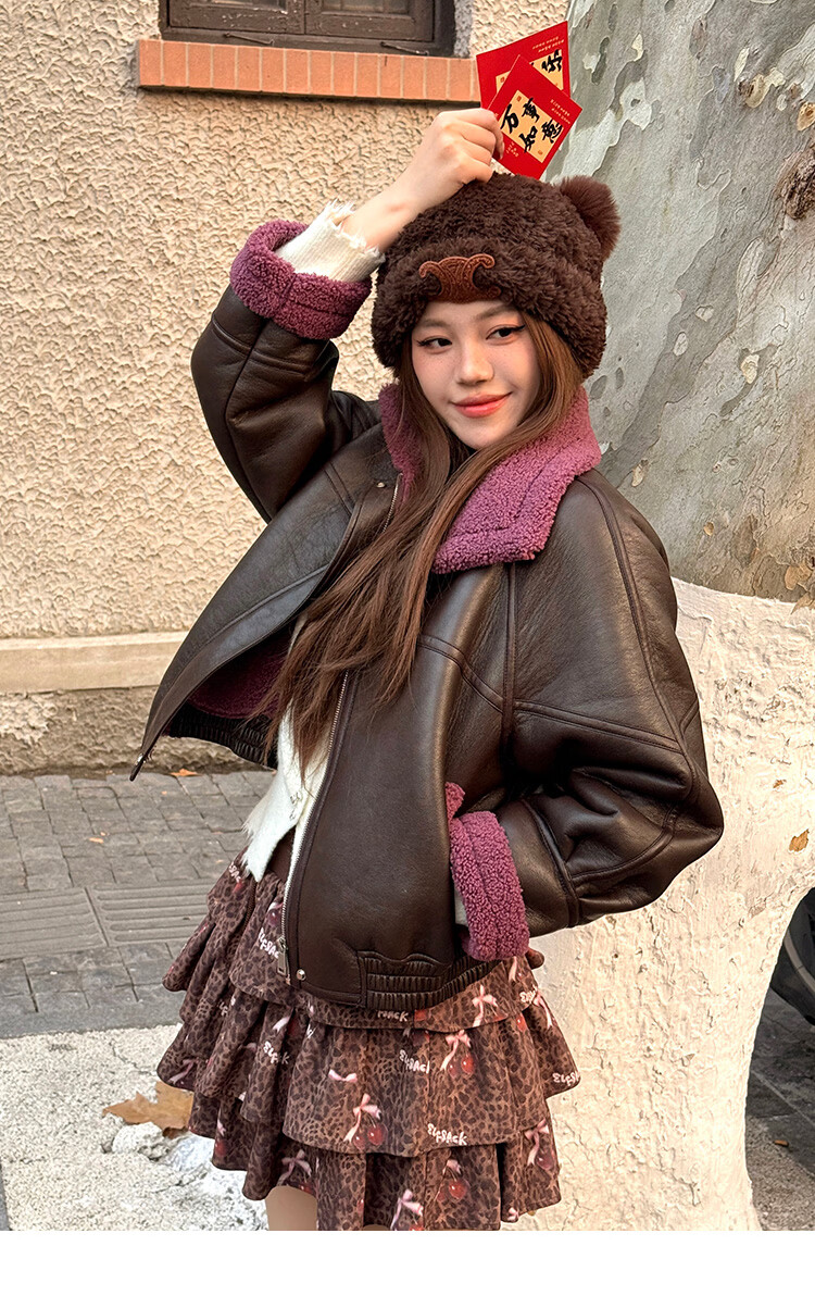 Fairy's Pocket Retro Jacket Plush Cotton Leather Jacket Women's 2025 Winter New Contrast Color Fur One-piece Jacket Retro Brown L
