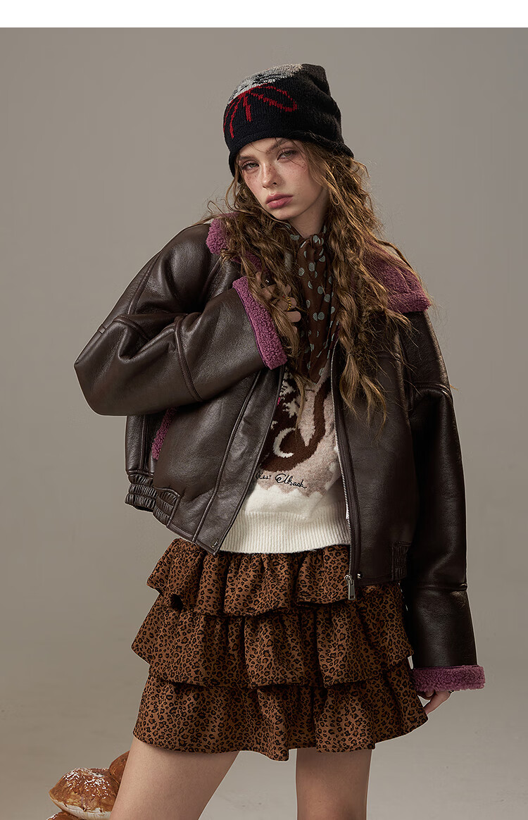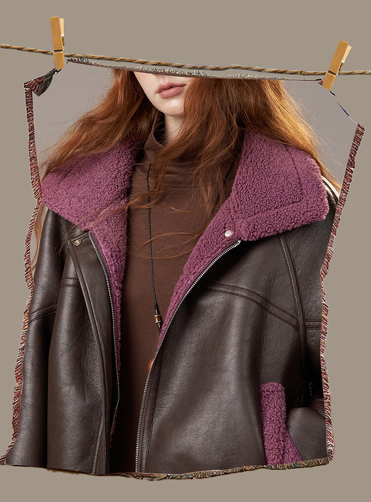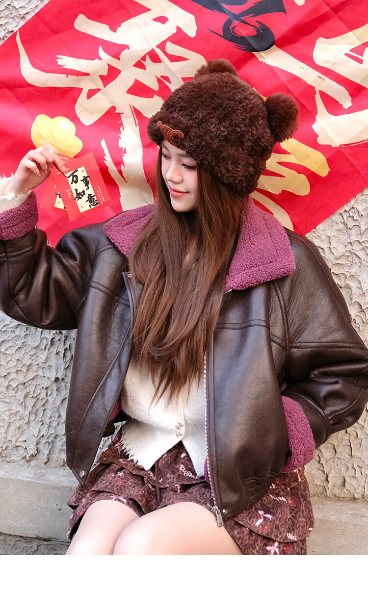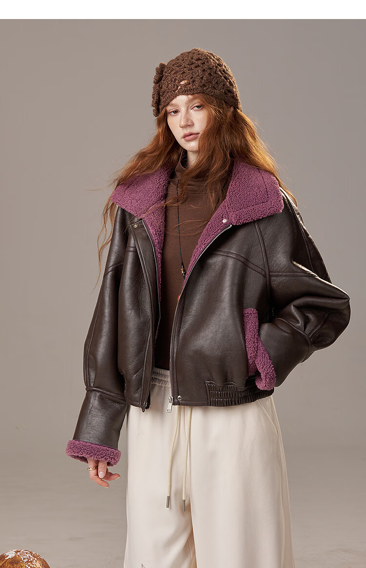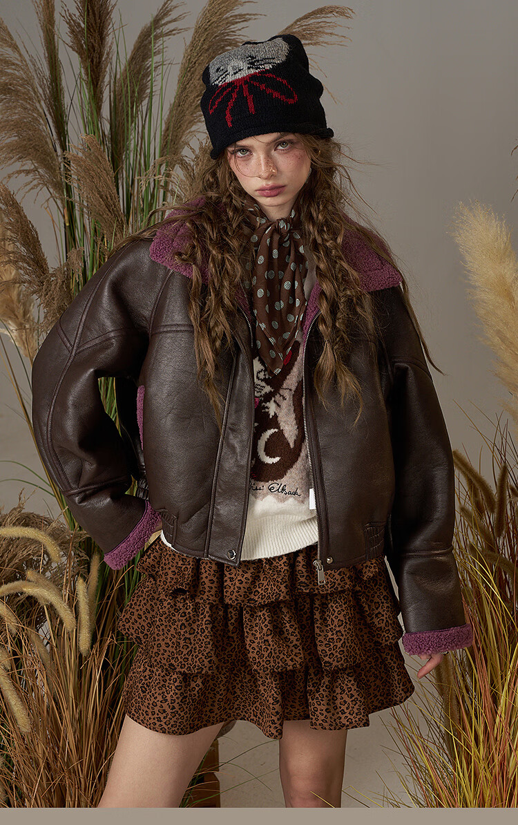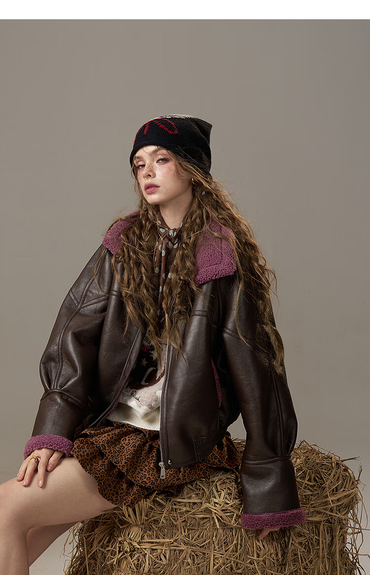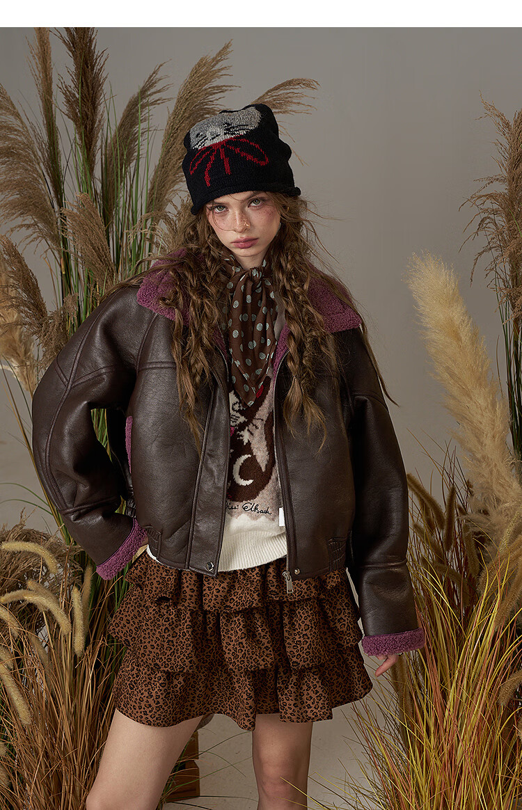 Fairy's Pocket Retro Jacket Plush Cotton Leather Jacket Women's 2025 Winter New Contrast Color Fur One-piece Jacket Retro Brown L
