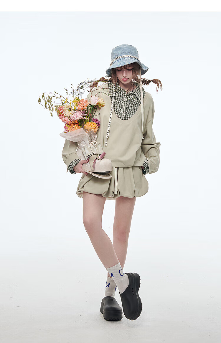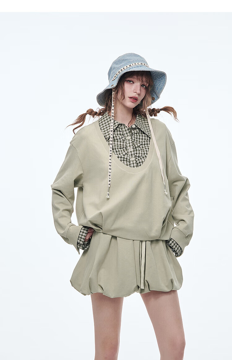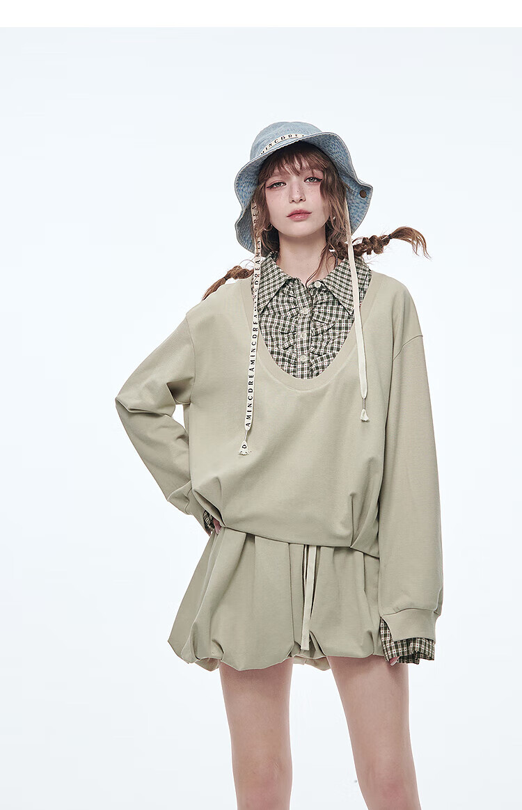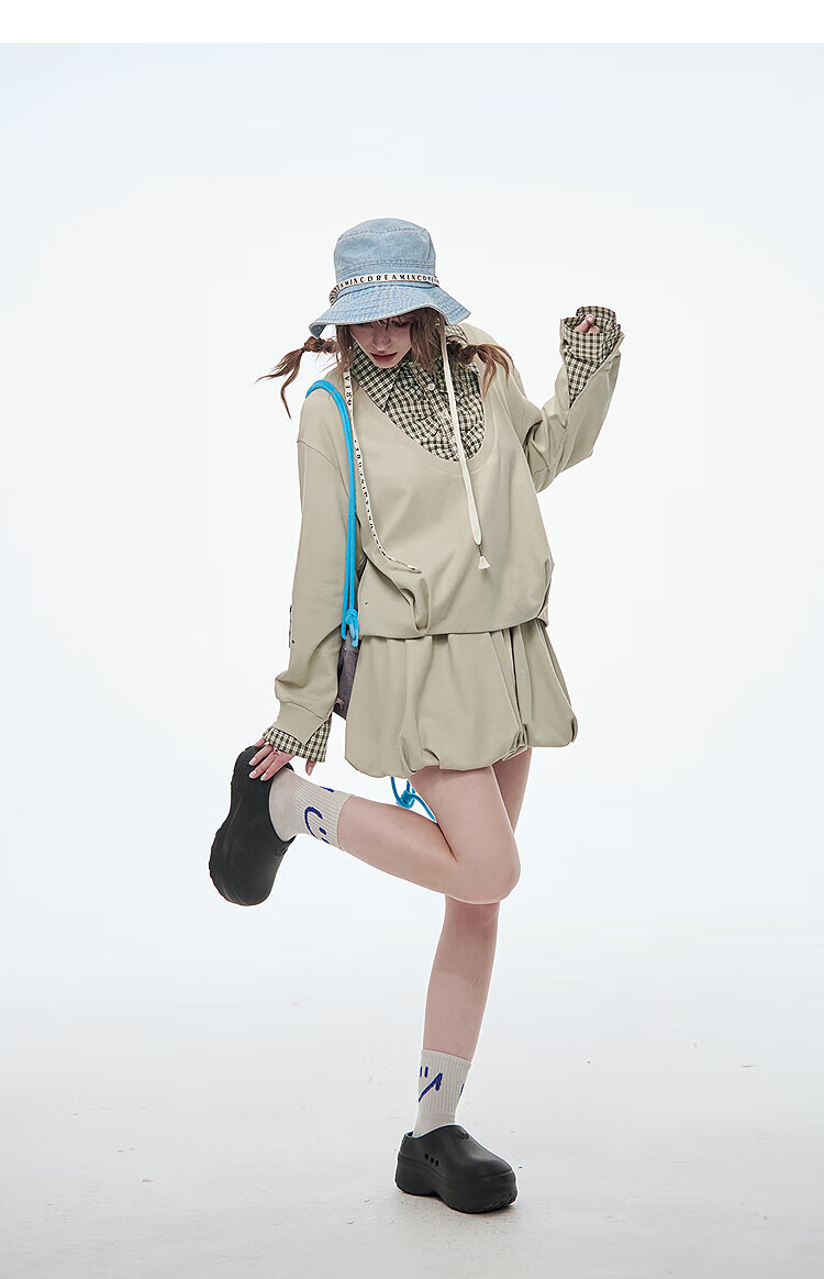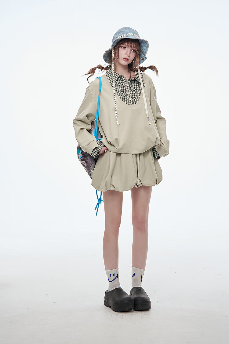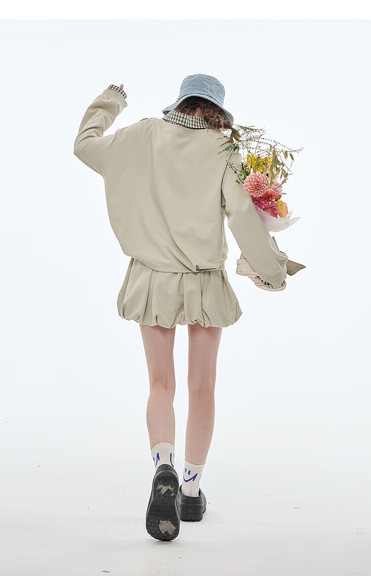 Fairy's pocket plaid splicing sweatshirt two-piece set for women 25 spring new urban sports suit simple beige S
