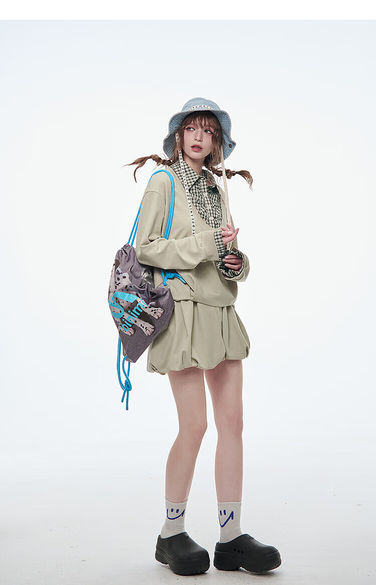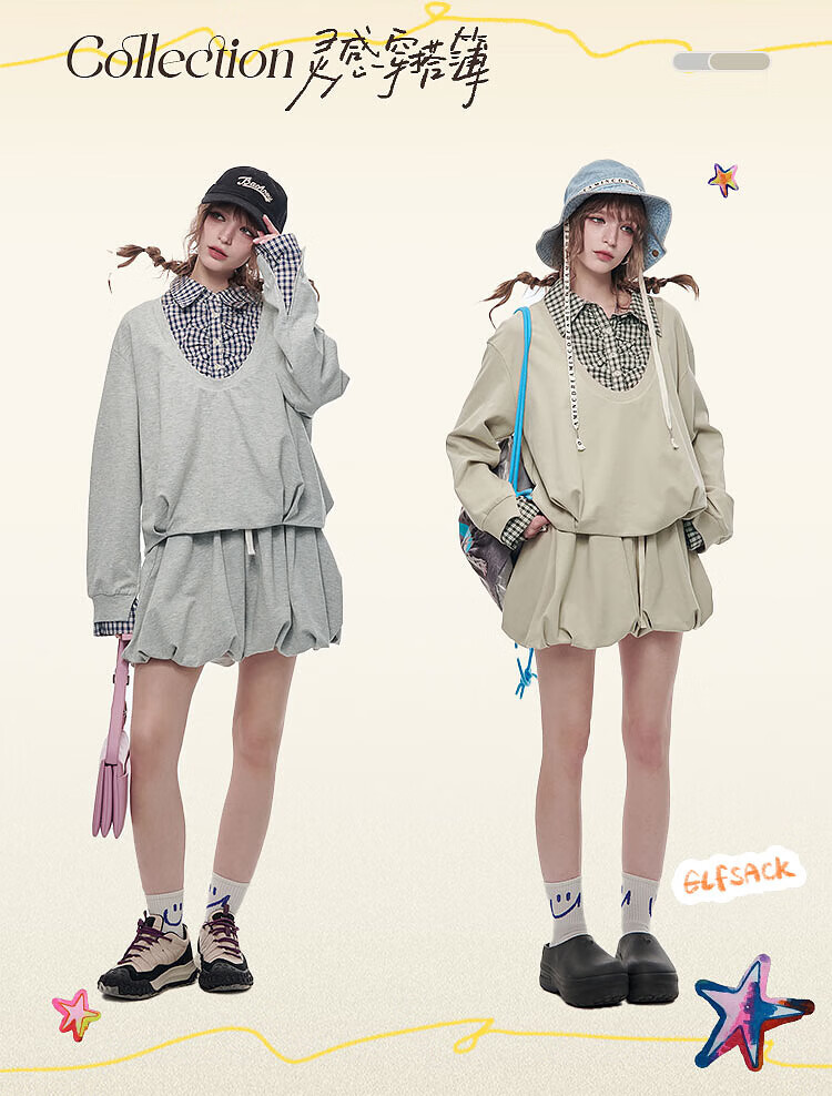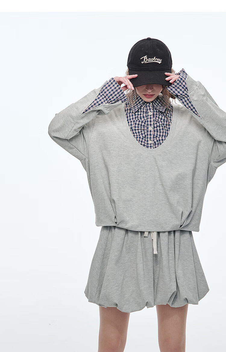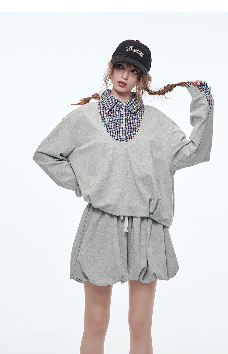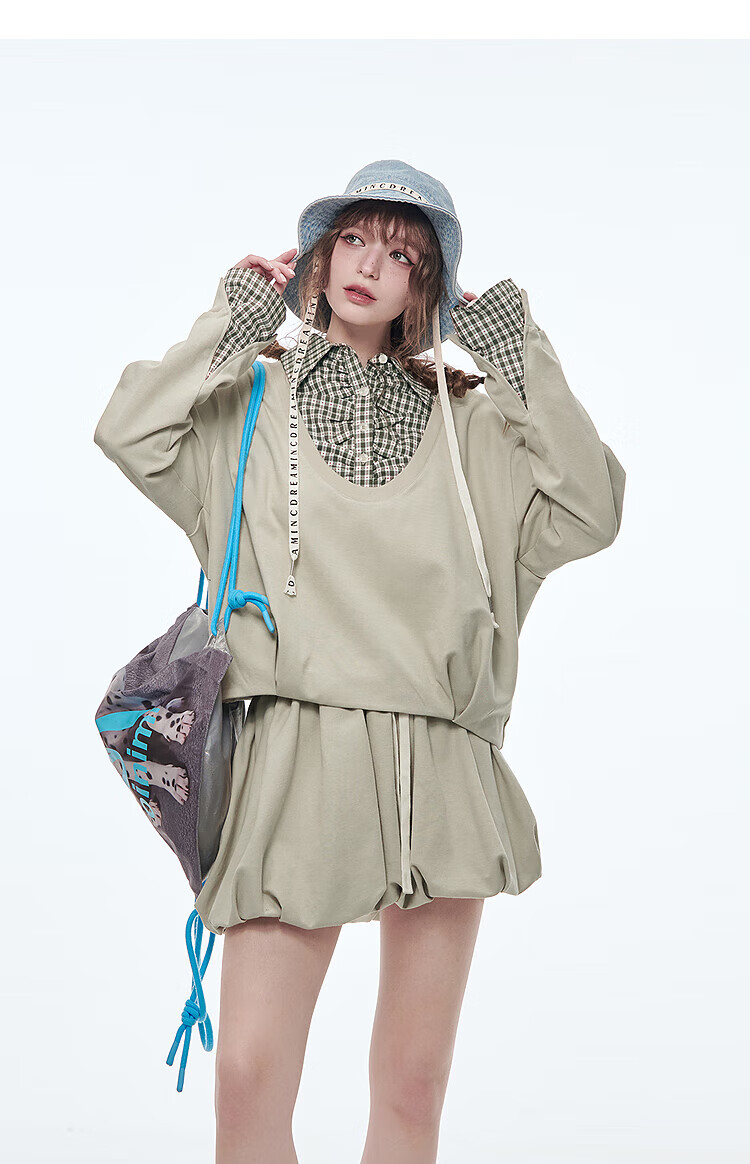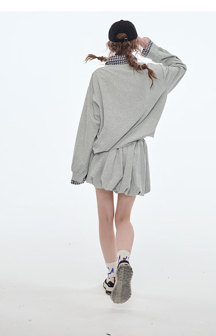 Fairy's pocket plaid splicing sweatshirt two-piece set for women 25 spring new urban sports suit simple beige S