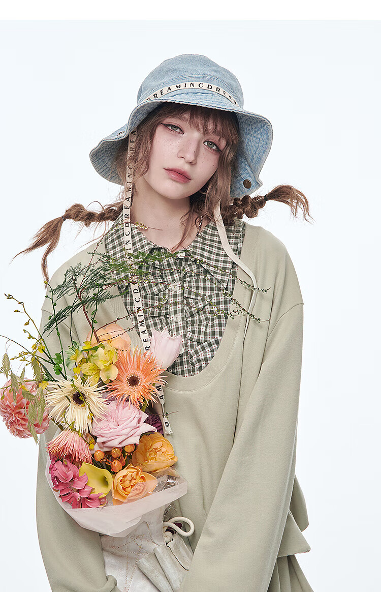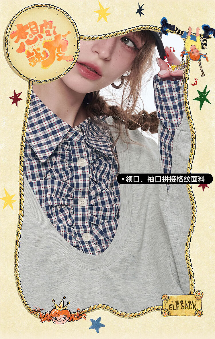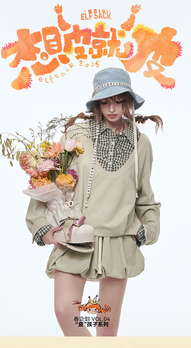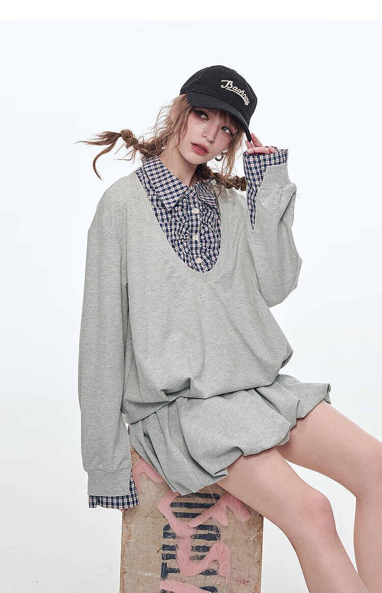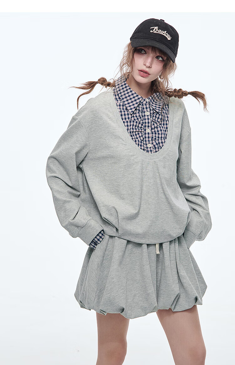 Fairy's pocket plaid splicing sweatshirt two-piece set for women 25 spring new urban sports suit simple beige S