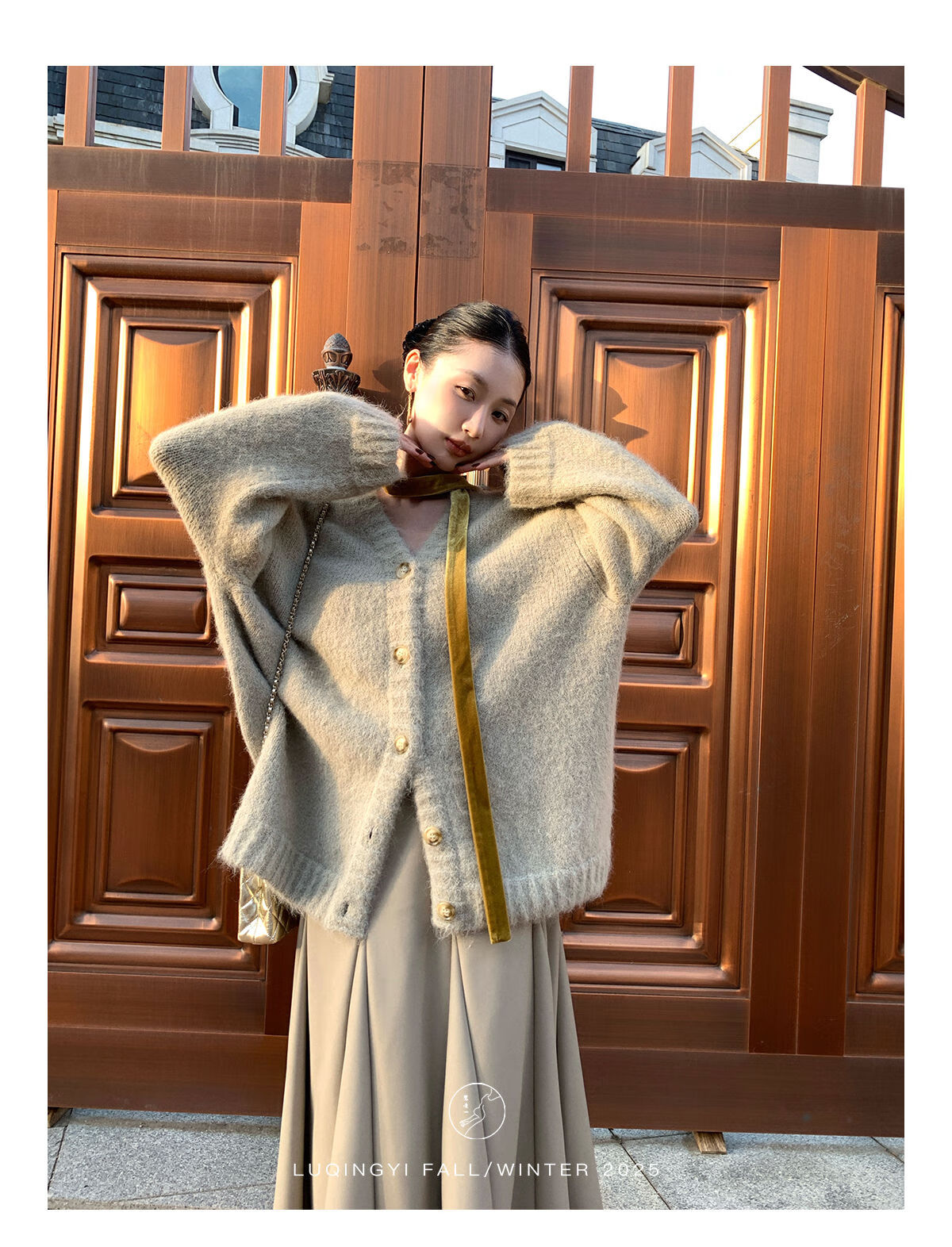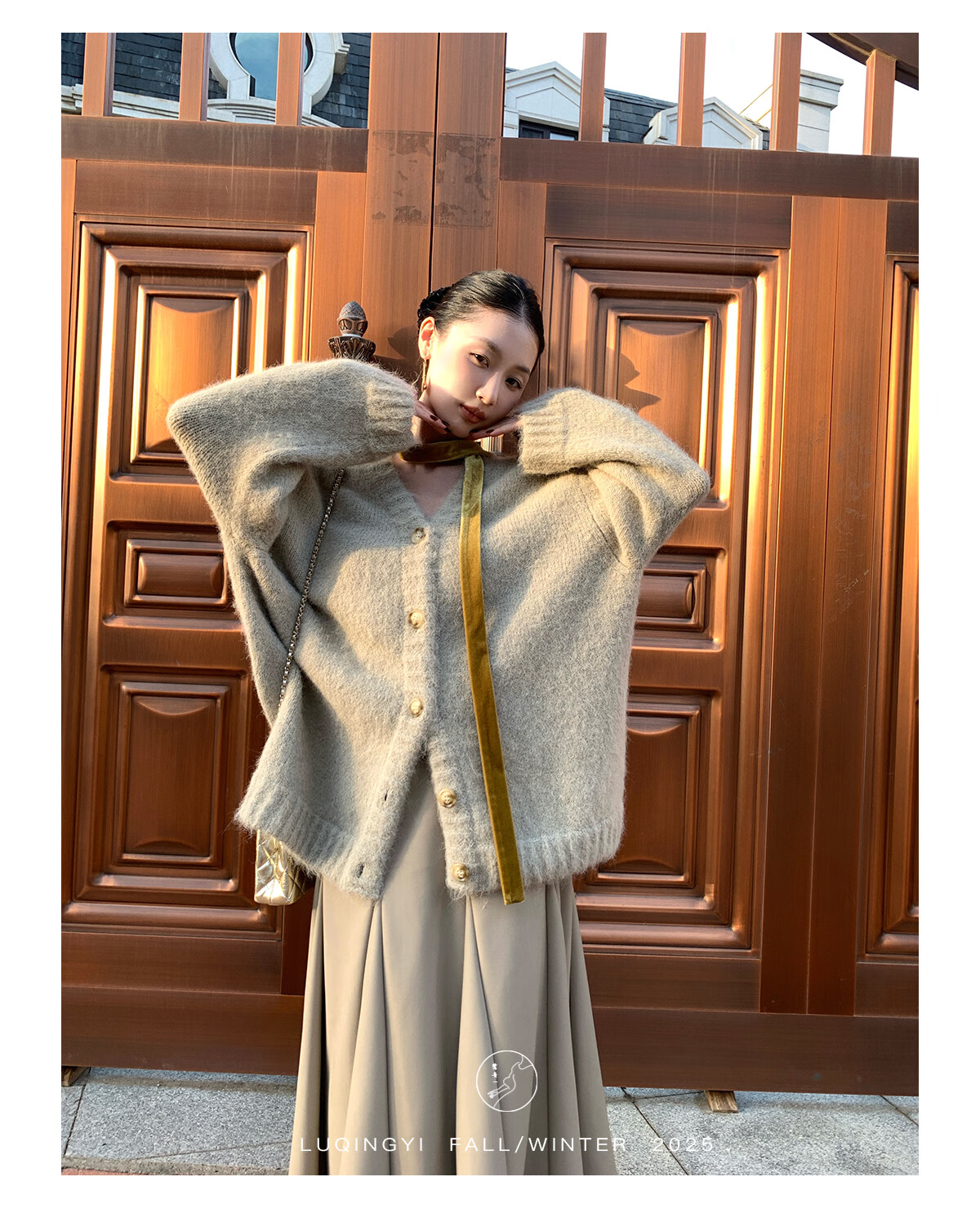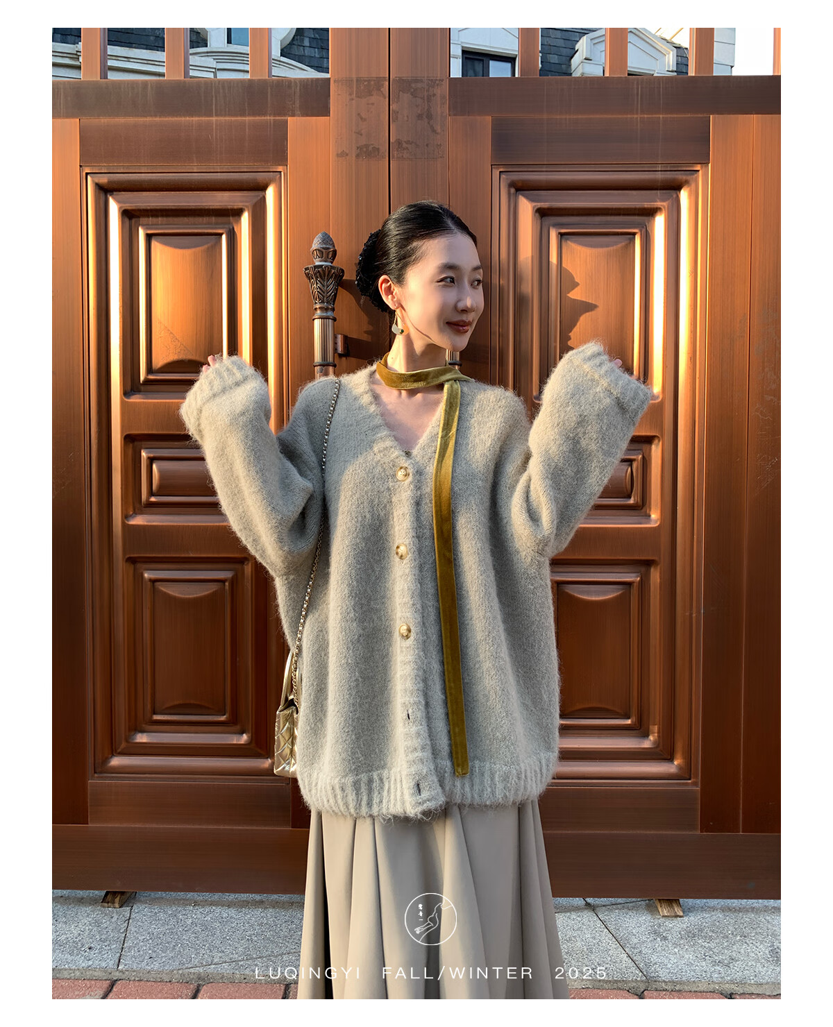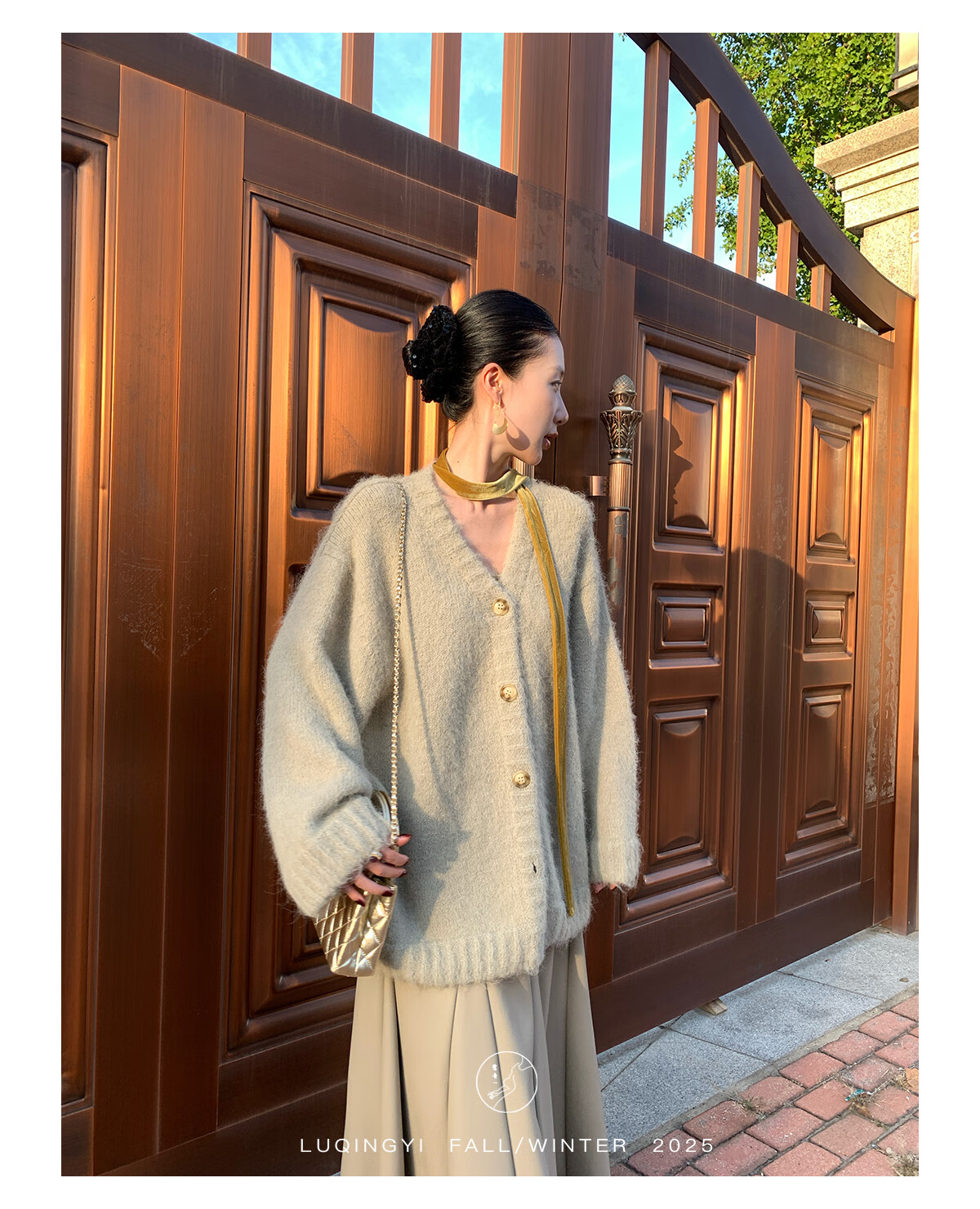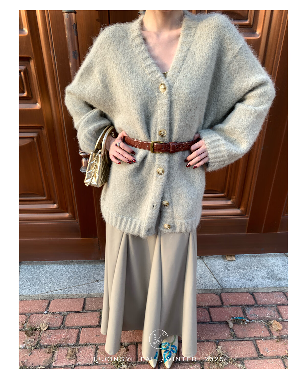 Lu Qingyi Original Chenwai Wool Knitted Sweater Women's Autumn Lazy Wind Brushed Warm Loose V-neck Cardigan Bean Green (Second Batch) M Wear for Photos