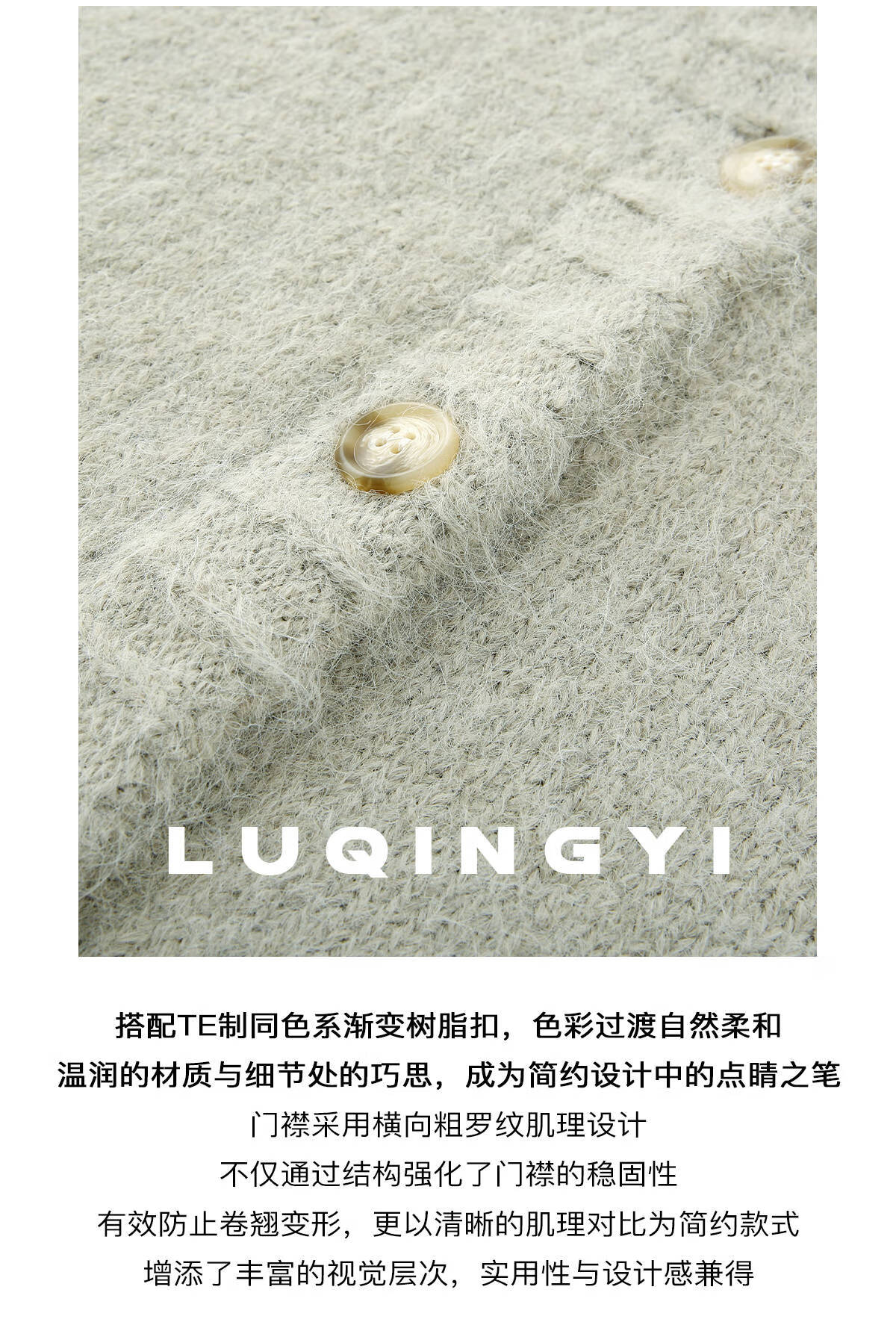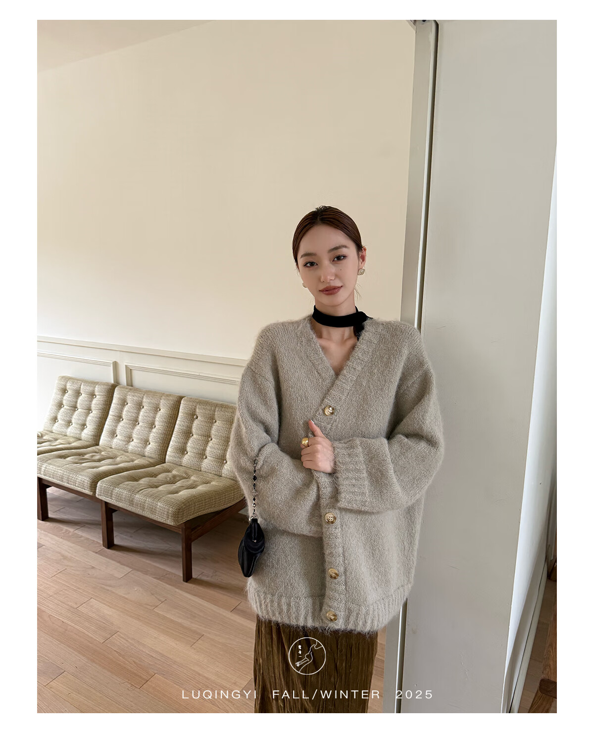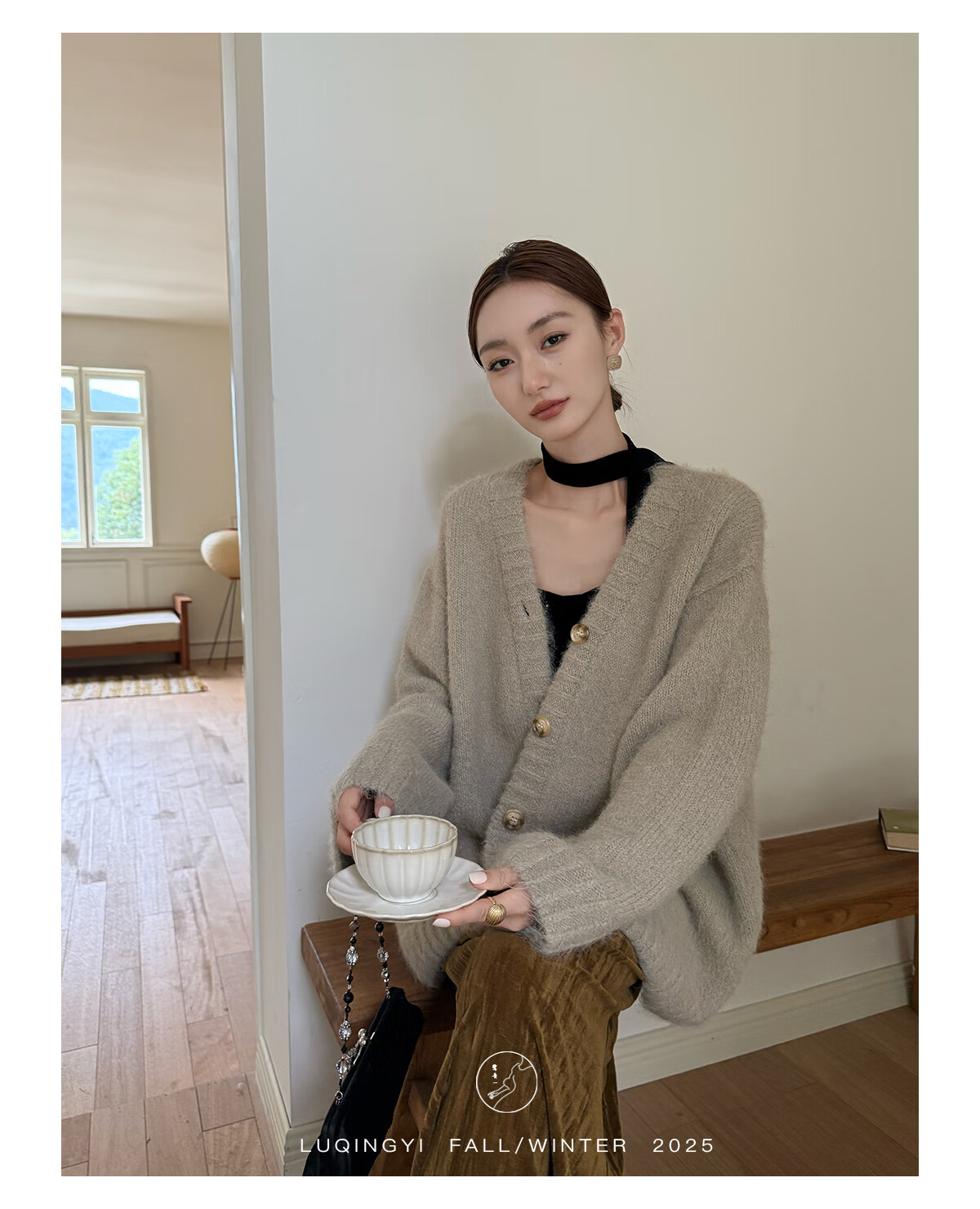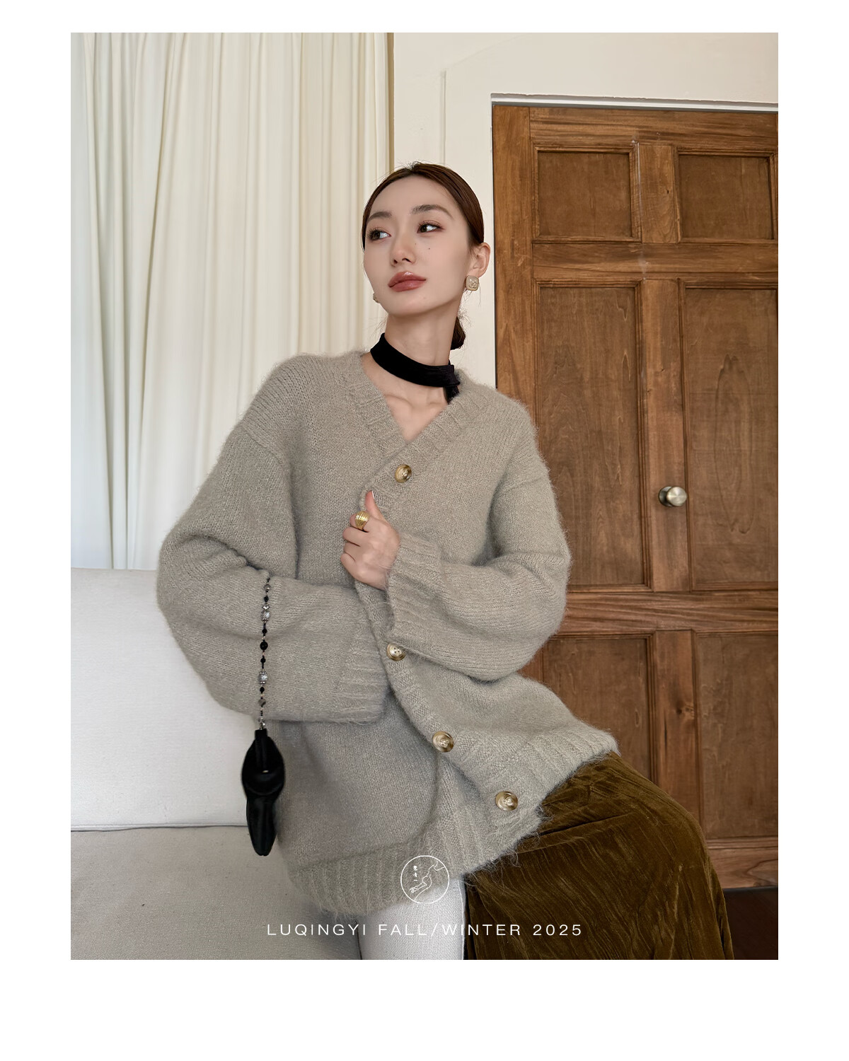 Lu Qingyi Original Chenwai Wool Knitted Sweater Women's Autumn Lazy Wind Brushed Warm Loose V-neck Cardigan Bean Green (Second Batch) M Wear for Photos