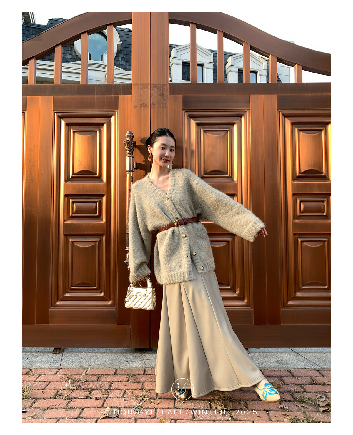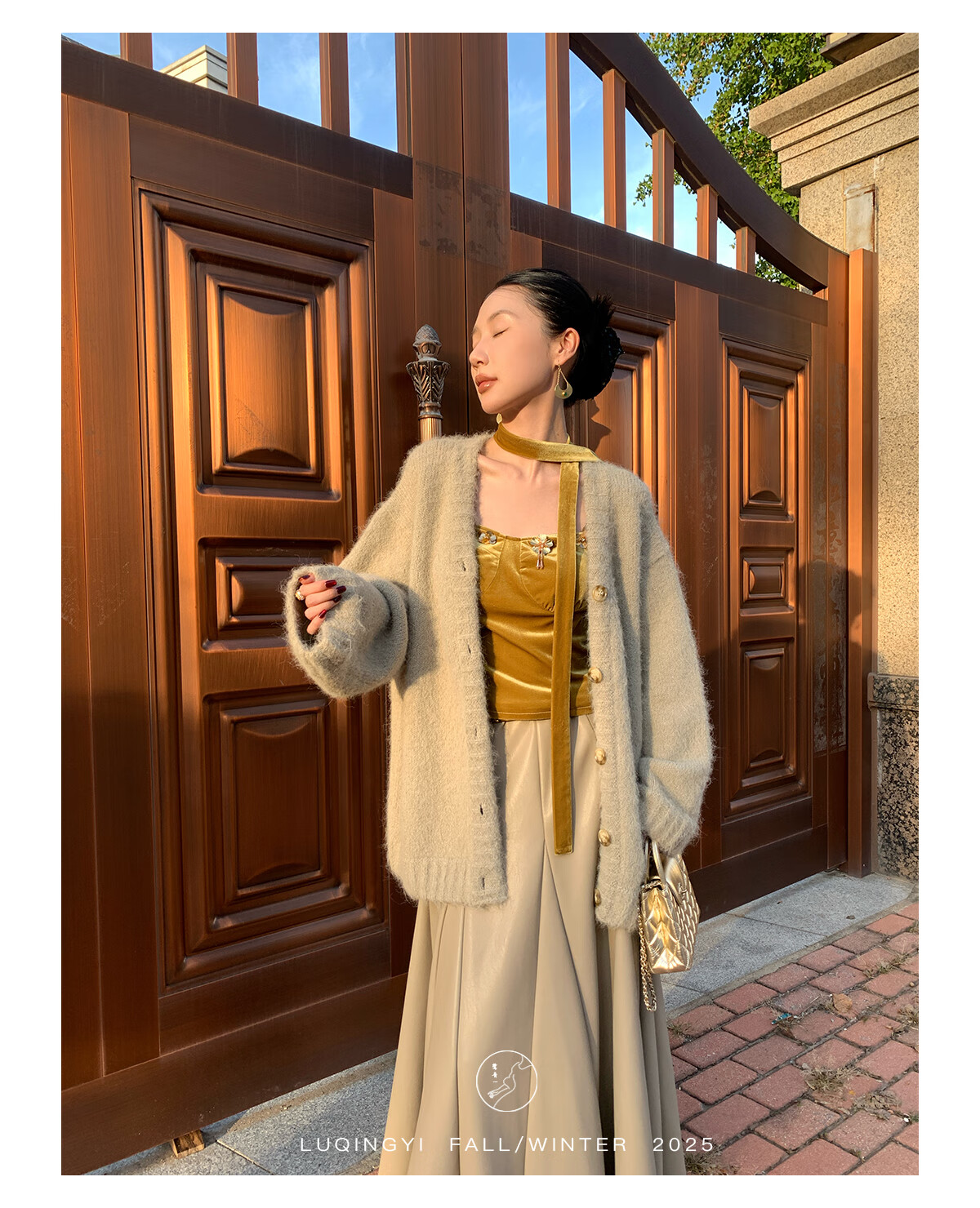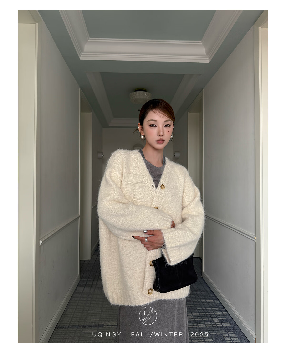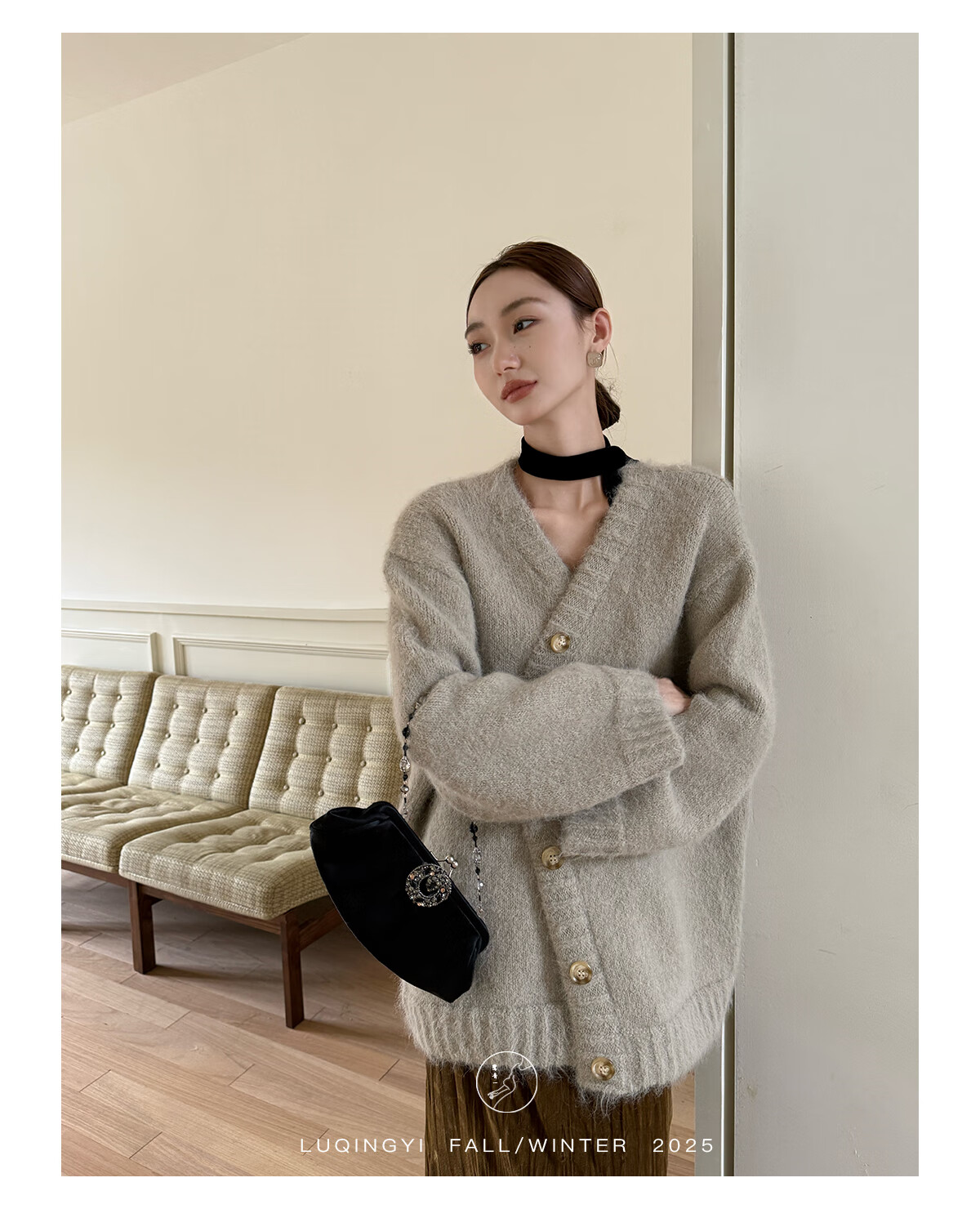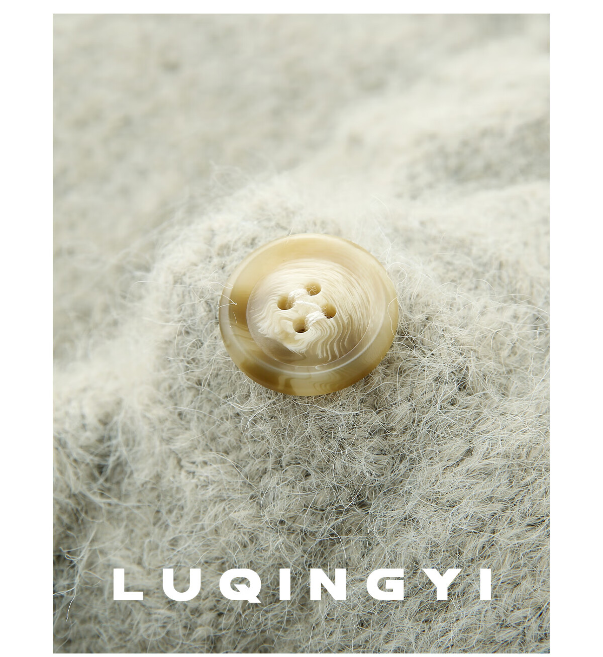 Lu Qingyi Original Chenwai Wool Knitted Sweater Women's Autumn Lazy Wind Brushed Warm Loose V-neck Cardigan Bean Green (Second Batch) M Wear for Photos