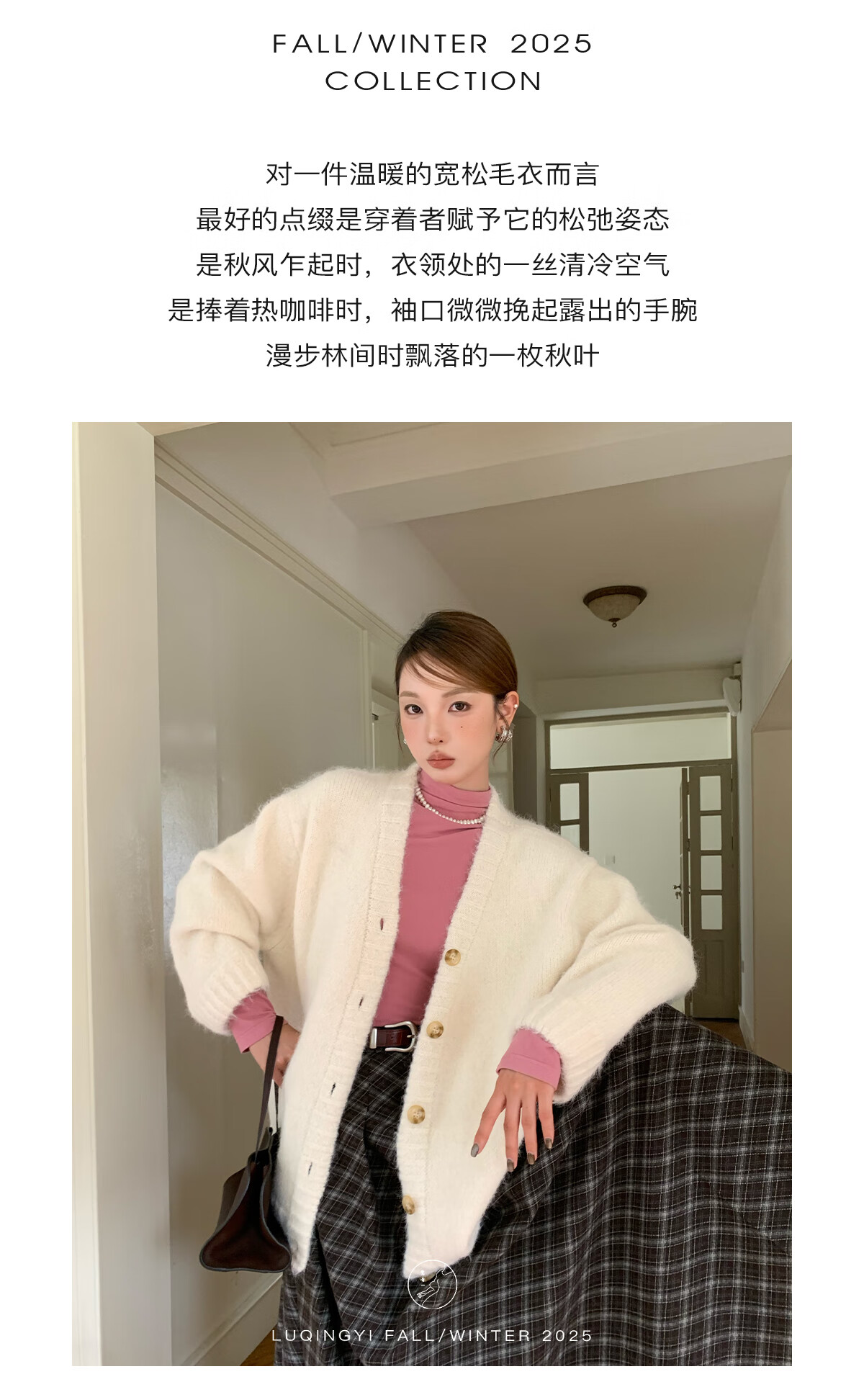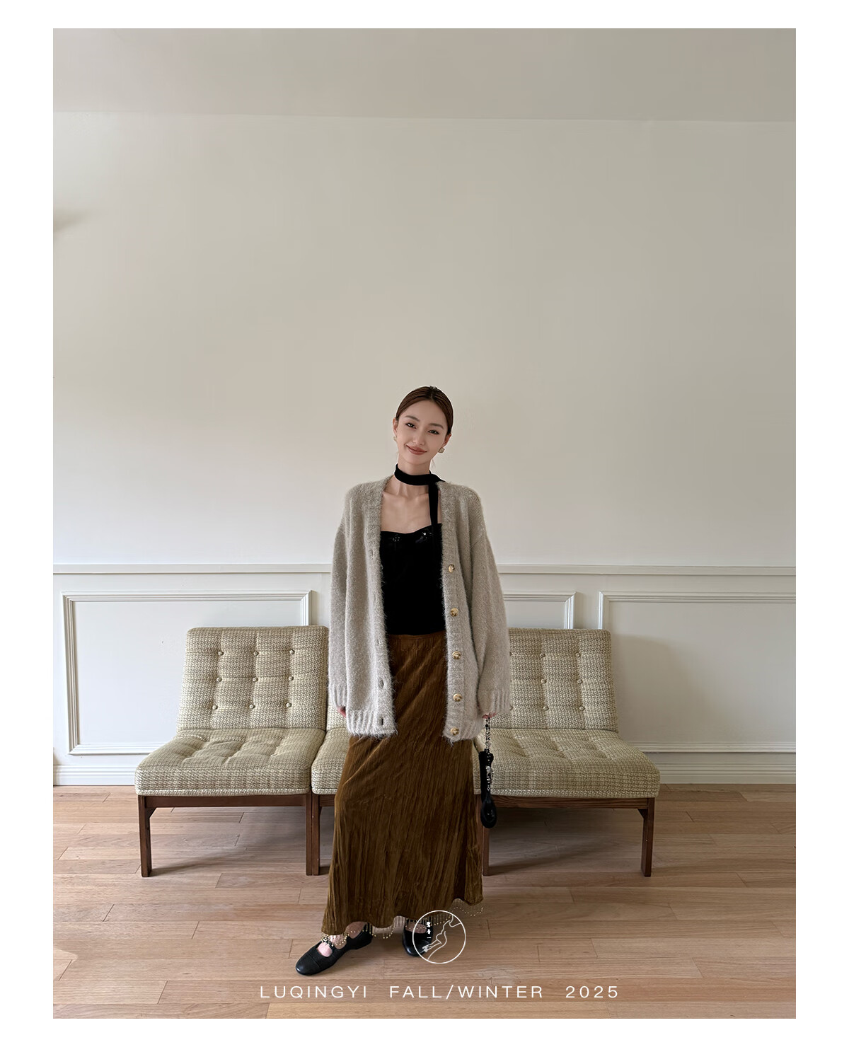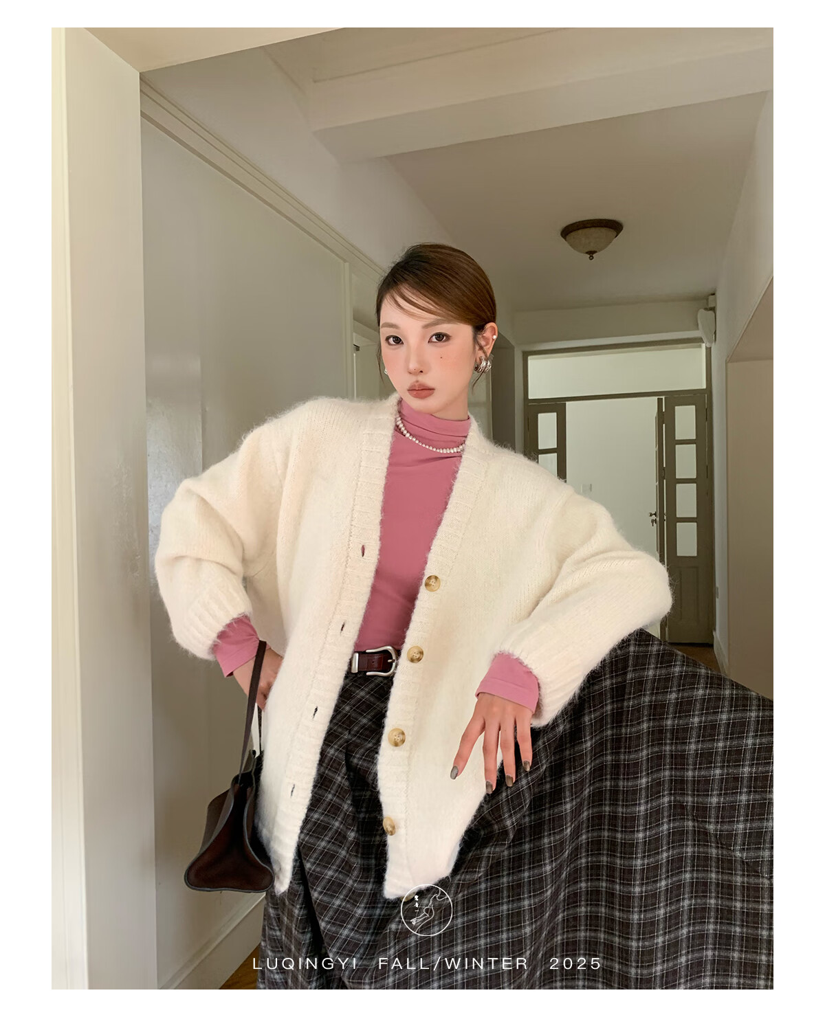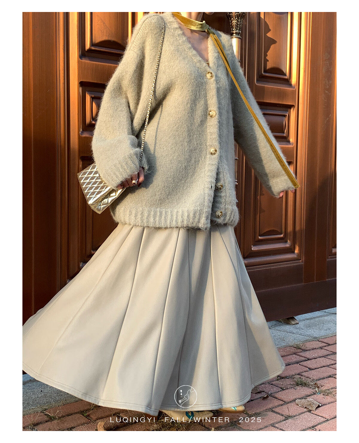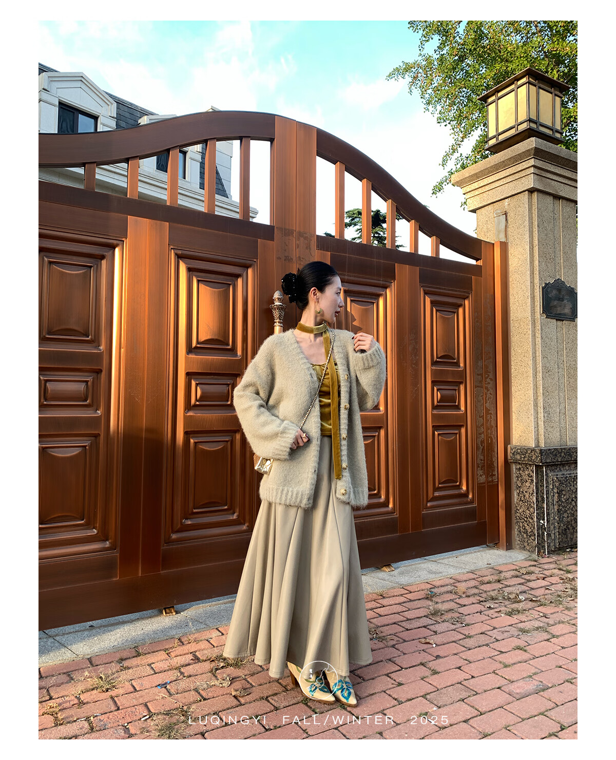 Lu Qingyi Original Chenwai Wool Knitted Sweater Women's Autumn Lazy Wind Brushed Warm Loose V-neck Cardigan Bean Green (Second Batch) M Wear for Photos