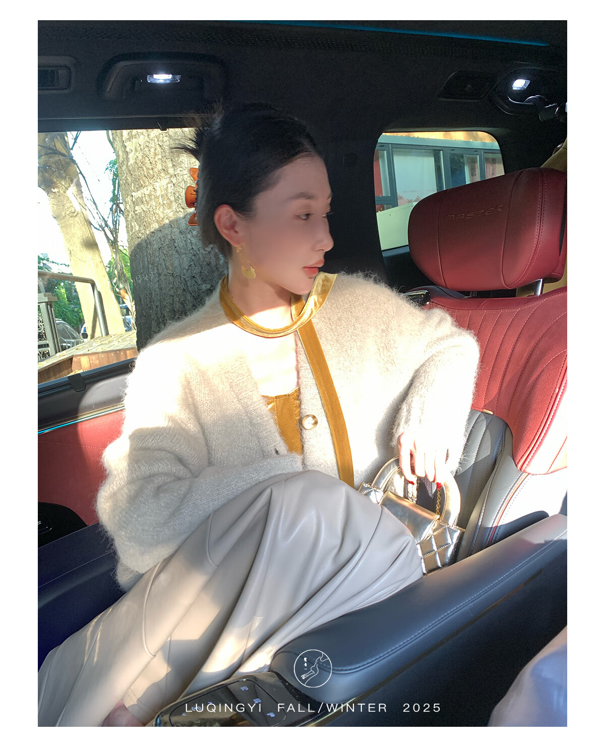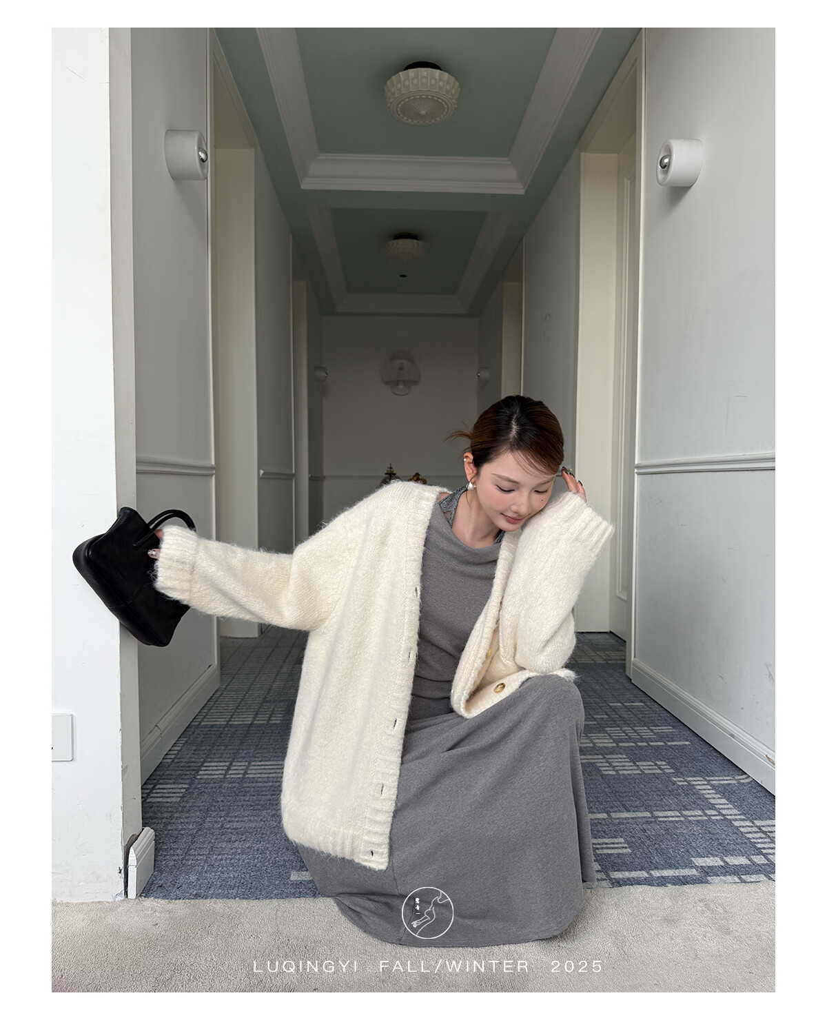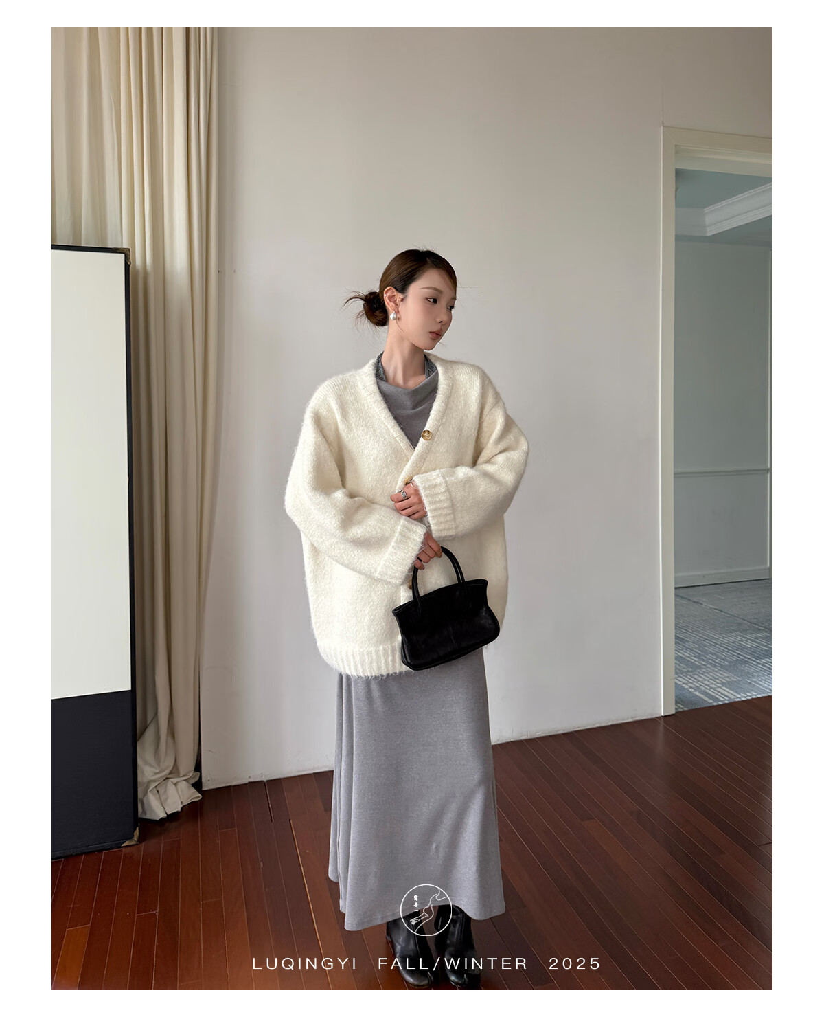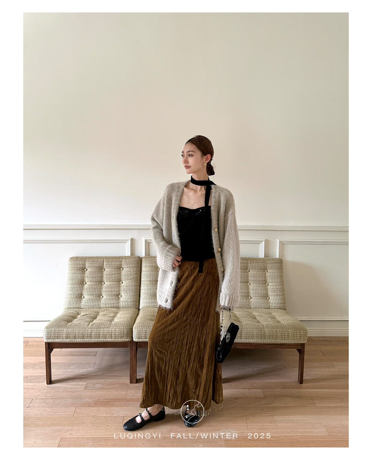 Lu Qingyi Original Chenwai Wool Knitted Sweater Women's Autumn Lazy Wind Brushed Warm Loose V-neck Cardigan Bean Green (Second Batch) M Wear for Photos