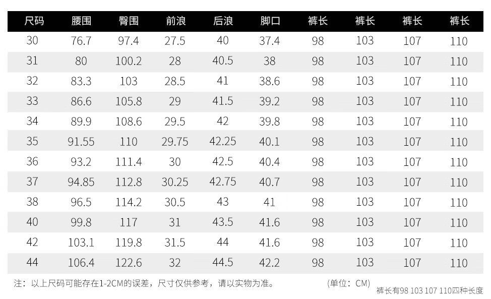 Outseam (cm) 99 cm 101.5 cm 104 cm 106.5 cm 109 cm