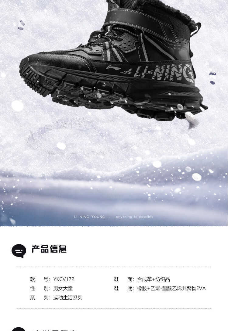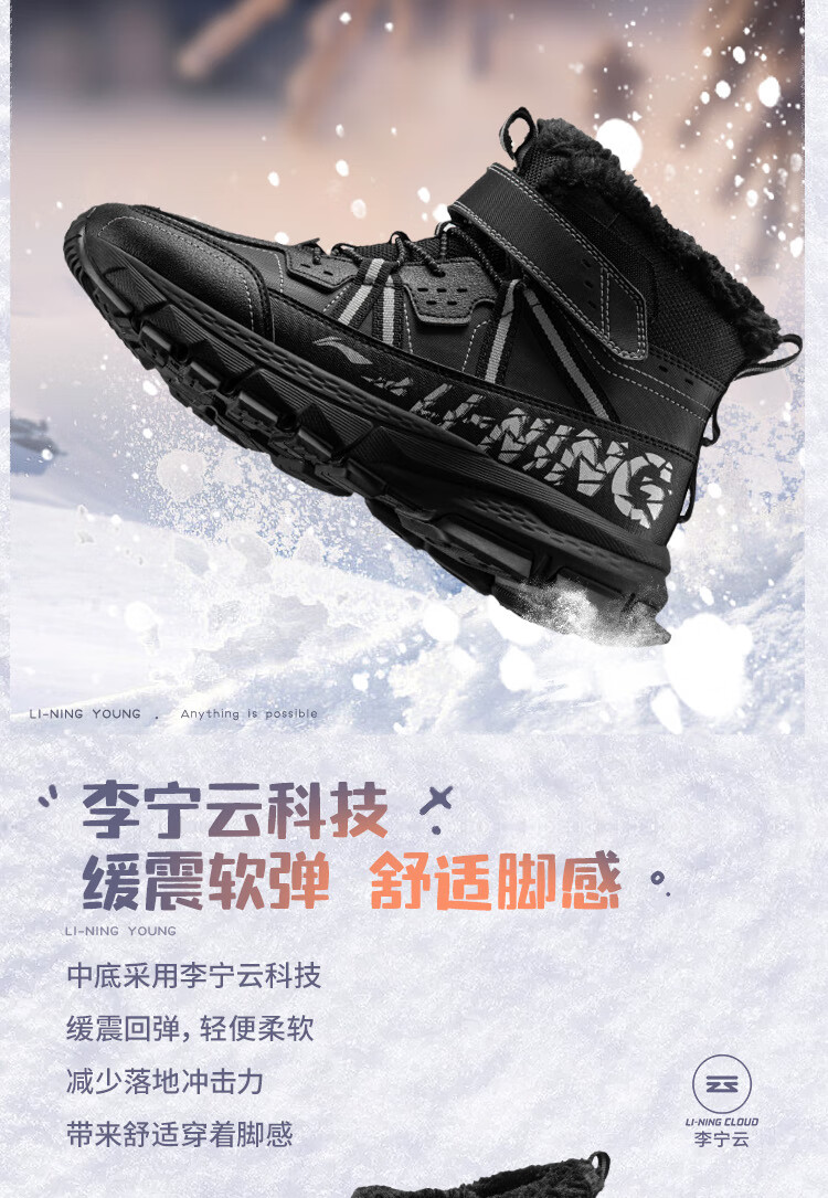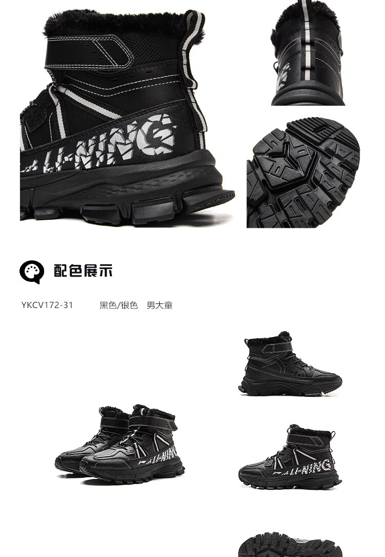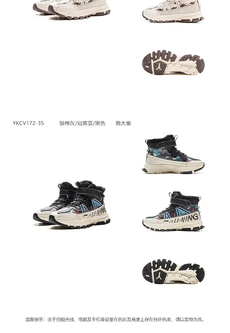 Li Ning children's shoes, children's cotton shoes, men's and women's warm 2 plus velvet warm shock-absorbing rebound high-top sports shoes YKCV172 silver birch gray/crown blue/black-35 34