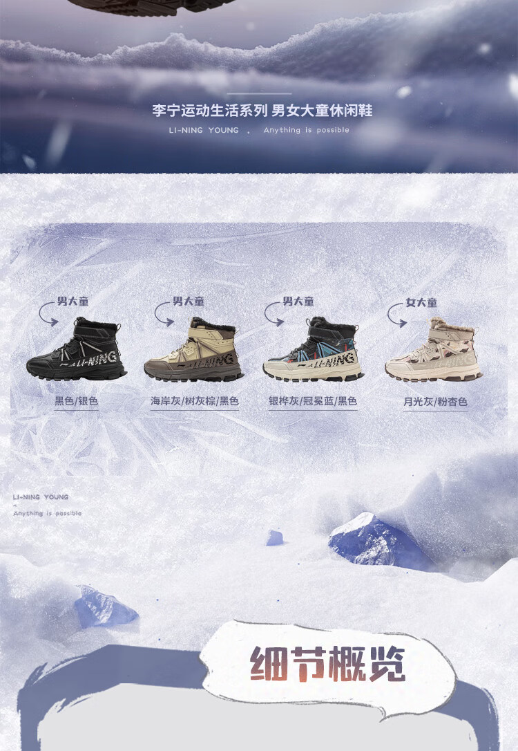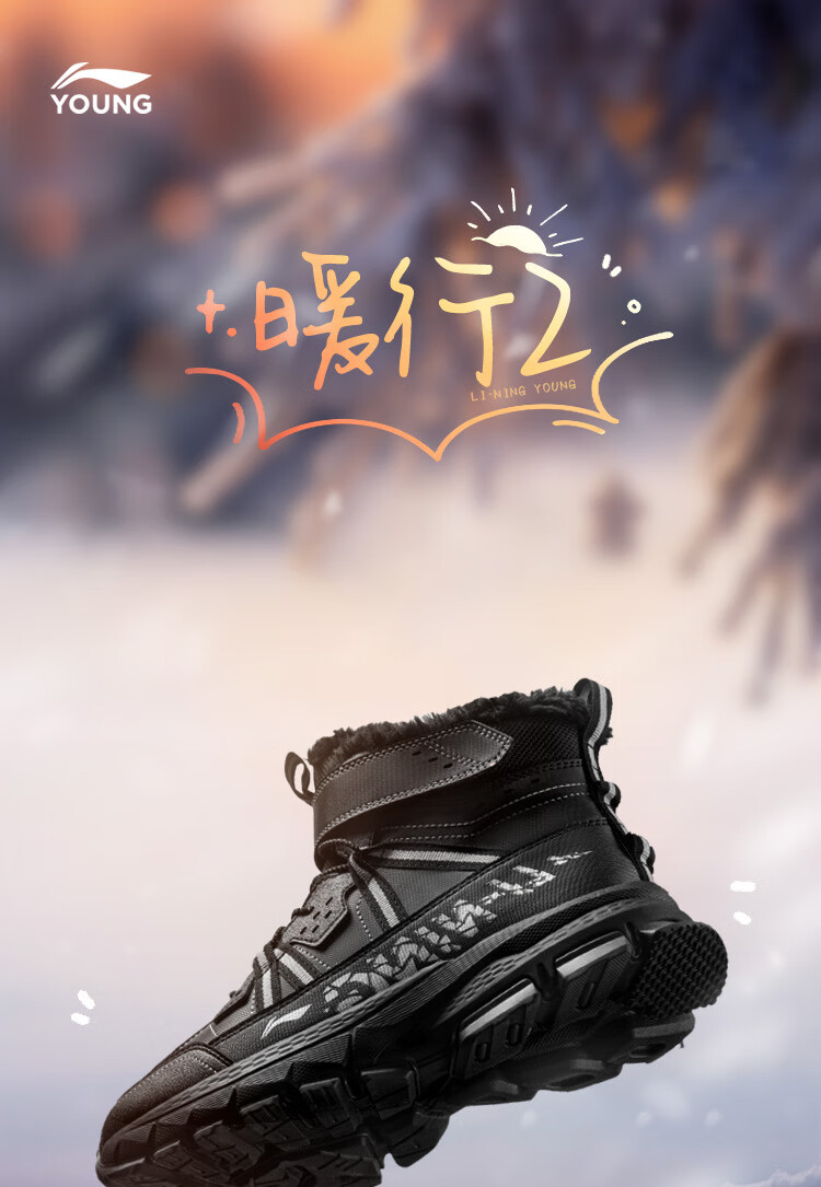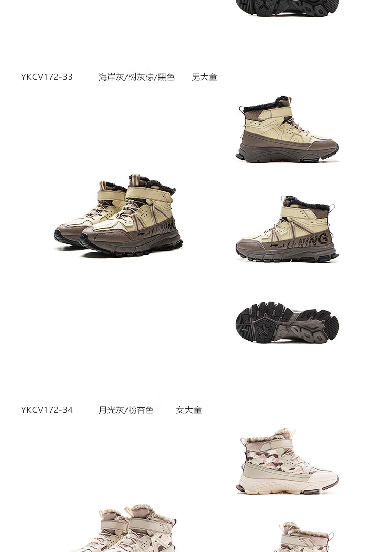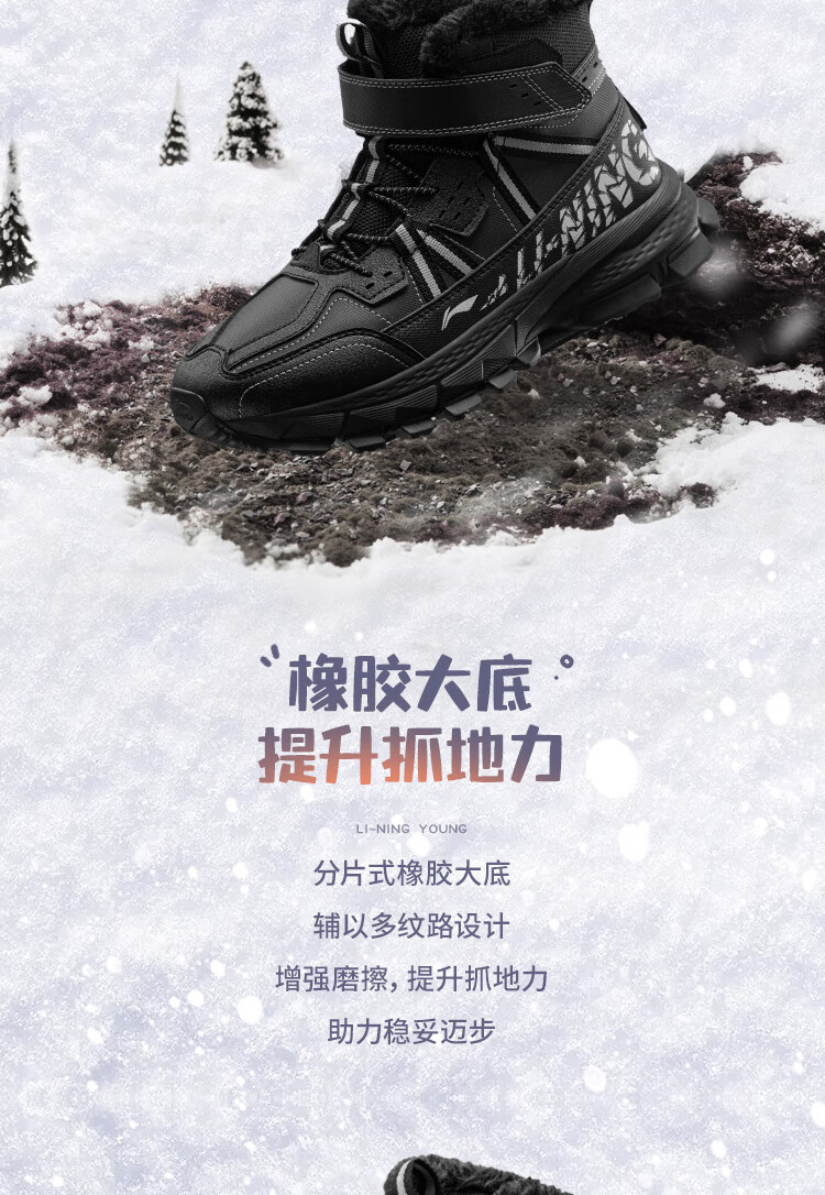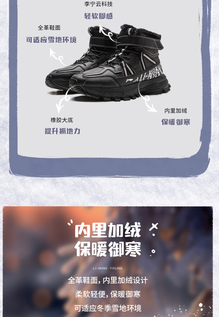 Li Ning children's shoes, children's cotton shoes, men's and women's warm 2 plus velvet warm shock-absorbing rebound high-top sports shoes YKCV172 silver birch gray/crown blue/black-35 34