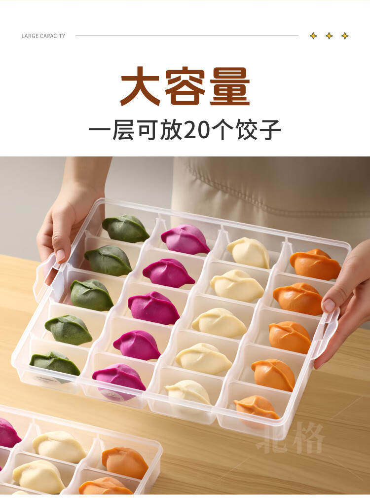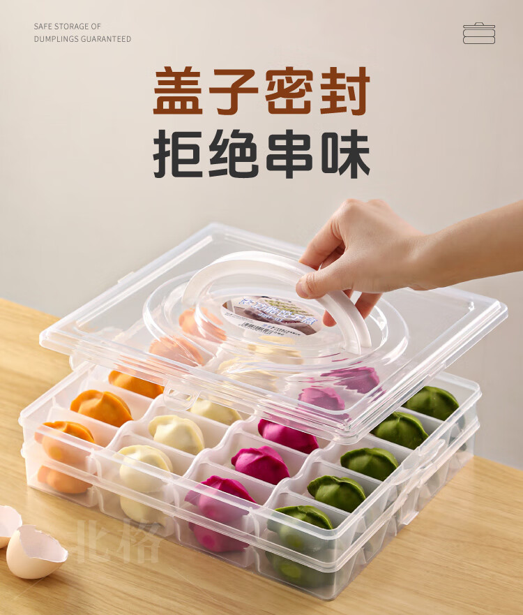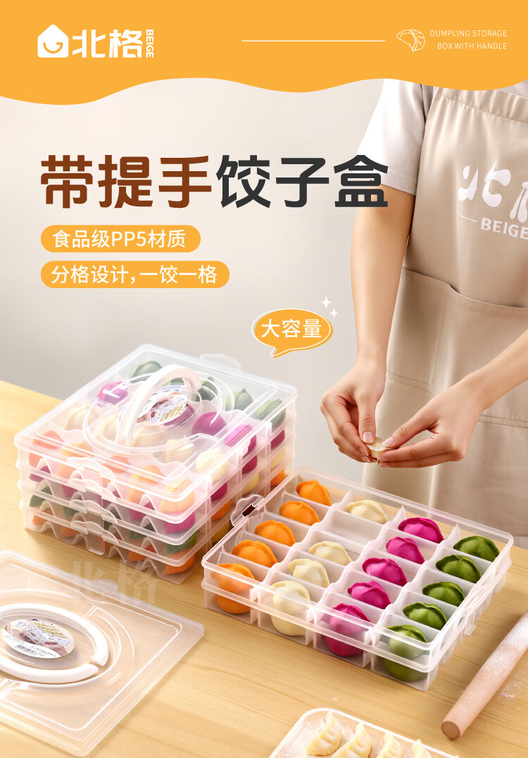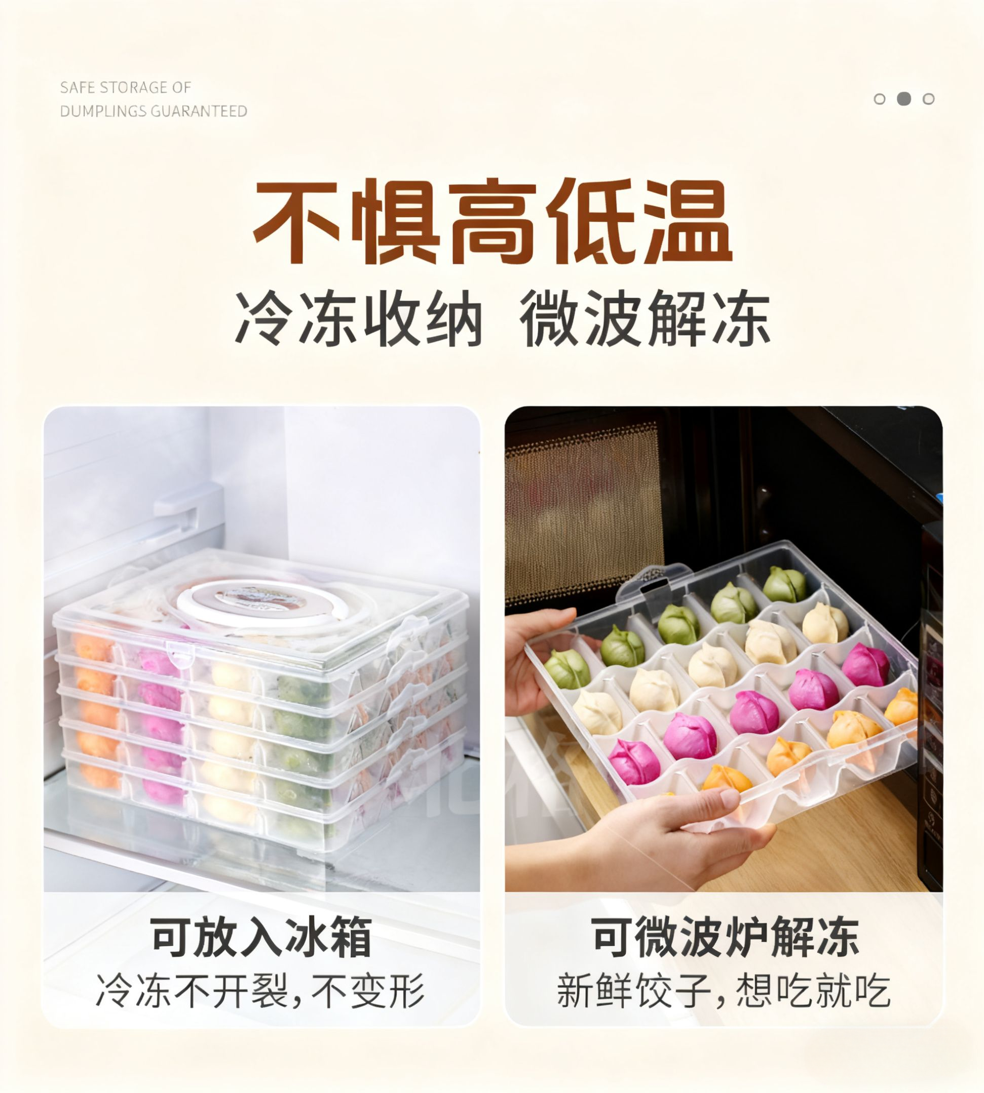 Beige dumpling storage box for refrigerator, frozen dumpling box, food-grade dumpling storage box, special tray for quick-frozen dumplings, pure white, 2 layers, two layers and one cover, upgraded with handle, 20 compartments on one layer