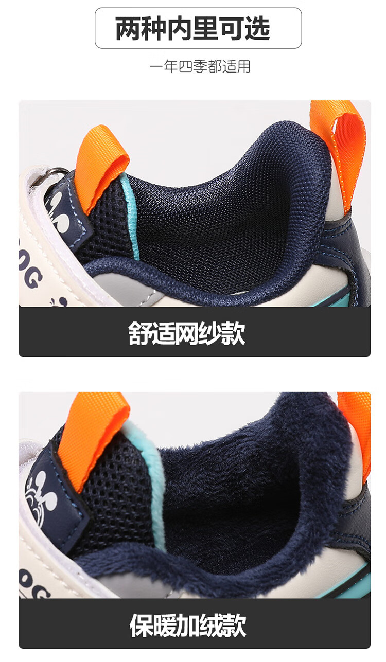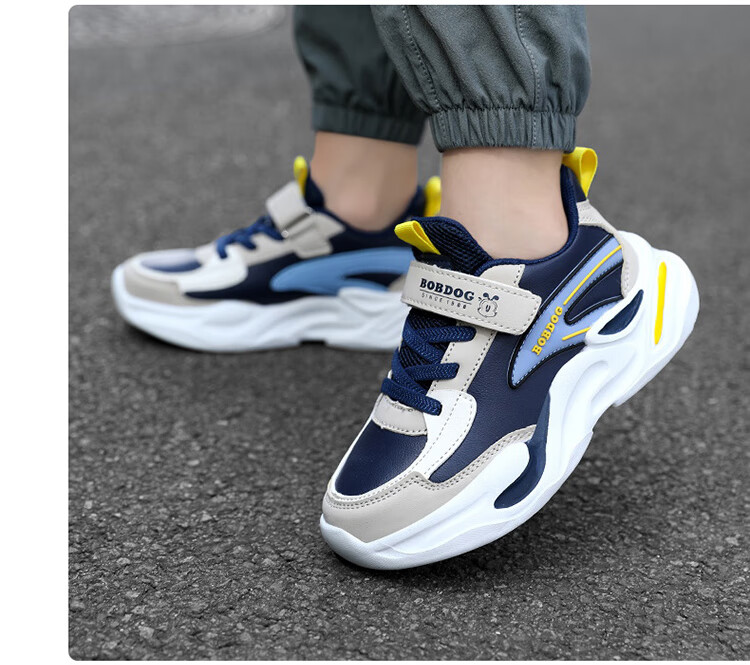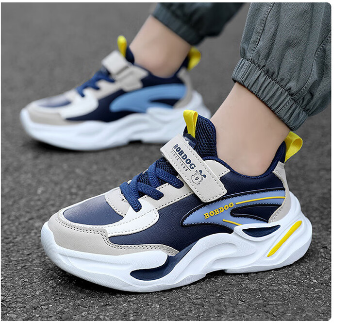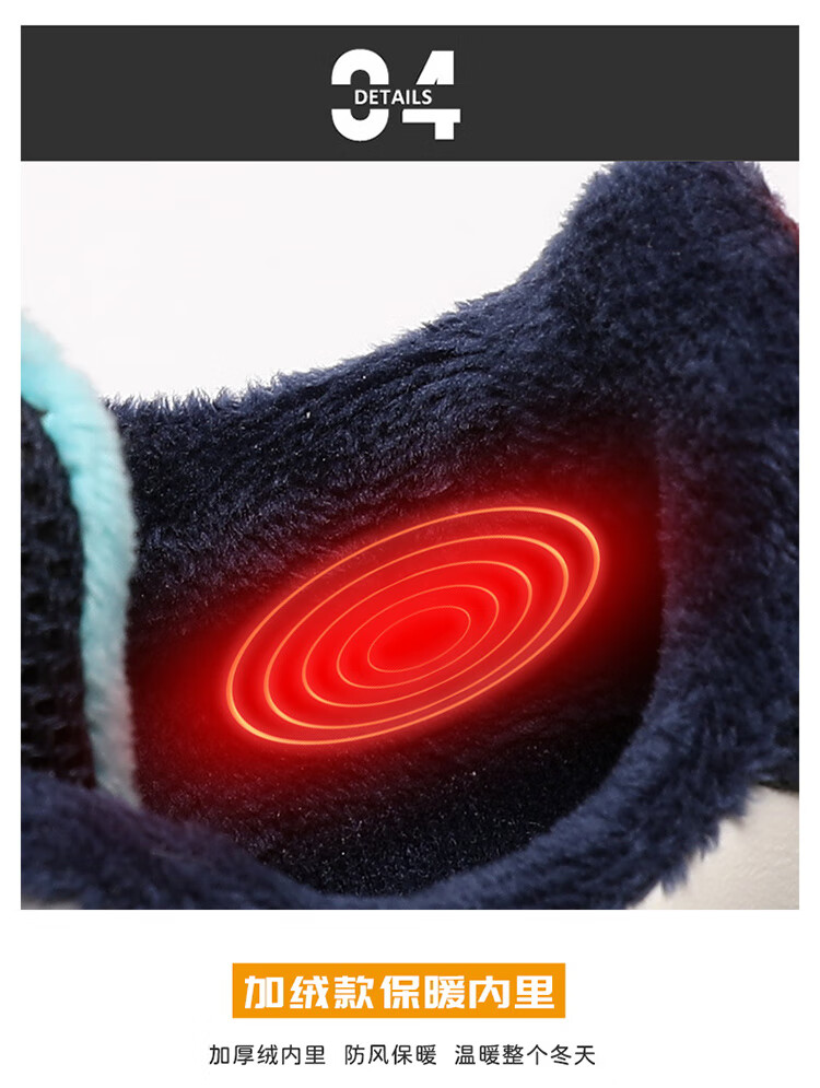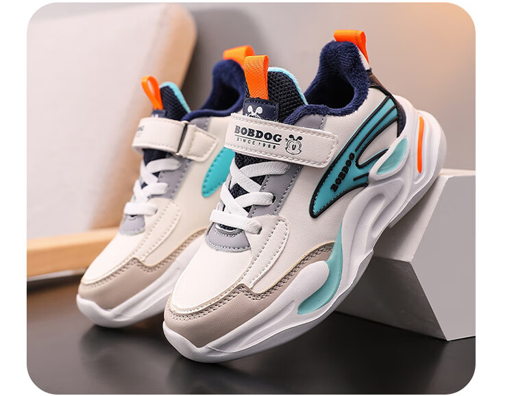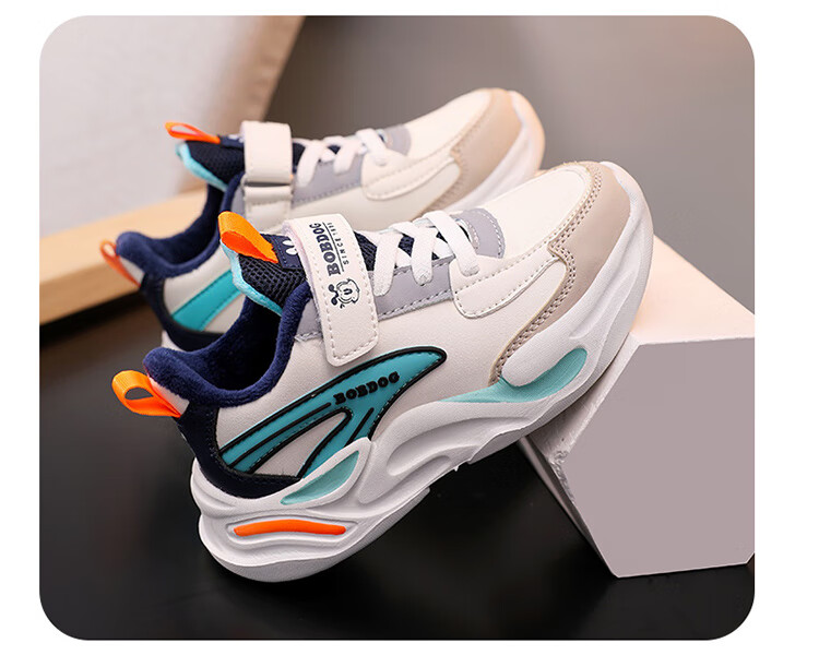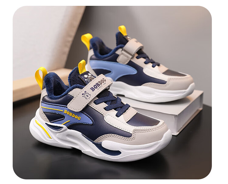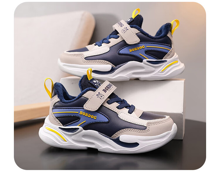 Babu Dou children's cotton shoes with velvet to keep warm in winter, boys and girls sports shoes, leather waterproof student running shoes, 2 cotton, dark blue, velvet in winter, 34 (inner length 22.0cm)