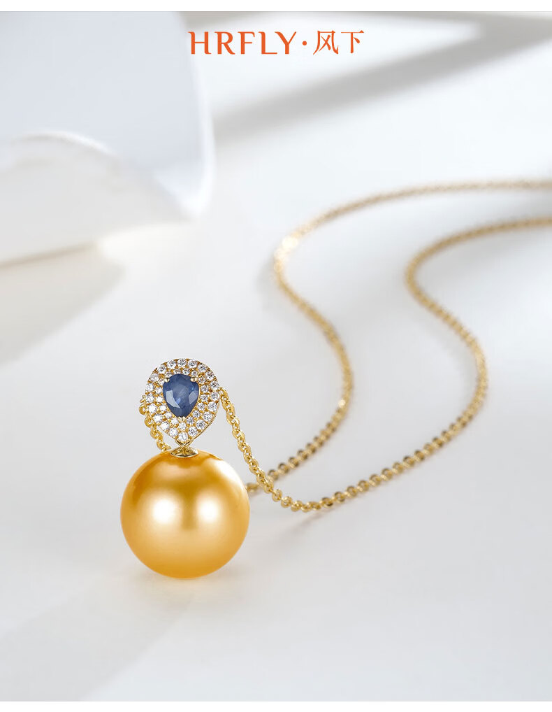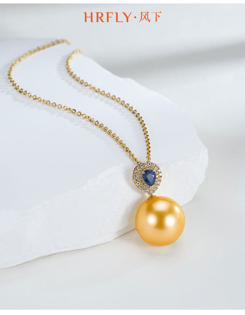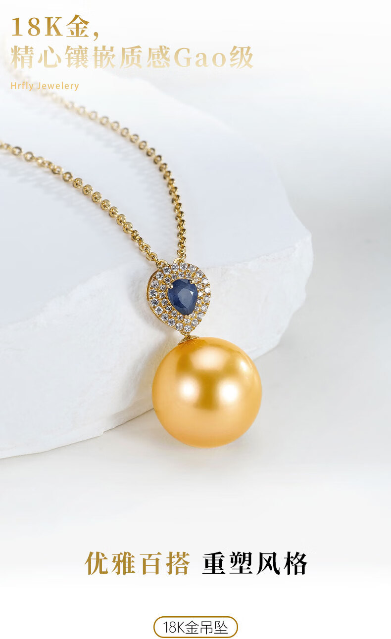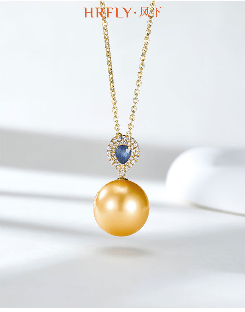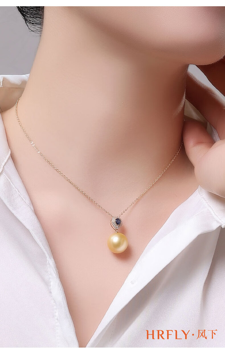 South Sea gold pearls and seawater pearl pendant under the wind 18K gold sapphire diamond pendant round strong light thick gold necklace 12-13mm