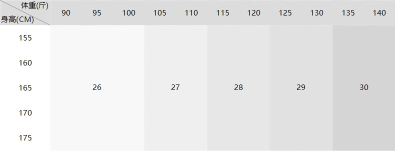 China (cm) 160-165/84-86 165-170 / 88-90 167-172 / 92-96 168-173 / 98-102 170-176 / 106-110