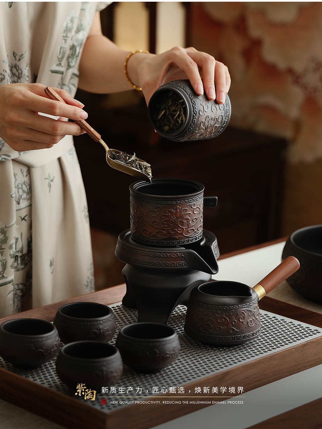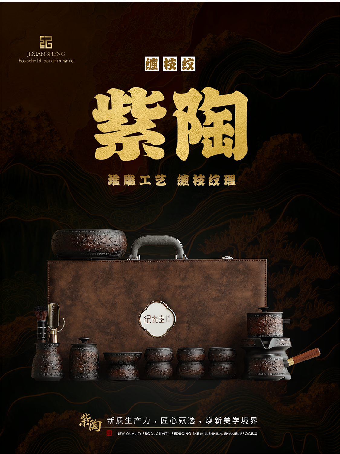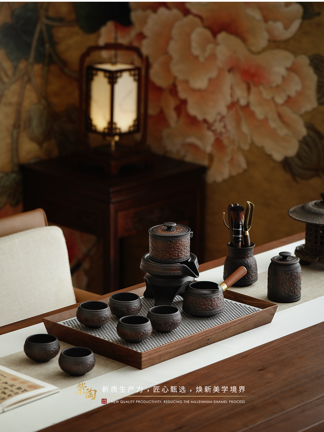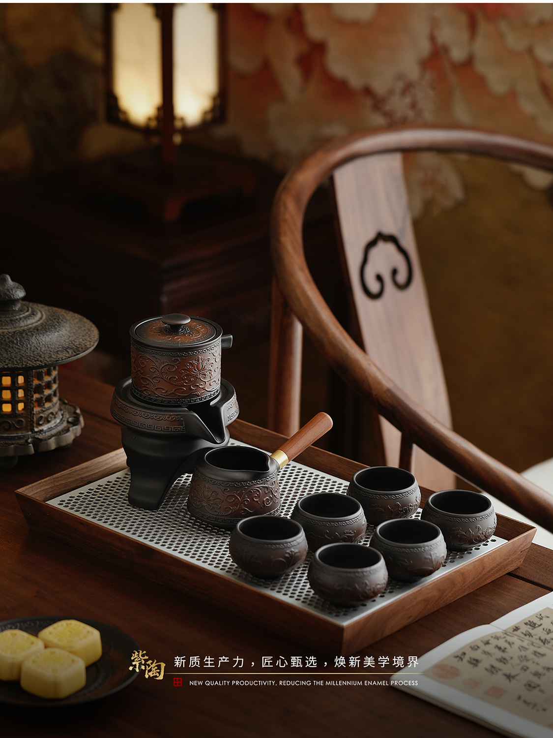 Mr. Ji's Dunhuang Forbidden City Purple Pottery Automatic Teapot, Teacup and Tea Set is a Mid-Autumn Festival birthday gift for the elders. 1. (Twinkle Pattern) Purple Pottery Automatic Set of 9 Pieces in Leather Box