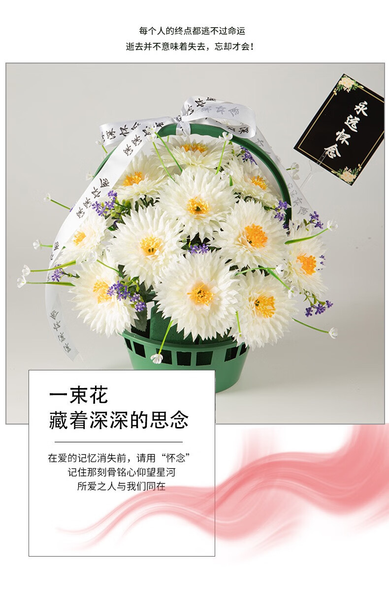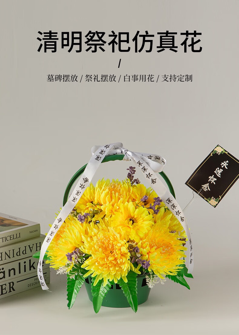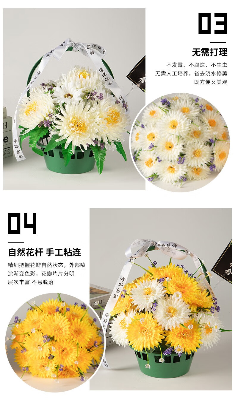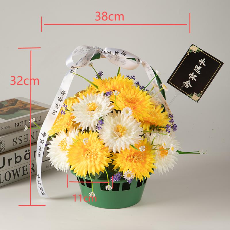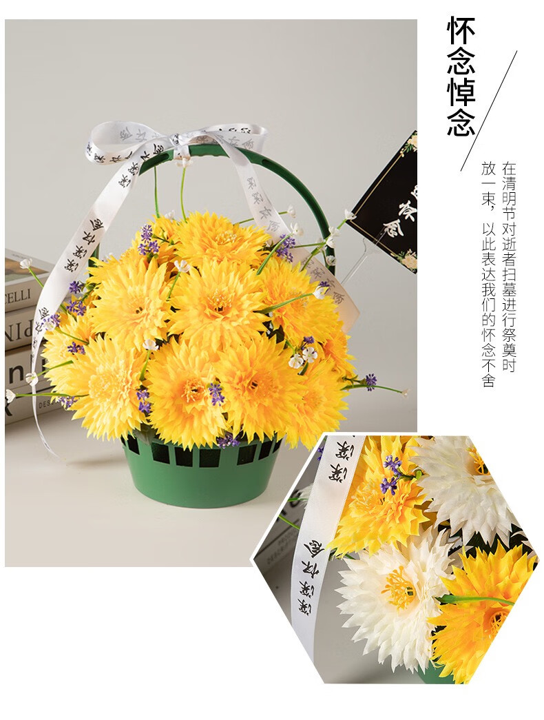 Jingga grave-sweeping fake flowers, Qingming flowers, simulated flowers, tombstones, chrysanthemum baskets, grave-going sacrificial supplies, 18-head flat chrysanthemum combination, 10-head silk chrysanthemum, flat chrysanthemum combination, hand bouquet + flower basket, yellow and white