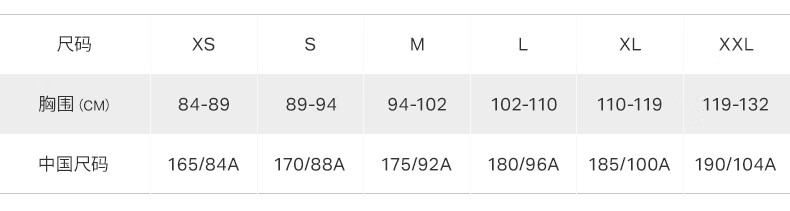 China (cm) 165 / 88-90 170 / 96-98 175 / 108-110 180 / 118-122 185 / 126-130