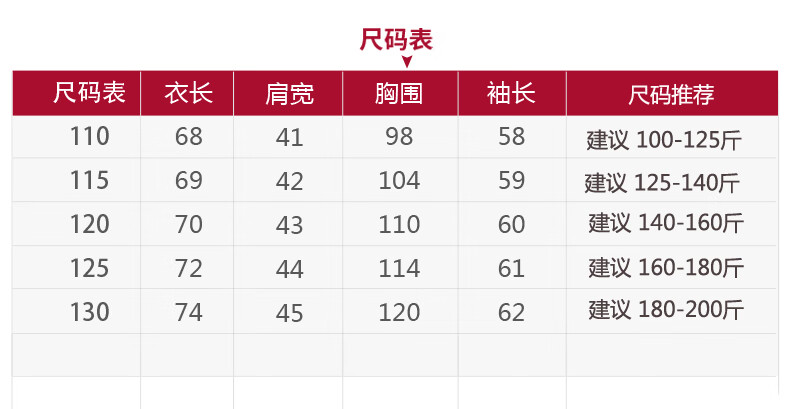 China (cm) 165 / 88-90 170 / 96-98 175 / 108-110 180 / 118-122 185 / 126-130